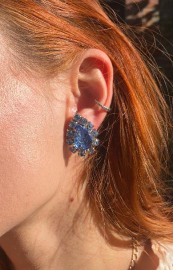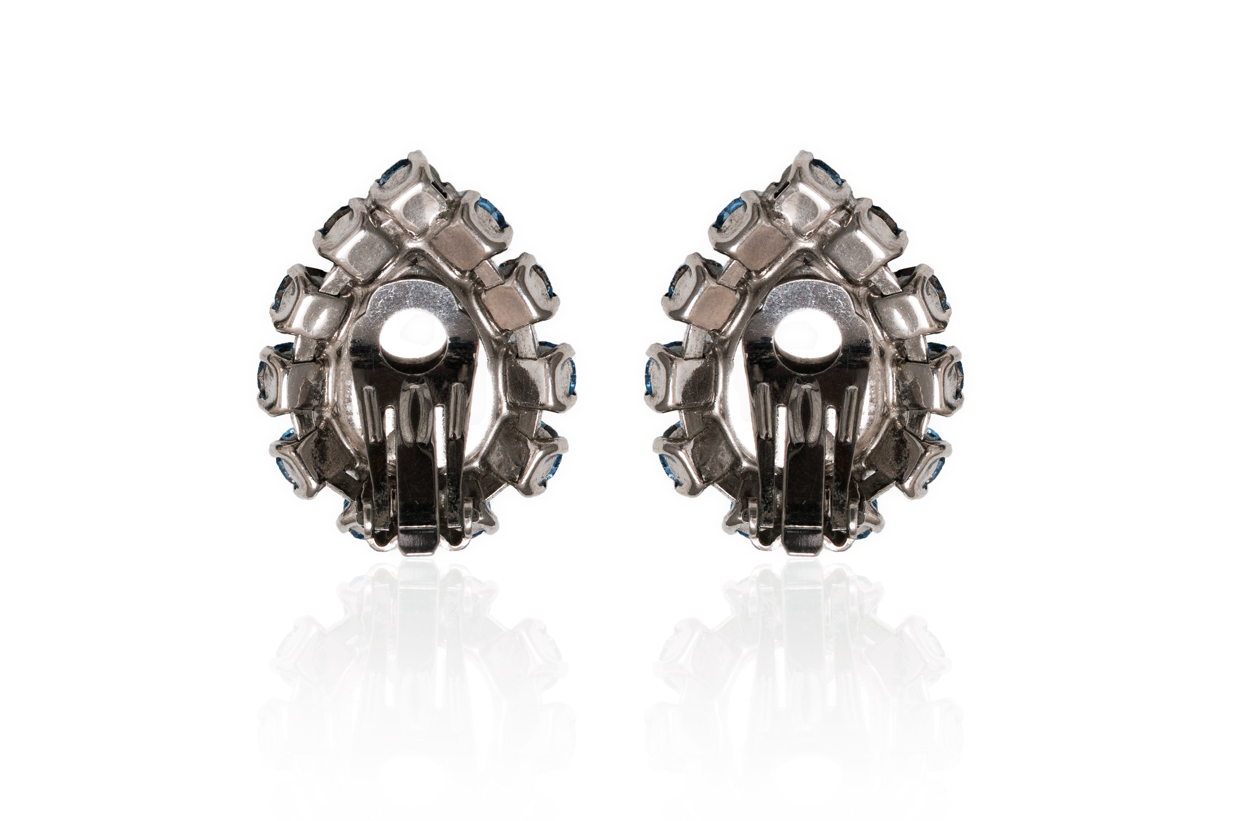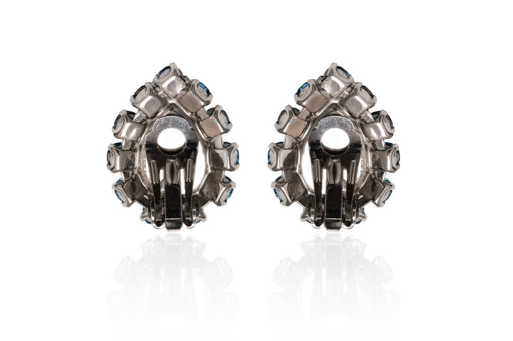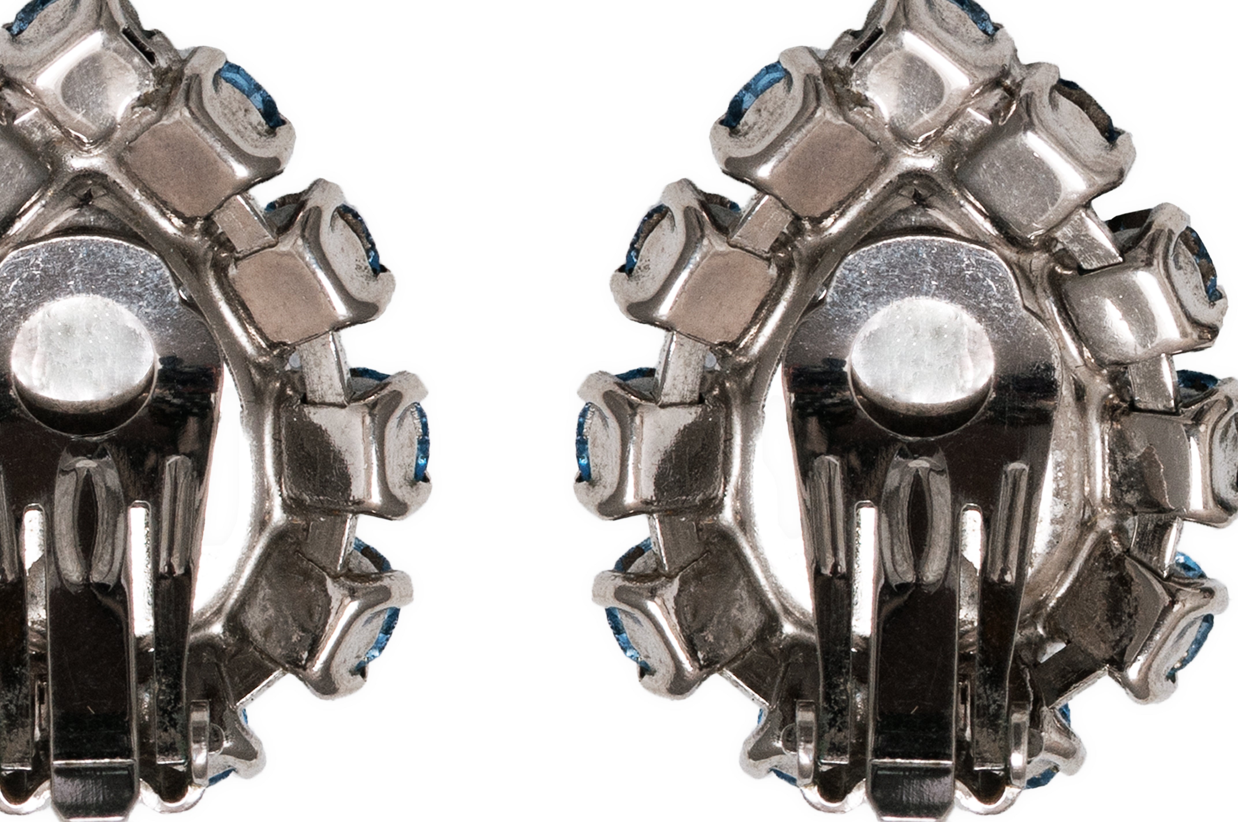 A very pretty pair of original 1950s clip-on earrings in the most wonderful bright blue tones. Each earring takes the form of single leaf formed from blue glass and surrounded by prong set diamante stones in a paler blue tone set into a base metal in a silver tone. The earrings are unmarked but of very good quality and are light and dainty. Undoubtedly made in America and of high end manufacture and design, this set is in excellent vintage condition.