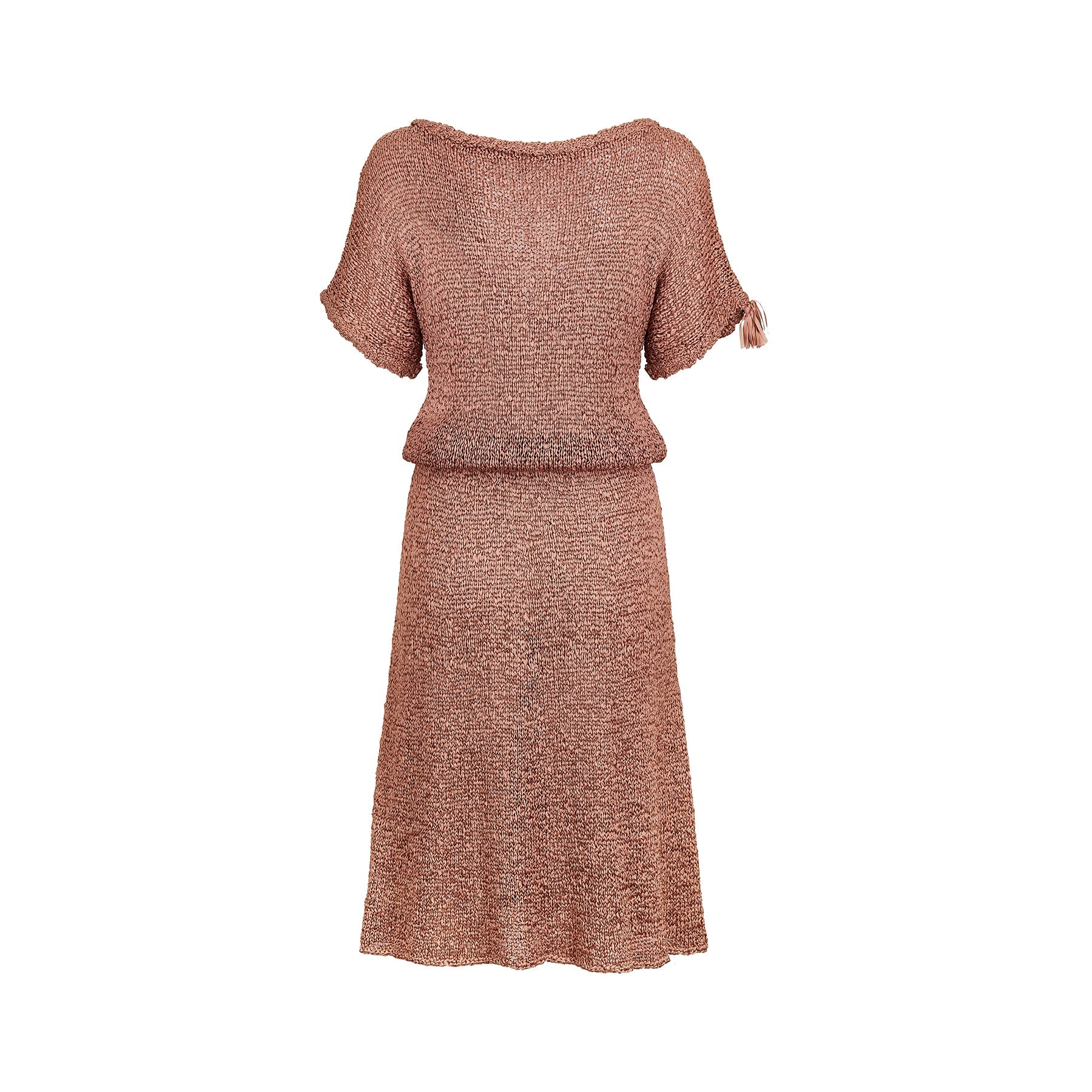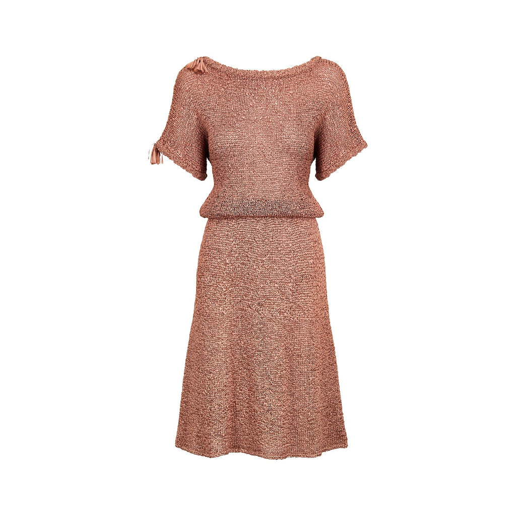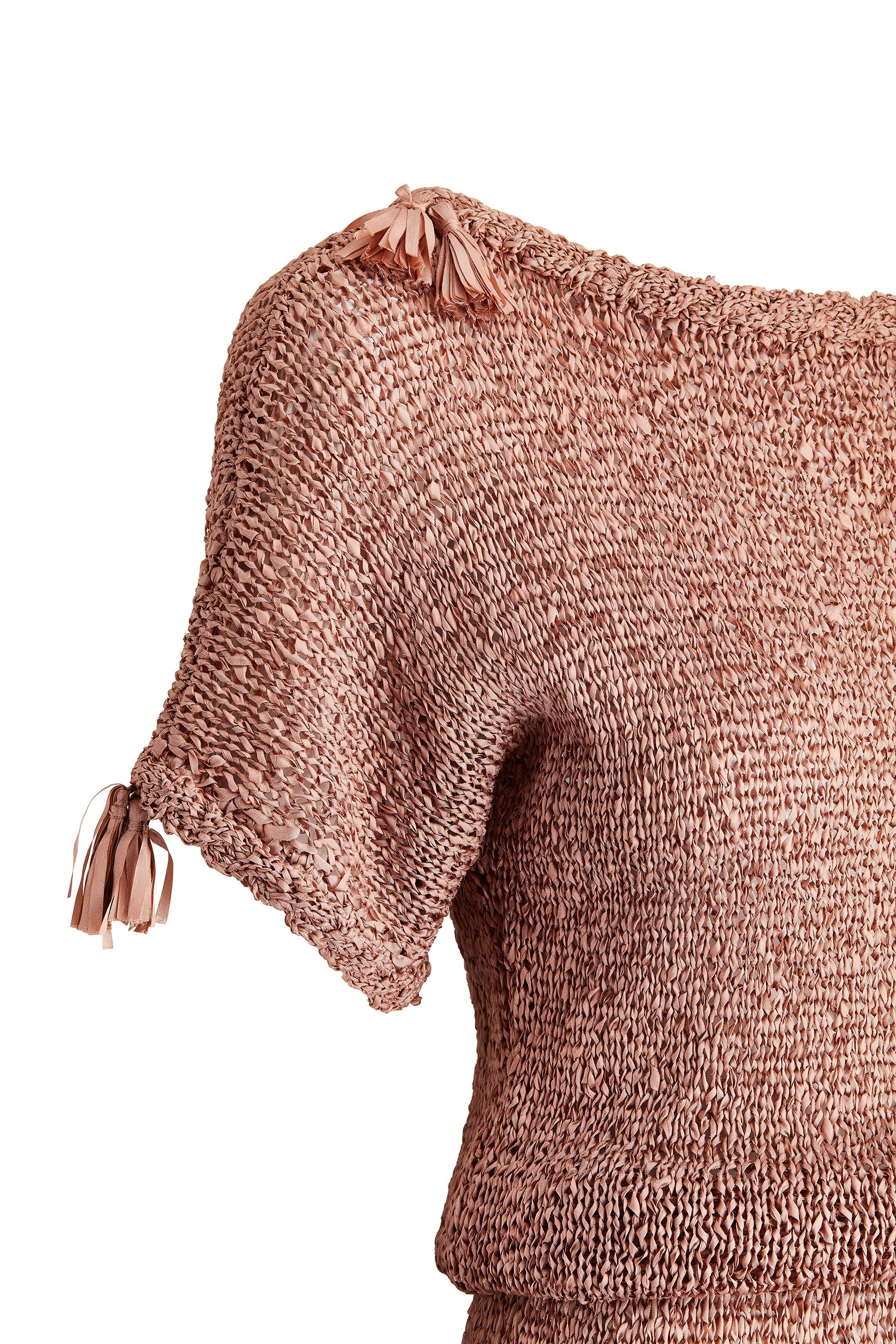 It's in really great vintage condition; there are no issues with the woven ribbon work. One of the sleeves has two little tassels whilst the other sleeve is without; we have left as is but you could easily transfer a tassel to the other side if desired. A simple design which looks very fresh and modern and can be dressed up or down as desired. There is quite a bit of stretch to the knitted ribbon so we advise wearing with a nude slip; will fit a range of sizes up to around a UK 12 or US 8.