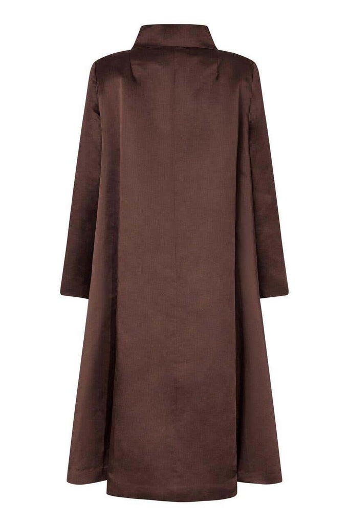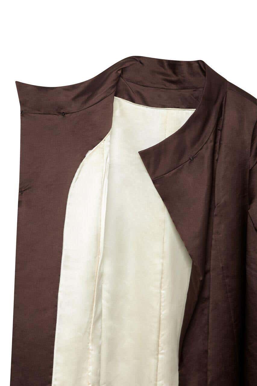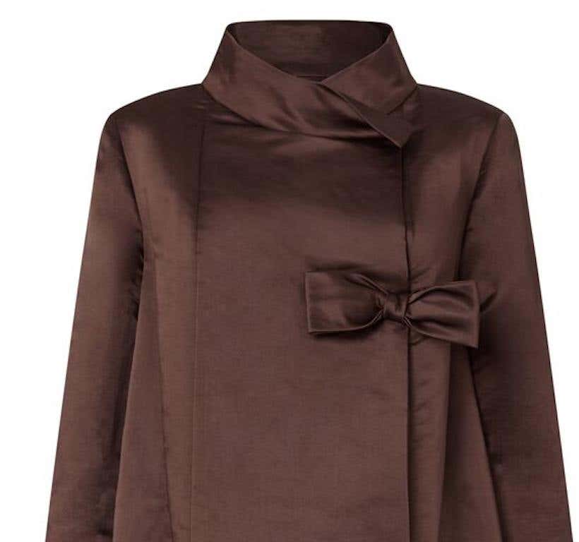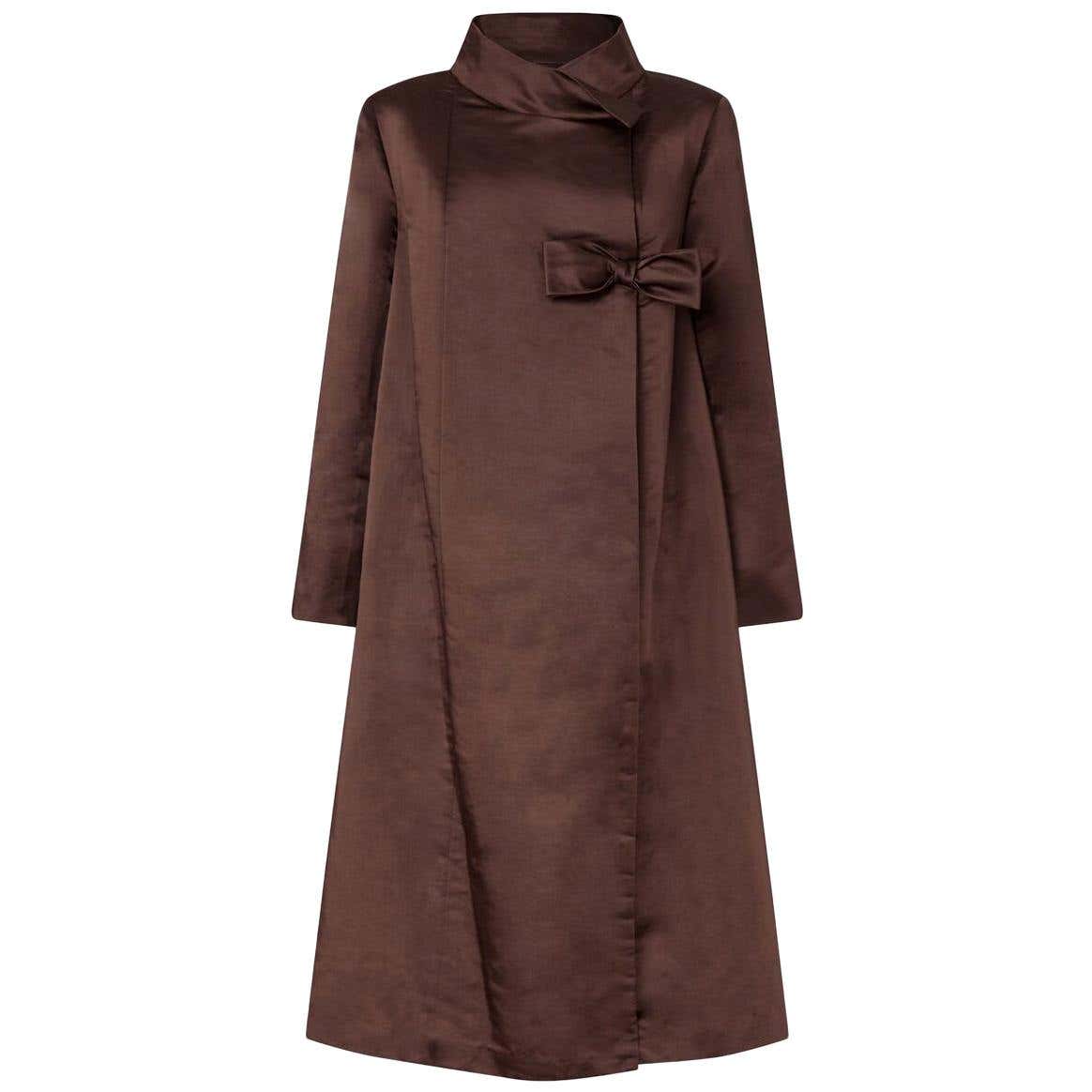 This stylish 1950s chocolate brown silk swing coat is smart, chic and in beautiful vintage condition. A high round neckline and neatly tailored shoulders give way to a luxurious volume of rich brown fabric flaring out from beneath the bust. The generosity of the cut allows an elegant movement when worn. The front fastens over from right to left and is secured with concealed hook eye fastenings. An attractive bow feature in place just below the bust to the front left, completing the aesthetic. The coat is deceptively warm, and is lined throughout with a quilted cream satin fabric. This piece is wonderfully adaptable and would compliment both formal, evening and informal daywear. There is no label and therefore we are unable to confirm the designer, although it is unquestionably high quality original 1950s vintage. Would best suit up to a US size 6, UK size 10 although there is give in the waist and hip.