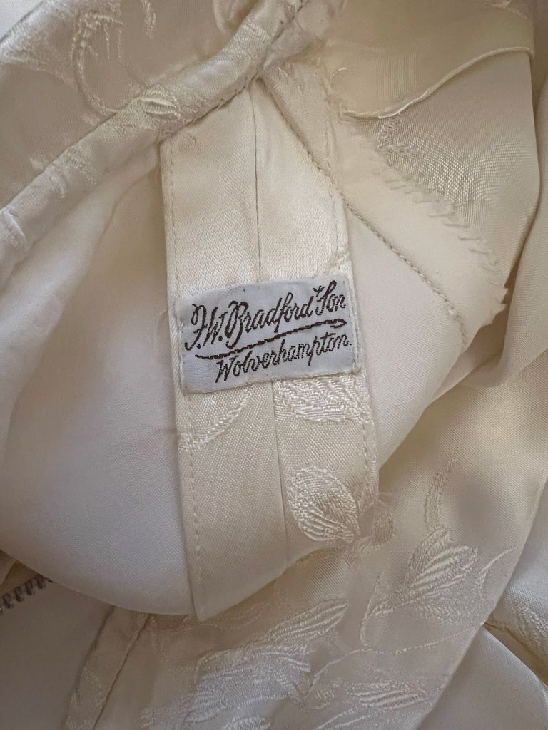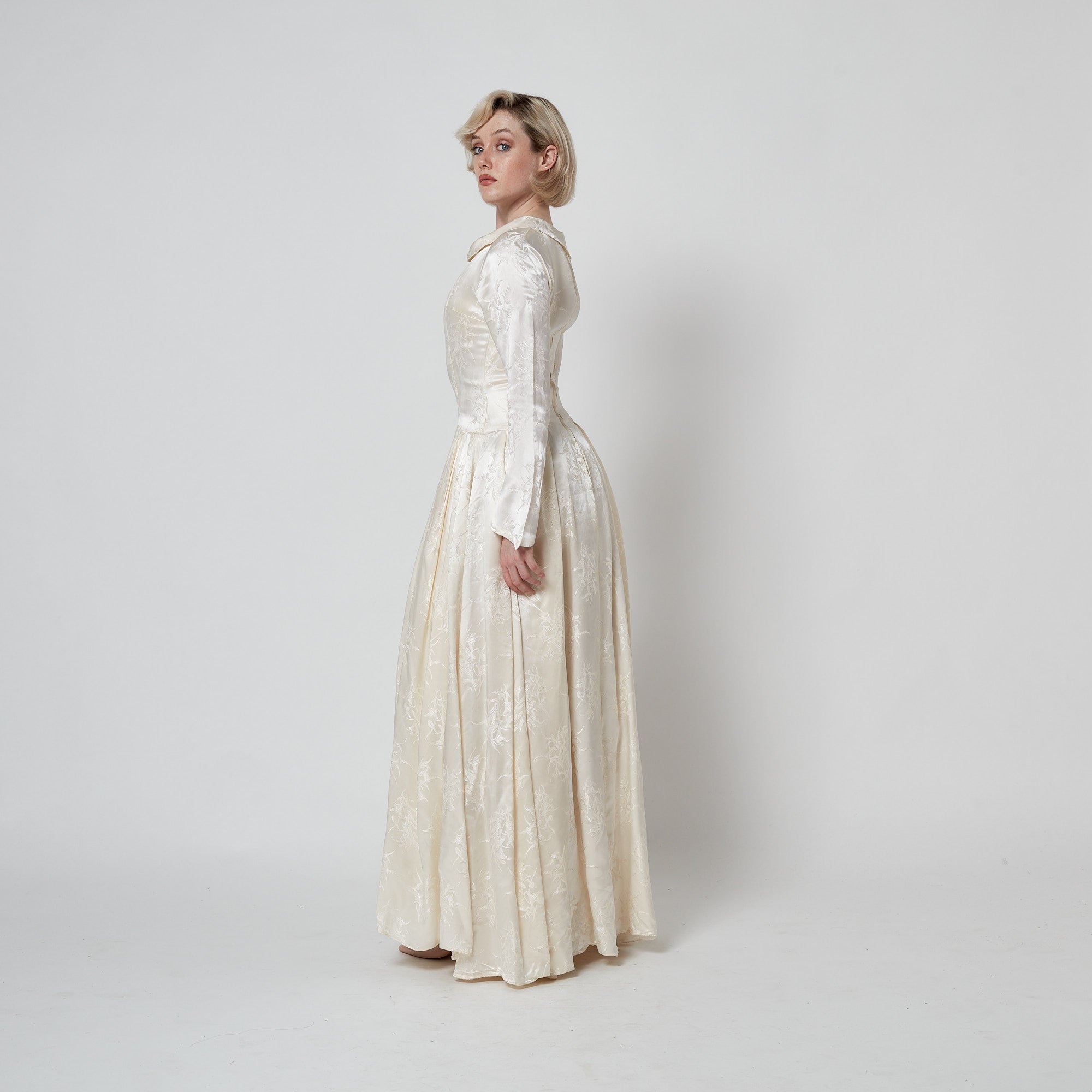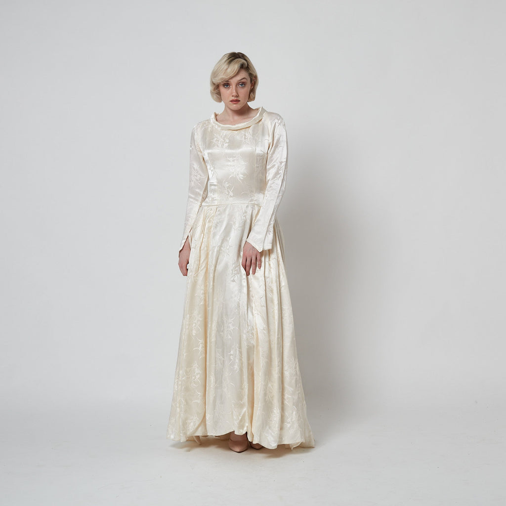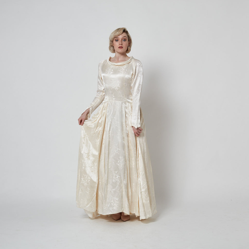 This true vintage 1950s wedding dress is crafted from a detailed jacquard in a rich creamy off-white hue. Tailored to a classic ‘50s silhouette with a nipped-in waist and full skirt which swirls around the legs and finishes around ankle length. The waistline is slightly dropped and so the band sits just above the hips and the skirt has a few soft pleats on each hip where it greets the top. The fabric has a subtle sheen, the intricately woven detail of the jacquard florals and leaves is emphasised as they catch the light. Inside, the fabric is backed by muslin cotton and an additional knee-length petticoat tailored from layers of stiff mesh tulle that holds its shape and adds volume to the skirt. A graceful high neckline is formed from a fold of coordinating cloth and finishes at the back of the neck in a pointed collar. The long-sleeves add elegance to this lovely gown, and have pointed cuffs that fall lightly over the back of the hand. This dress fastens at the rear with a hidden tonal zip and hook-and-eye clasp. It is very slightly longer at the back than the front.