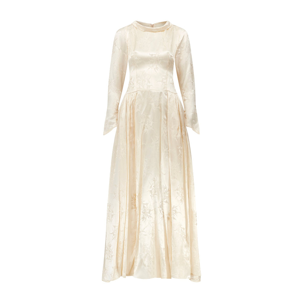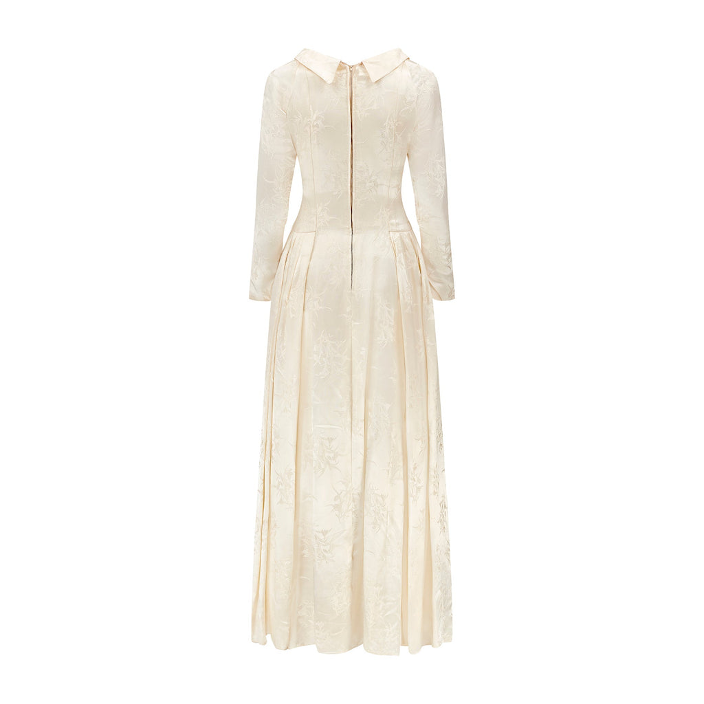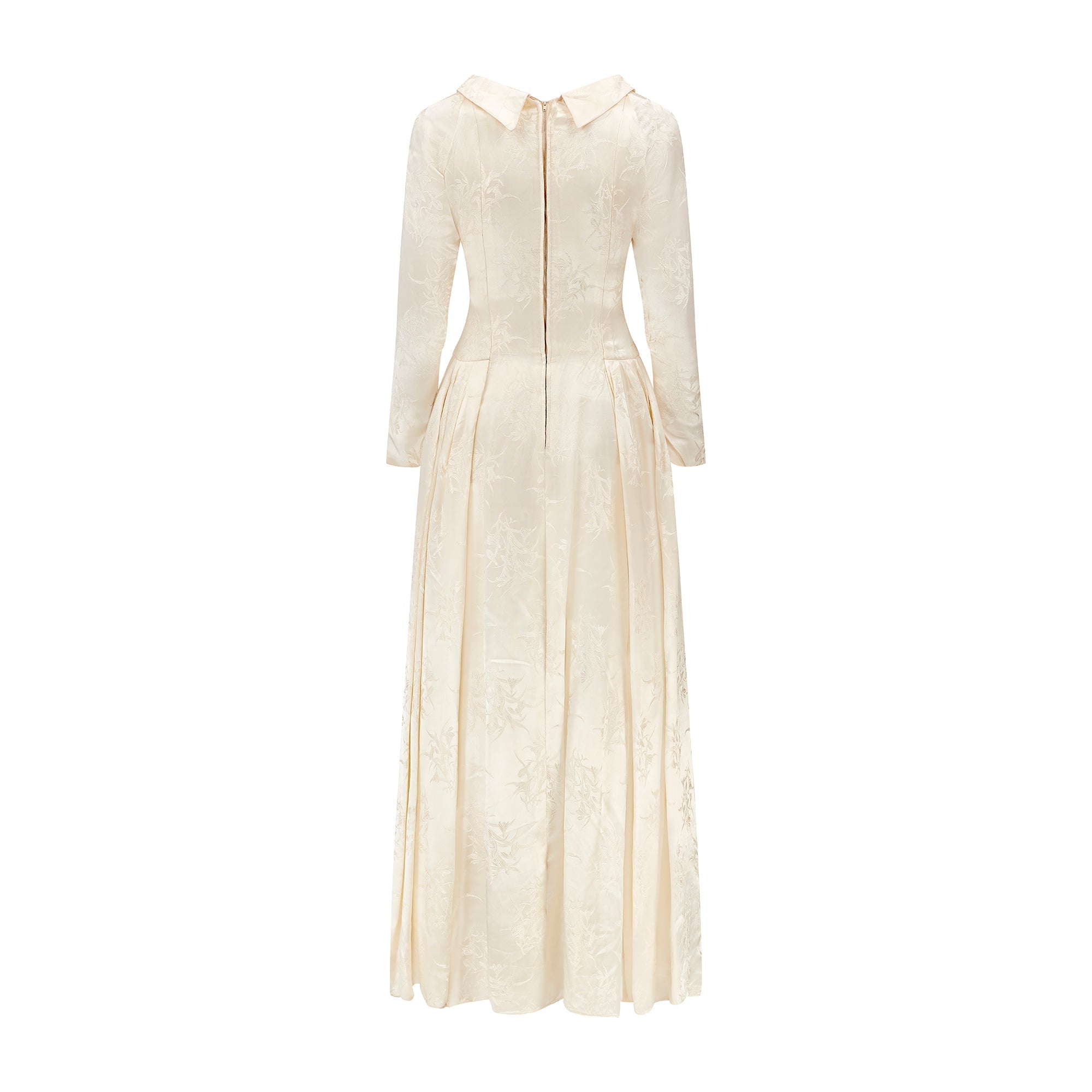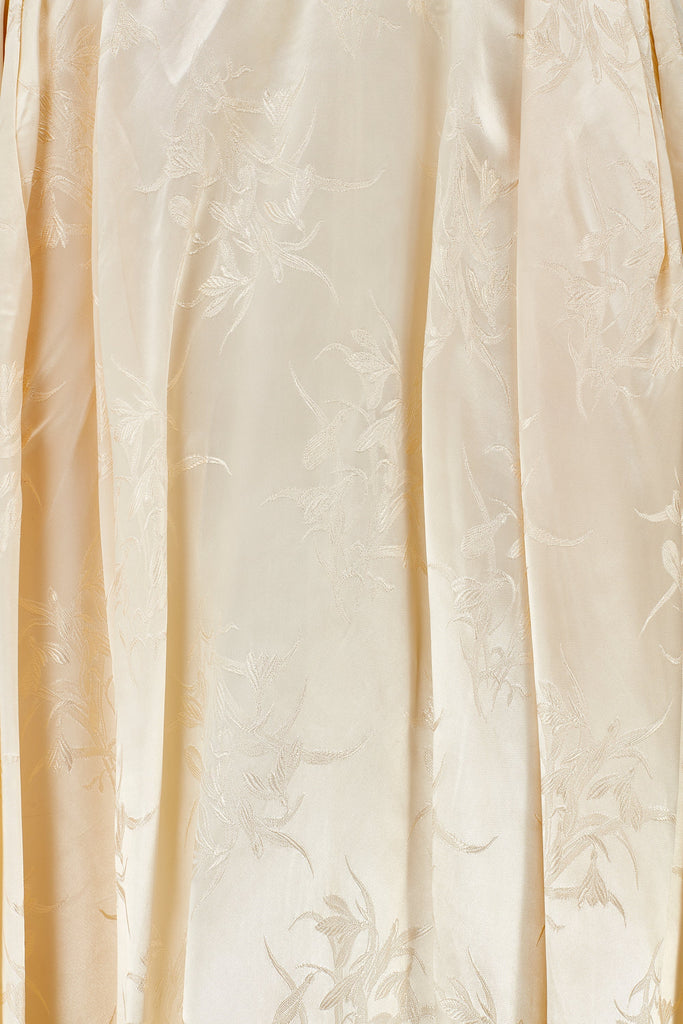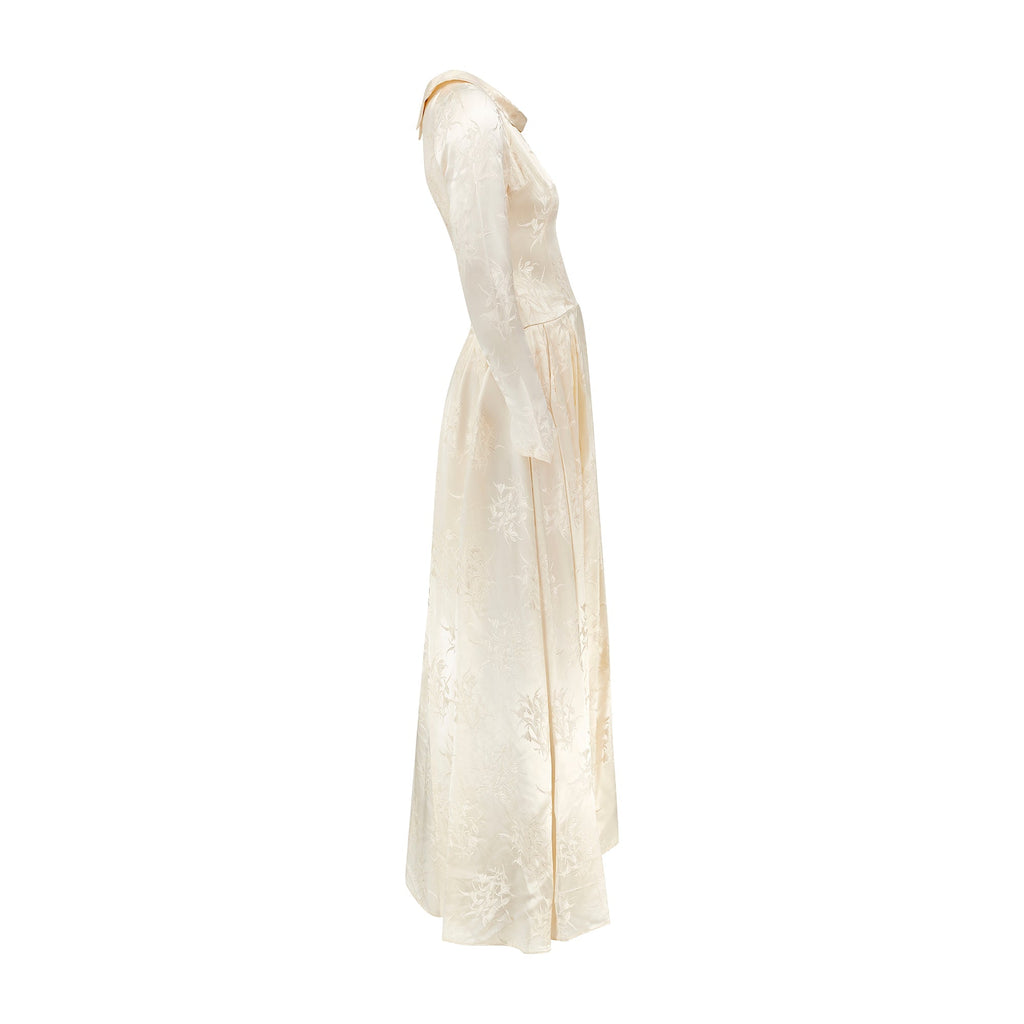 This true vintage 1950s wedding dress is crafted from a detailed jacquard in a rich creamy off-white hue. Tailored to a classic ‘50s silhouette with a nipped-in waist and full skirt which swirls around the legs and finishes around ankle length. The waistline is slightly dropped and so the band sits just above the hips and the skirt has a few soft pleats on each hip where it greets the top. The fabric has a subtle sheen, the intricately woven detail of the jacquard florals and leaves is emphasised as they catch the light. Inside, the fabric is backed by muslin cotton and an additional knee-length petticoat tailored from layers of stiff mesh tulle that holds its shape and adds volume to the skirt. A graceful high neckline is formed from a fold of coordinating cloth and finishes at the back of the neck in a pointed collar. The long-sleeves add elegance to this lovely gown, and have pointed cuffs that fall lightly over the back of the hand. This dress fastens at the rear with a hidden tonal zip and hook-and-eye clasp. It is very slightly longer at the back than the front.