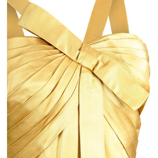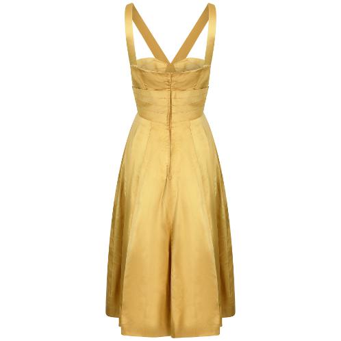 1950s gold satin cocktail dress With pleated bodice. A highly desirable original 1950s gold silk satin cocktail dress in very good vintage condition. The fabric is a beautiful gold colored silk satin and the dress features a beautifully pleated bodice with an asymmetric bow with long ribbons that fall below the waist line. The unusual straps begin at the front of the pleated bodice and arrive on the shoulders to form vertical straps. The skirt is made up of aligned panels which flare and give the dress body and shape.
