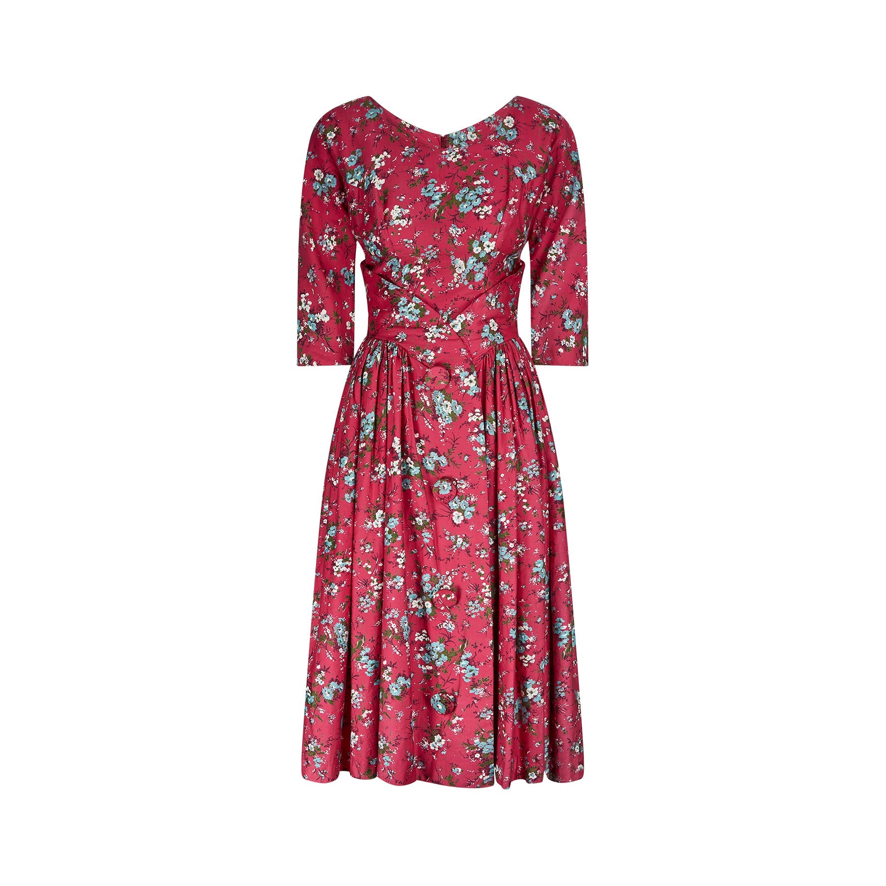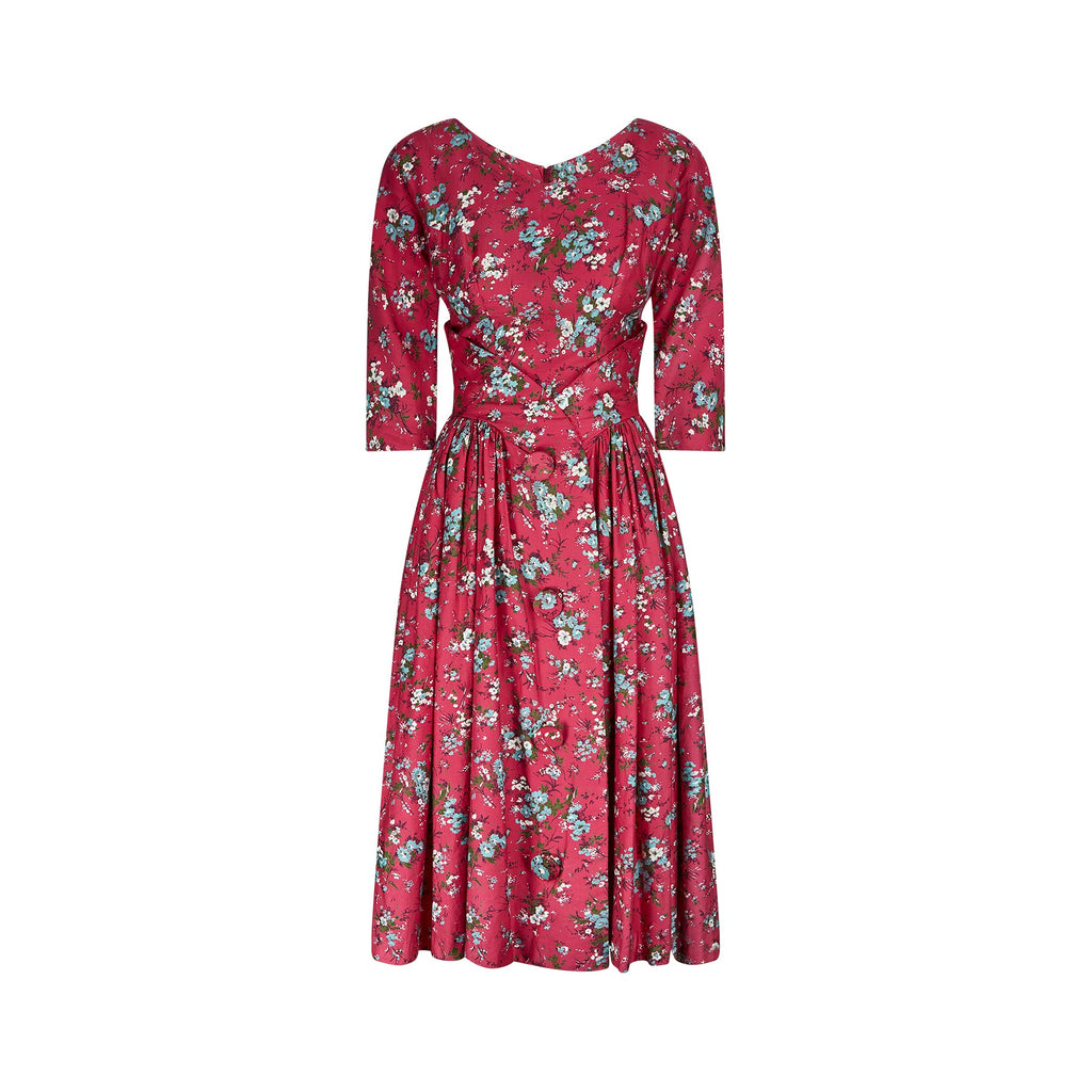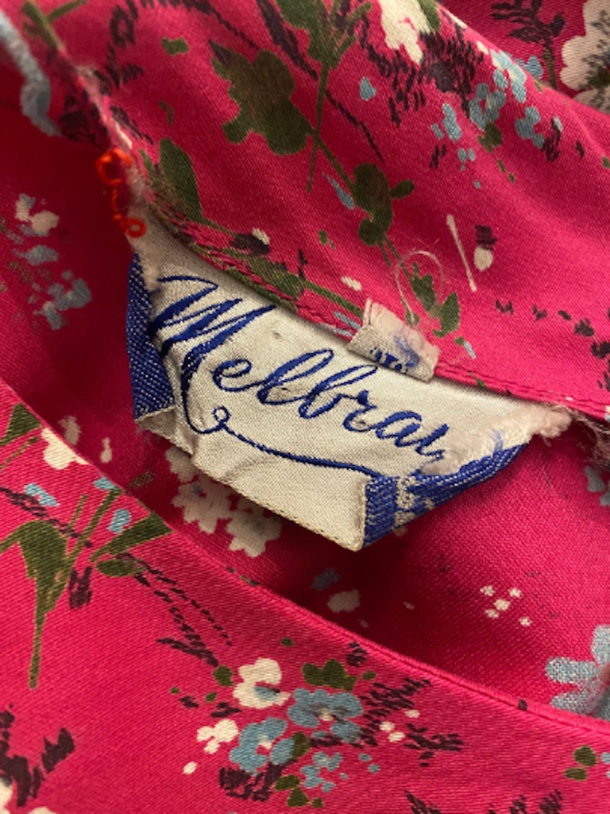 Original 1950s dress from quality British label, Melbray, in a wonderful deep cerise polished cotton. The floral print looks like forget me nots in a brilliant turquoise and white which contrasts beautifully with the pink background. This dress has lots of interesting design details including a really special v shaped waistband which continues to form a wrapped skirt held together by four large fabric covered buttons to the front. The waist itself is gathered but hidden under the waistband and the dress also features Princess seams on the bodice and delightful bracelet length sleeves. In beautiful vintage condition with no issues of any note, this is simply exquisite fashion from the era and a best fir for up to a UK 8-10 or US 4.