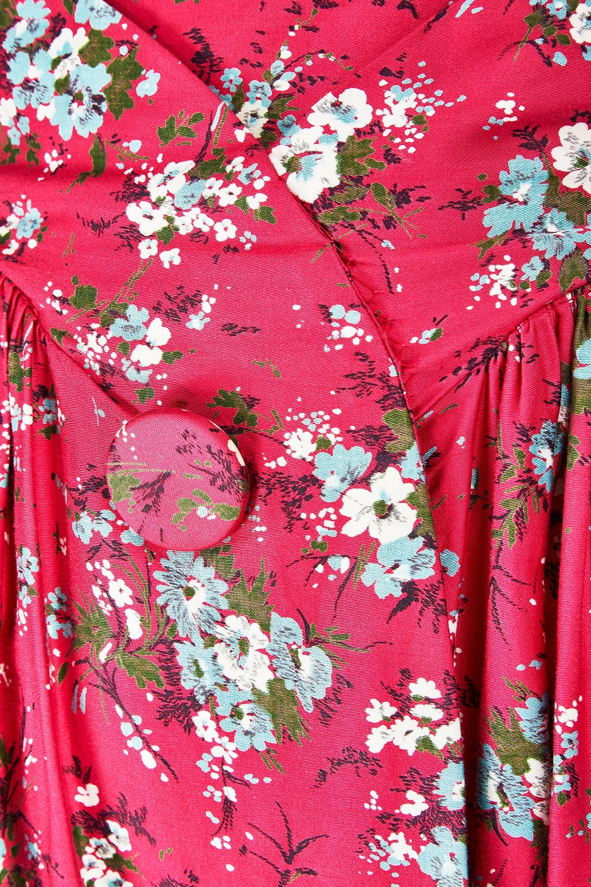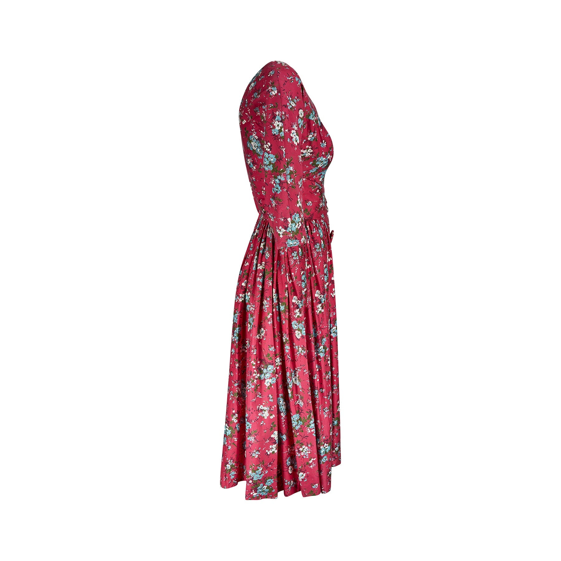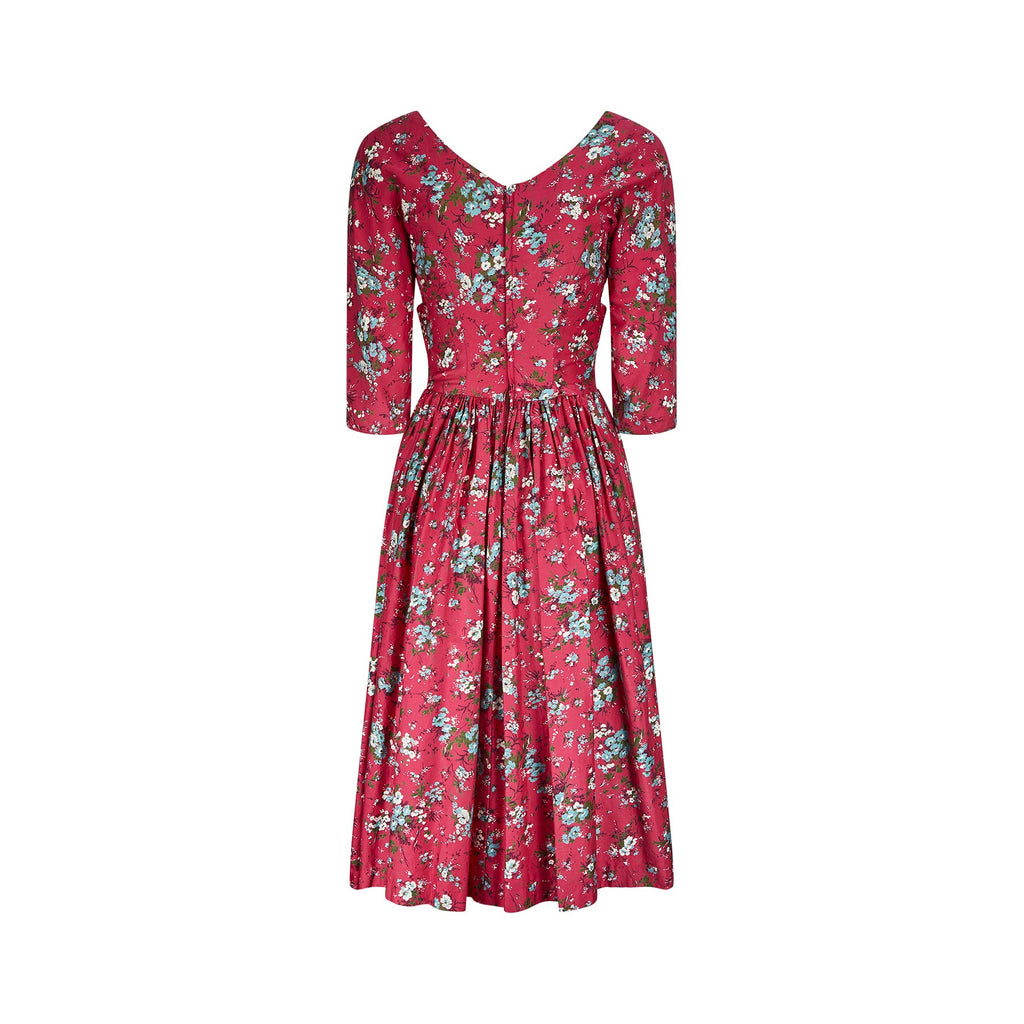 Original 1950s dress from quality British label, Melbray, in a wonderful deep cerise polished cotton. The floral print looks like forget me nots in a brilliant turquoise and white which contrasts beautifully with the pink background. This dress has lots of interesting design details including a really special v shaped waistband which continues to form a wrapped skirt held together by four large fabric covered buttons to the front. The waist itself is gathered but hidden under the waistband and the dress also features Princess seams on the bodice and delightful bracelet length sleeves. In beautiful vintage condition with no issues of any note, this is simply exquisite fashion from the era and a best fir for up to a UK 8-10 or US 4.