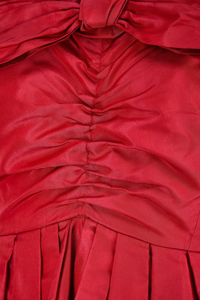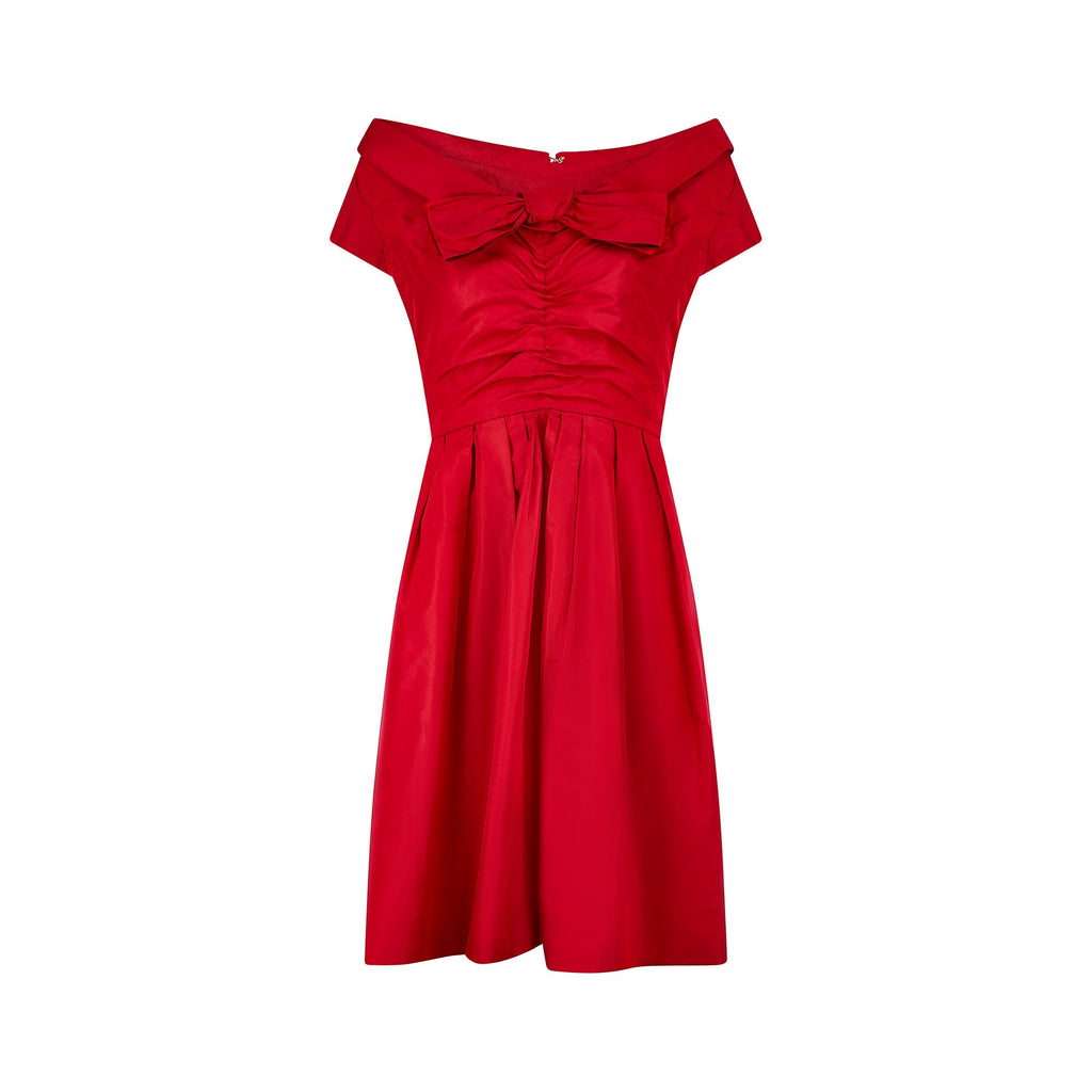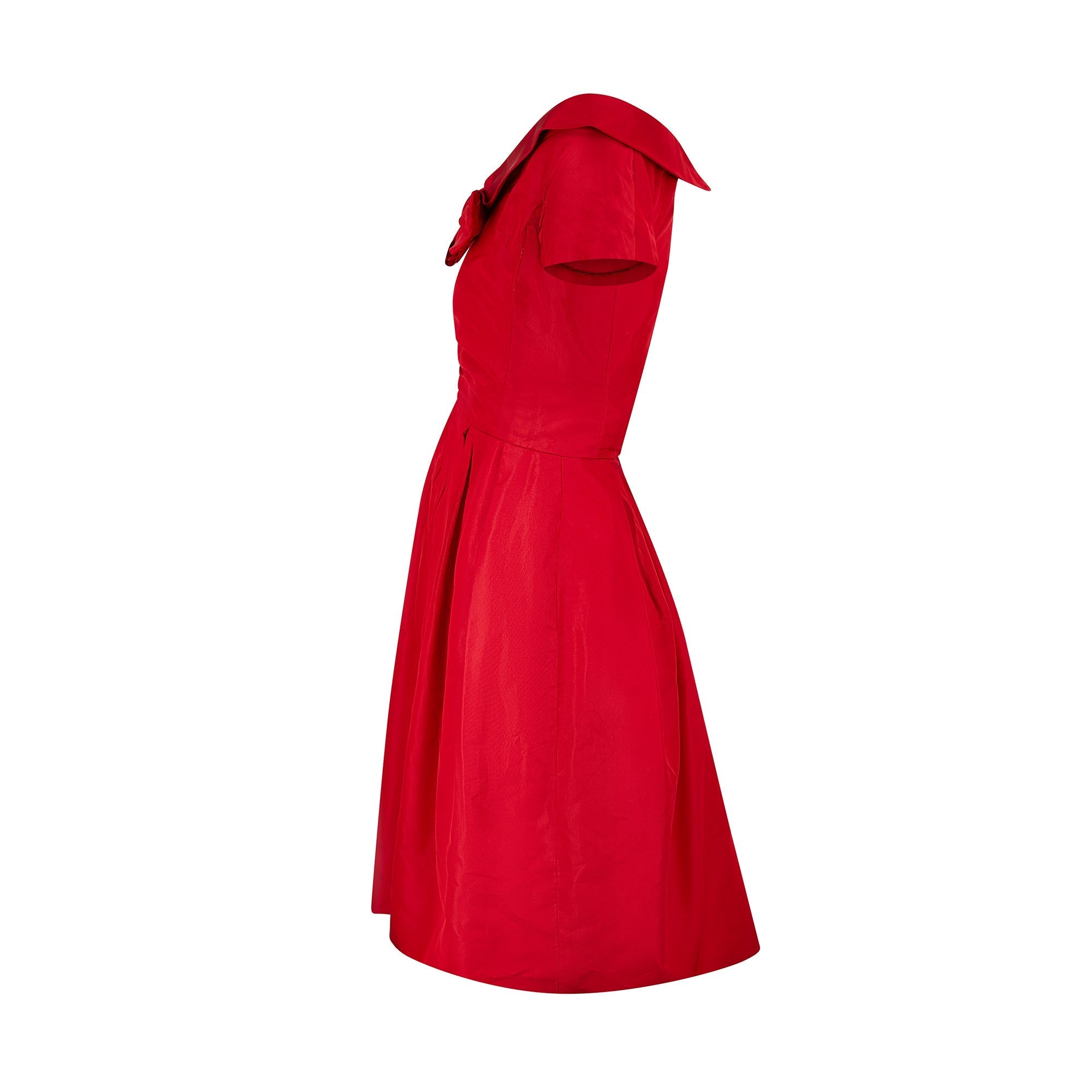 This colour-block red silk cocktail dress was manufactured in America in the mid-1950s. The off-the-shoulder tailoring adds a playfully sensuous detail, whilst the cap-sleeves, cinched waist and pleated full skirt are trademarks of the era. The taffeta crimson silk has a lovely thick texture and supports the structured style of the dress. The flamboyant bow and collared neckline give way to ruched fabric at the waist. Lined in silk organza and closes with a hidden central zip to the rear. Although unlabelled, the dress is excellent quality and probably made for a high-end US department store. Photographed and modelled without under skirts but these could be added for a more dramatic effect.