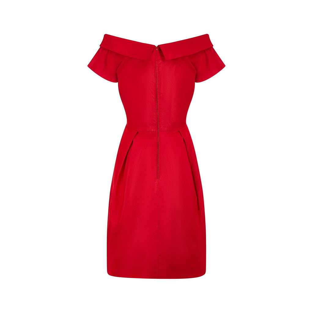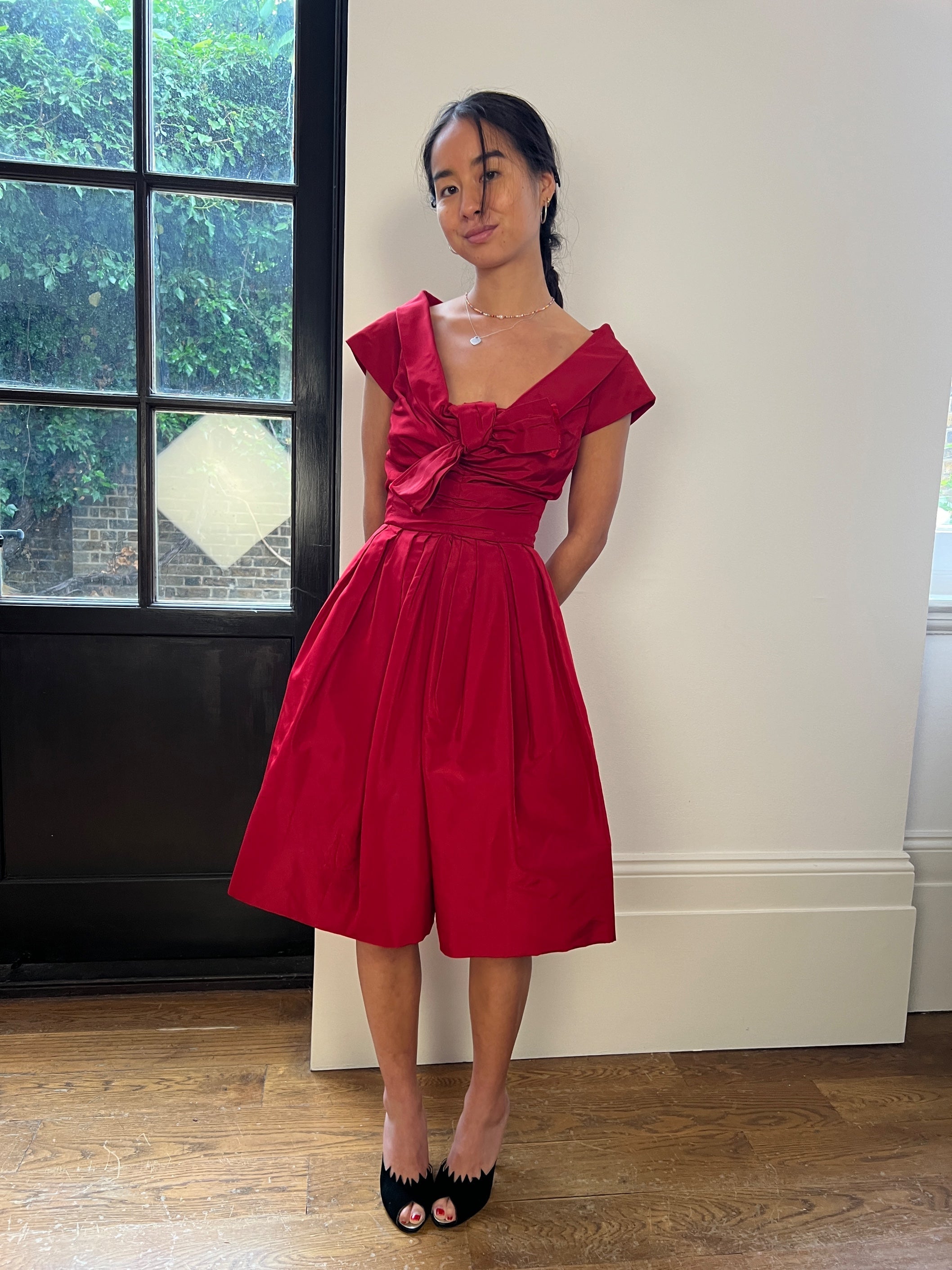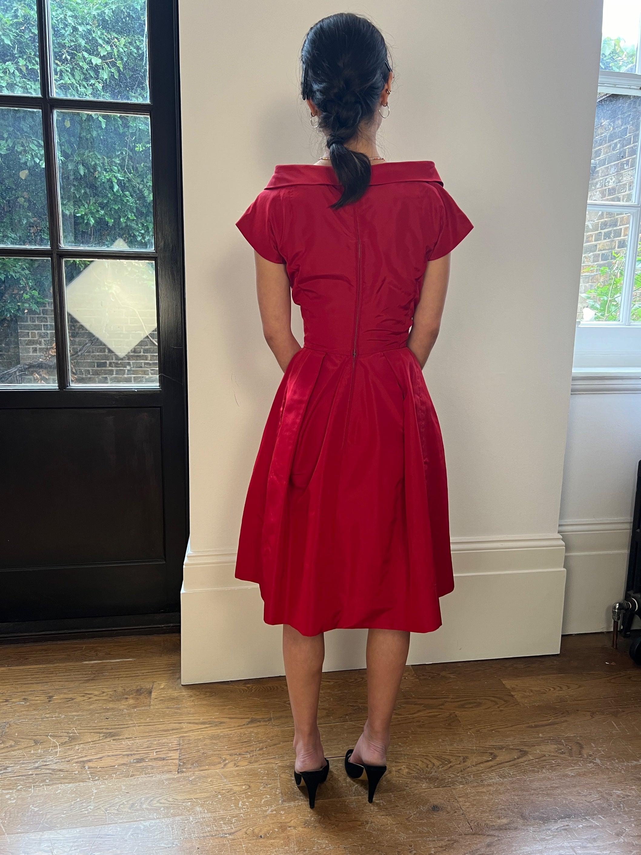 This colour-block red silk cocktail dress was manufactured in America in the mid-1950s. The off-the-shoulder tailoring adds a playfully sensuous detail, whilst the cap-sleeves, cinched waist and pleated full skirt are trademarks of the era. The taffeta crimson silk has a lovely thick texture and supports the structured style of the dress. The flamboyant bow and collared neckline give way to ruched fabric at the waist. Lined in silk organza and closes with a hidden central zip to the rear. Although unlabelled, the dress is excellent quality and probably made for a high-end US department store. Photographed and modelled without under skirts but these could be added for a more dramatic effect.