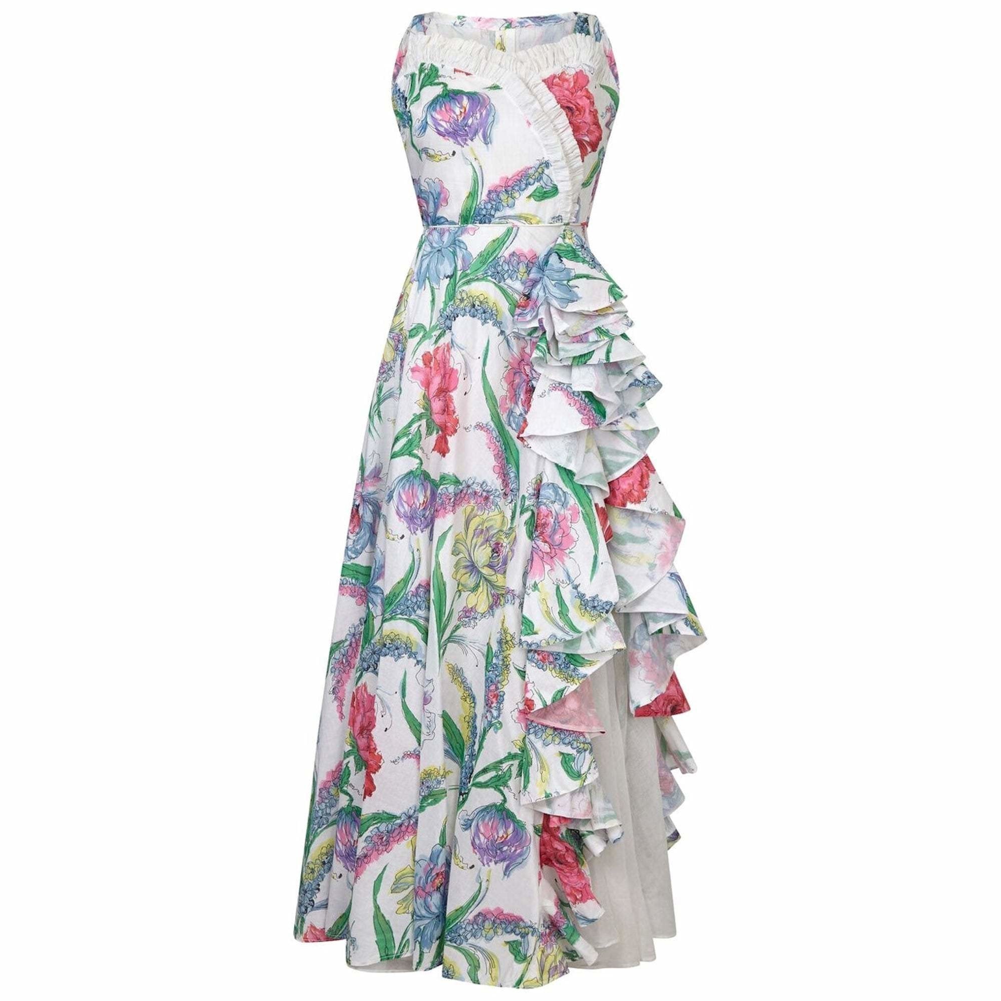 This sensational 1950s white cotton organza gown with floral print overlay is of exceptional quality and is beautifully constructed to showcase a classic hourglass figure. The floral overlay hosts a vibrant abstracted floral print in deep pinks, blues green and yellow, and excites an exotic feel. The fitted bodice is sleeveless with pinched fabric straps and a sweetheart neckline which crosses over the bust to the left and is framed with a pretty upward facing ruched trim in white. The waistband draws in tightly and is accentuated with a piped seam before cascading into a full floor sweeping skirt. The skirt features a thigh length slit at the front left, modestly masked by a panel of softly folding white opaque organza. This is dramatically embellished with a spectacular oversized floral print frill which excites a dynamic romanticism in the overall aesthetic and movement of the gown. Double layers of organza line the skirt for additional volume. The reverse of the dress covers the back and there is a central zip fastening. In excellent condition, this show stopping piece would be perfect for a summer ball or prom or even an alternative wedding dress. In view of the petite waistband we recommend it would best suit a US size 2-4, UK size 8.  Our model is 5'9" and a UK 10 on the shoulders, UK8 everywhere else and this was a great fit.