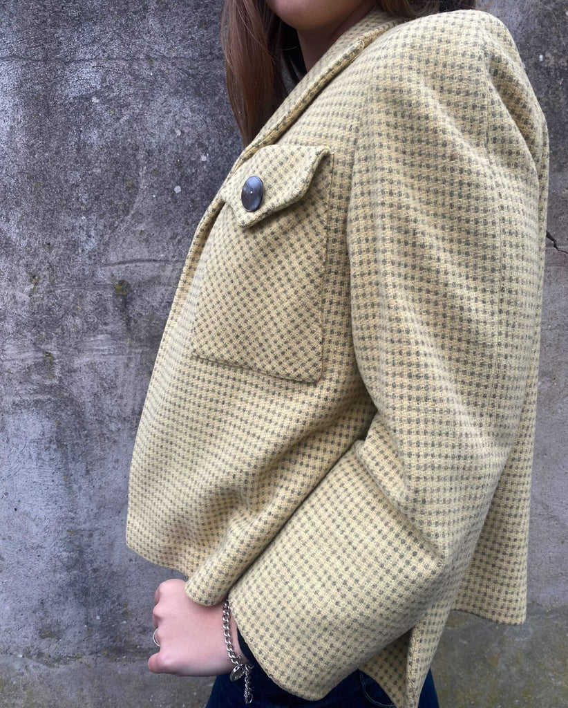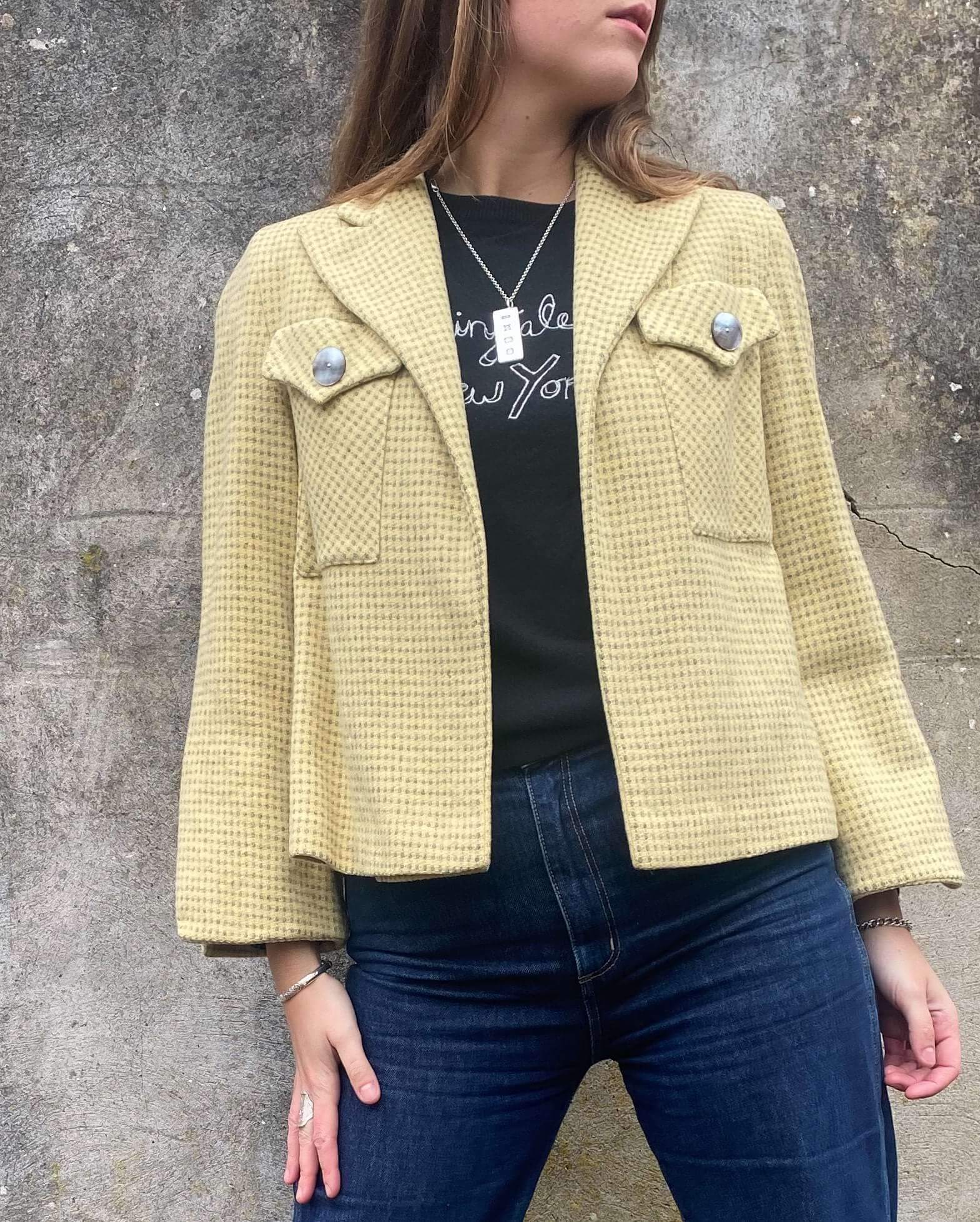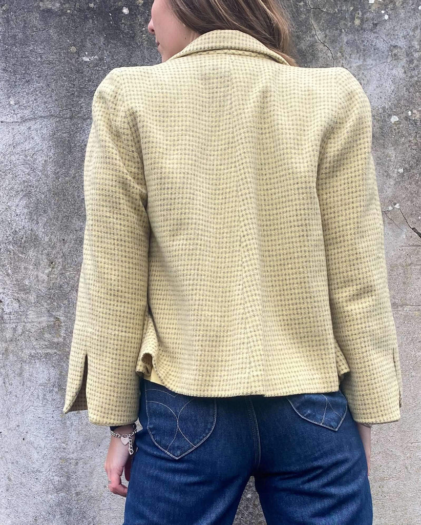 The jacket’s rich yellow shade is an instant mood booster, bringing warmth and energy to any ensemble. This striking colour reflects the optimism of the 1950s era, offering a cheerful yet sophisticated look that’s perfect for brightening up cooler days.