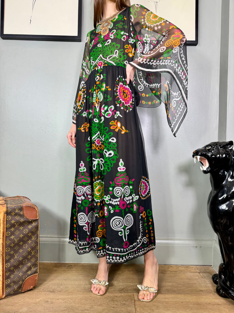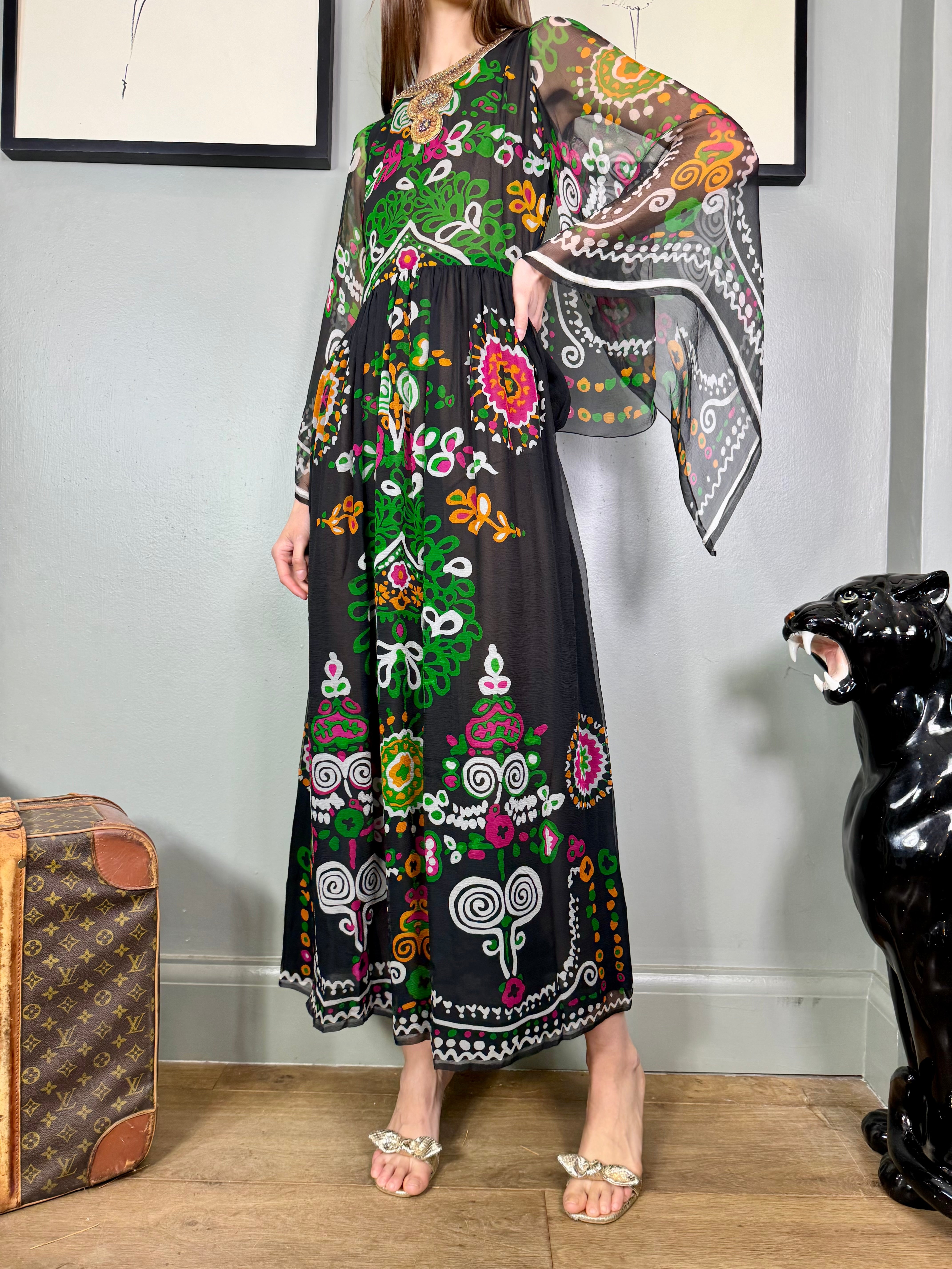Fabulous 70s silk chiffon bohemian print dress with a Russian print style. Has a round neckline with a beaded sequins detail, floaty angel sleeves and a straight silhouette. Fastens on the back with hooks and a zip. Comes fully lined in silk. Very well made dress.
