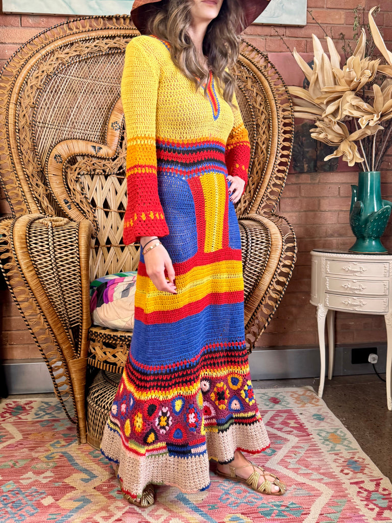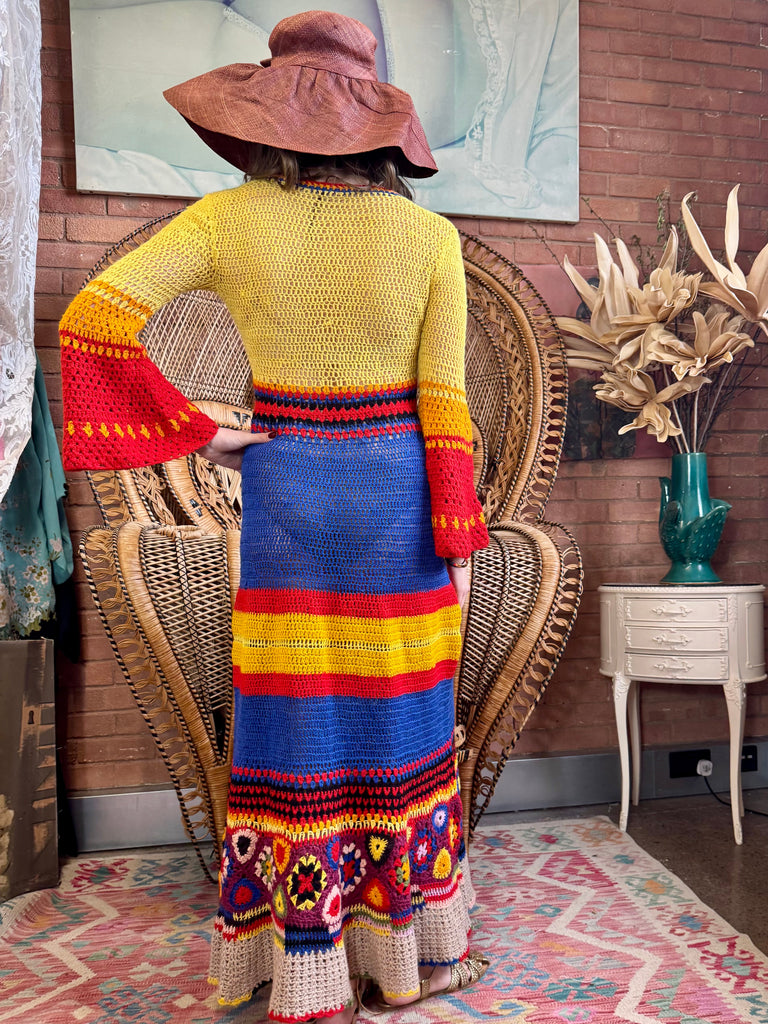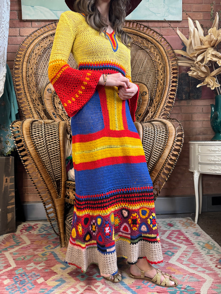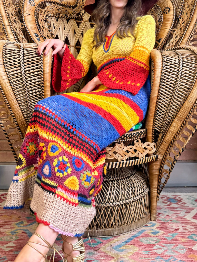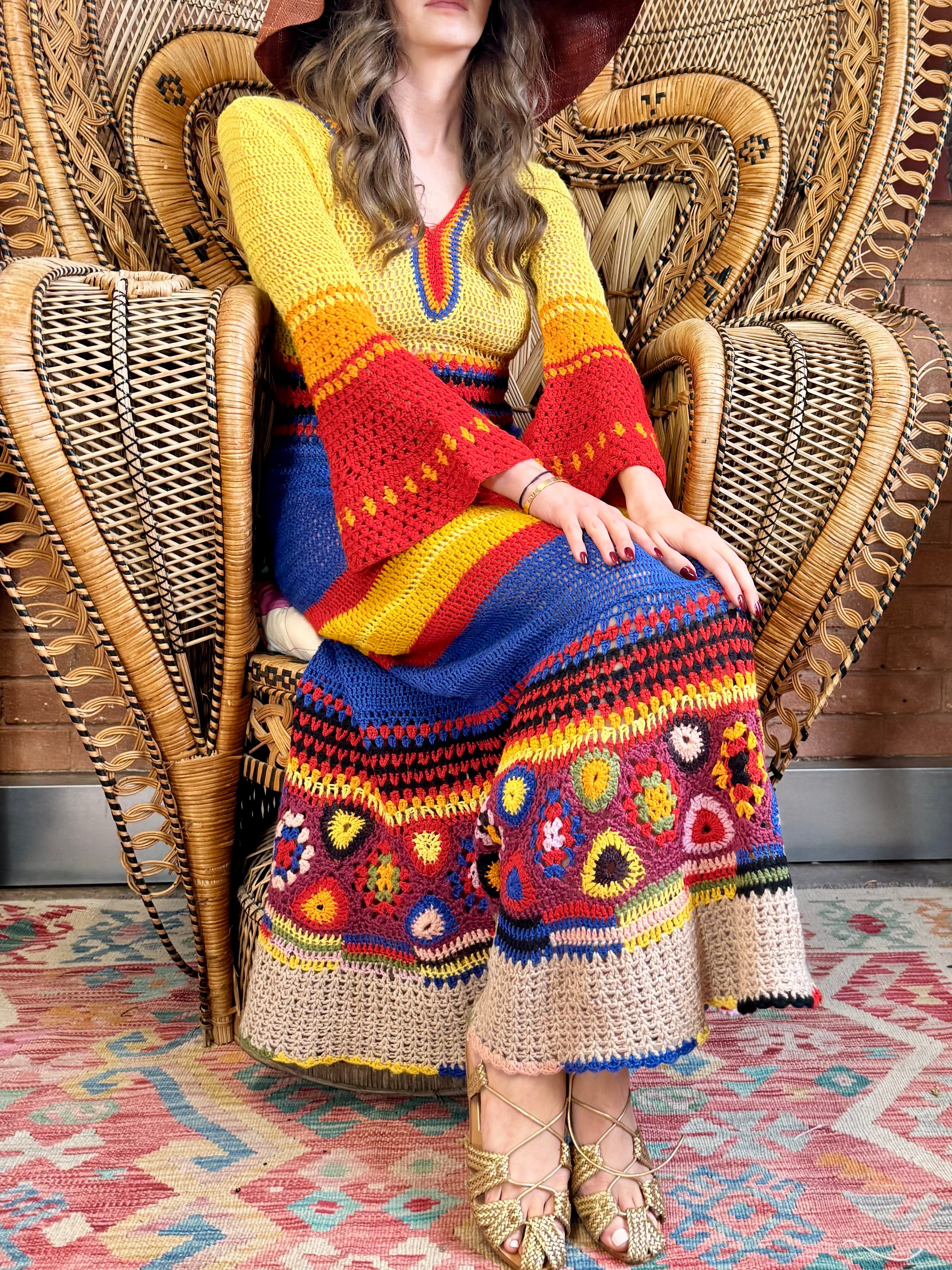 Indulge in the timeless charm of this 70s crochet long dress. Crafted from original handmade soft blend of cotton and wool, this multicolour dress features flair sleeves, a front V neckline, a fitted waist, and a fishtail silhouette. Perfect for summer, it's both stylish and flattering.