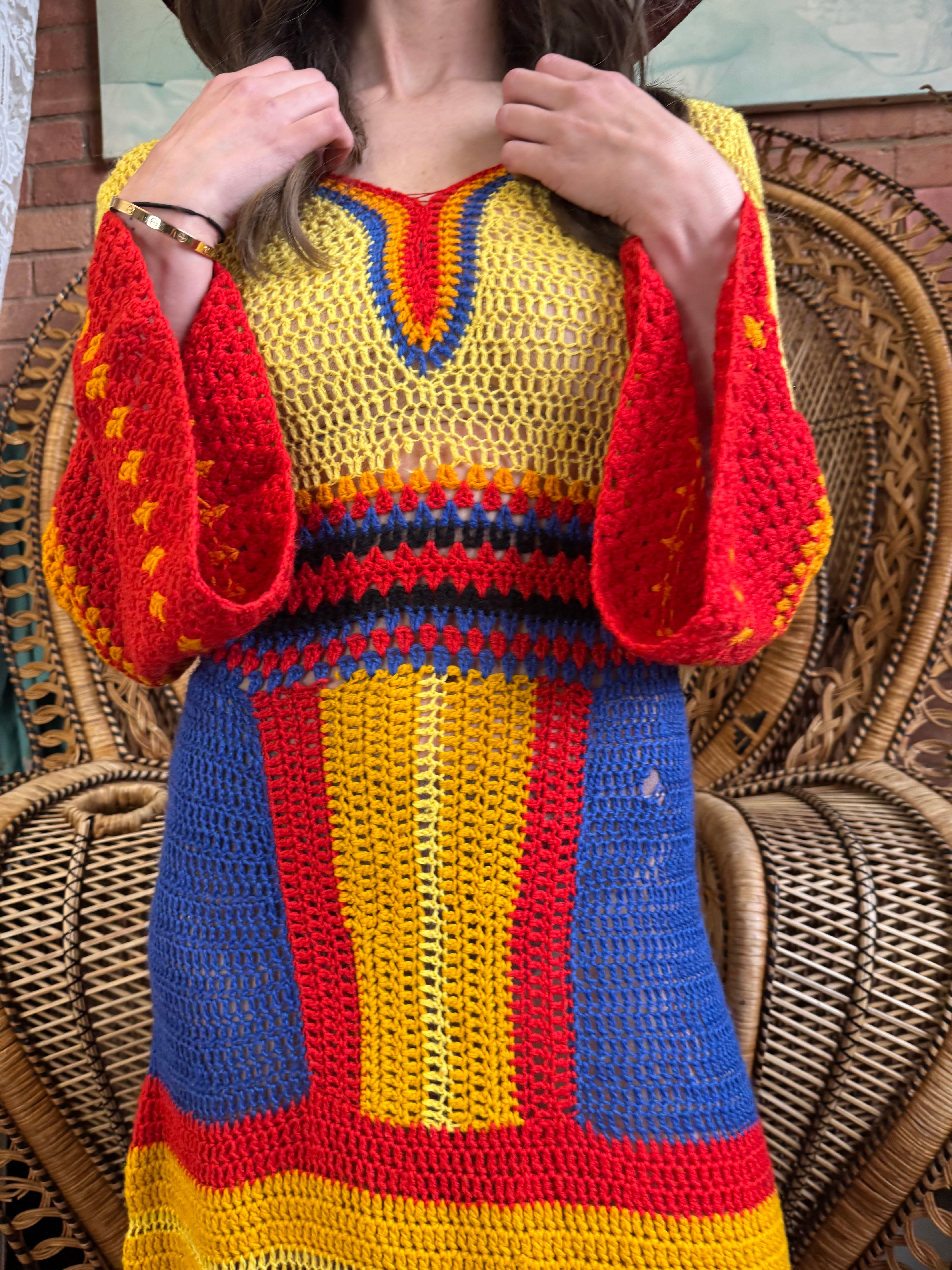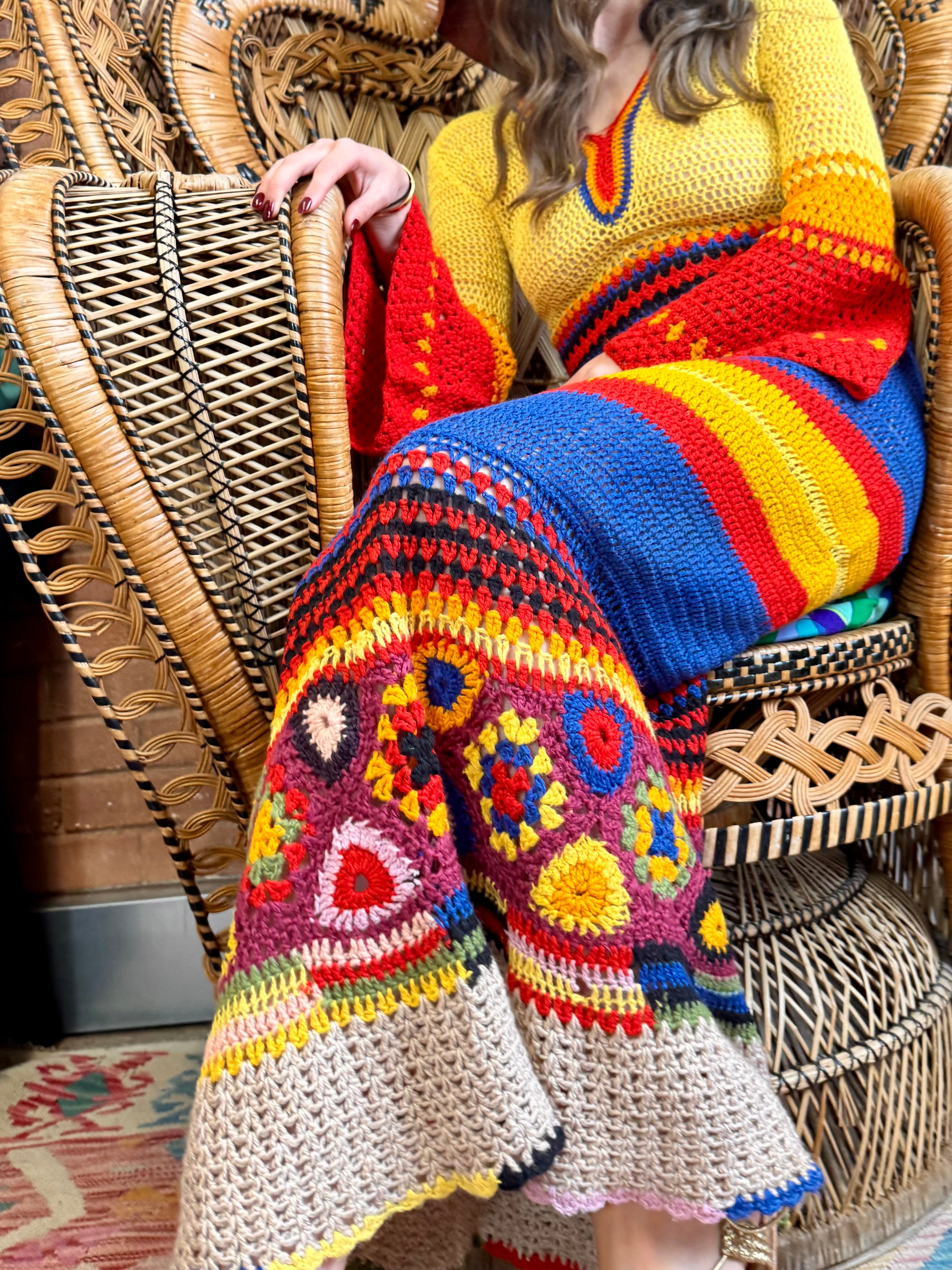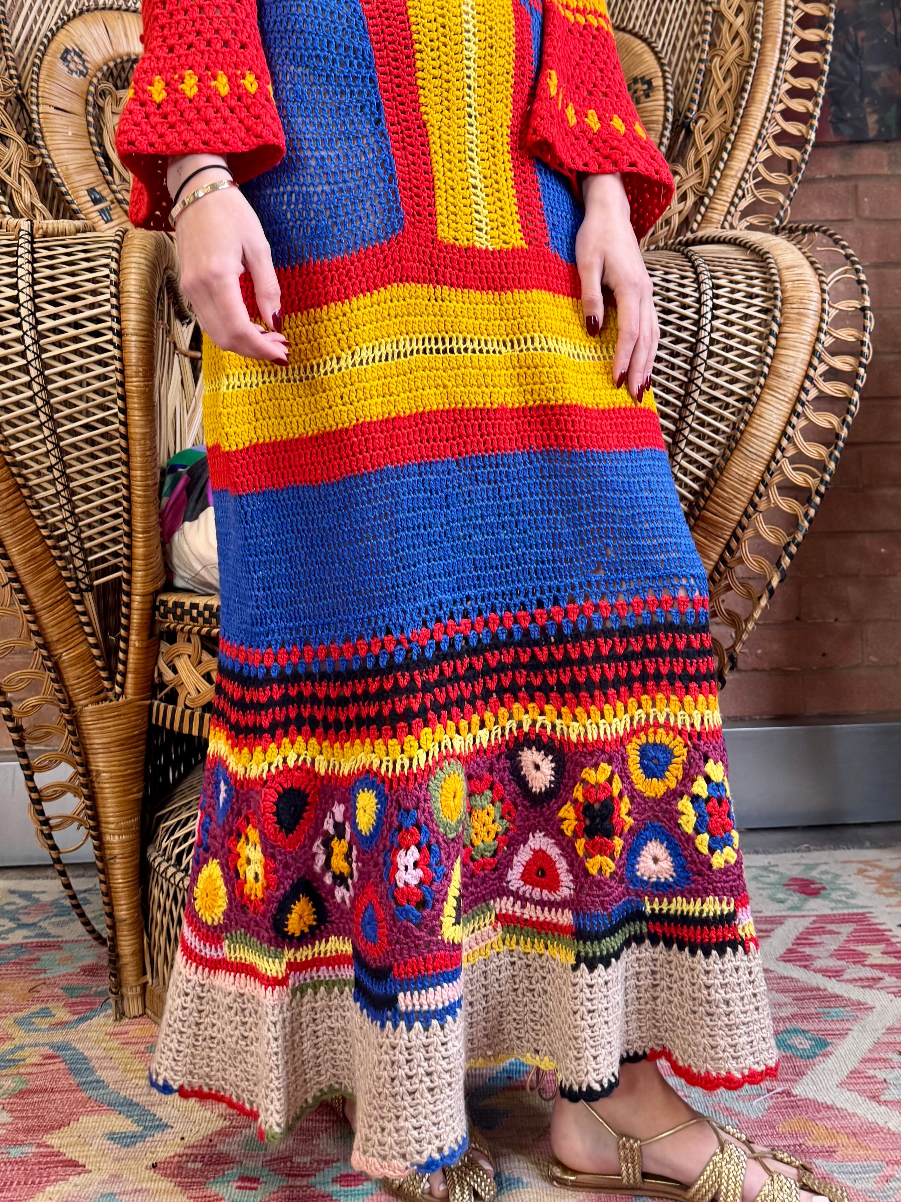 Indulge in the timeless charm of this 70s crochet long dress. Crafted from original handmade soft blend of cotton and wool, this multicolour dress features flair sleeves, a front V neckline, a fitted waist, and a fishtail silhouette. Perfect for summer, it's both stylish and flattering.