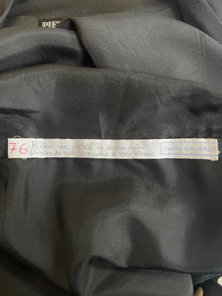 This dress is in excellent condition with the original labels intact. This piece doesn't have a size label so please check the measurements below. There is a hand-written label inside the waistband that reads "robe de cocktail en socoa noir doublée de toile de soie noire à pois blancs" (cocktail dress in black socoa lined with black silk canvas with white polka dots). It is annotated "76" which probably denotes a runway look, and is stamped with a Pierre Balmain stamp. Runway footage from the earlier part of the 1980s is patchy and we've haven't yet been able to attribute to a particular collection. The dress would best fit around a UK 8-10, US 4-6.