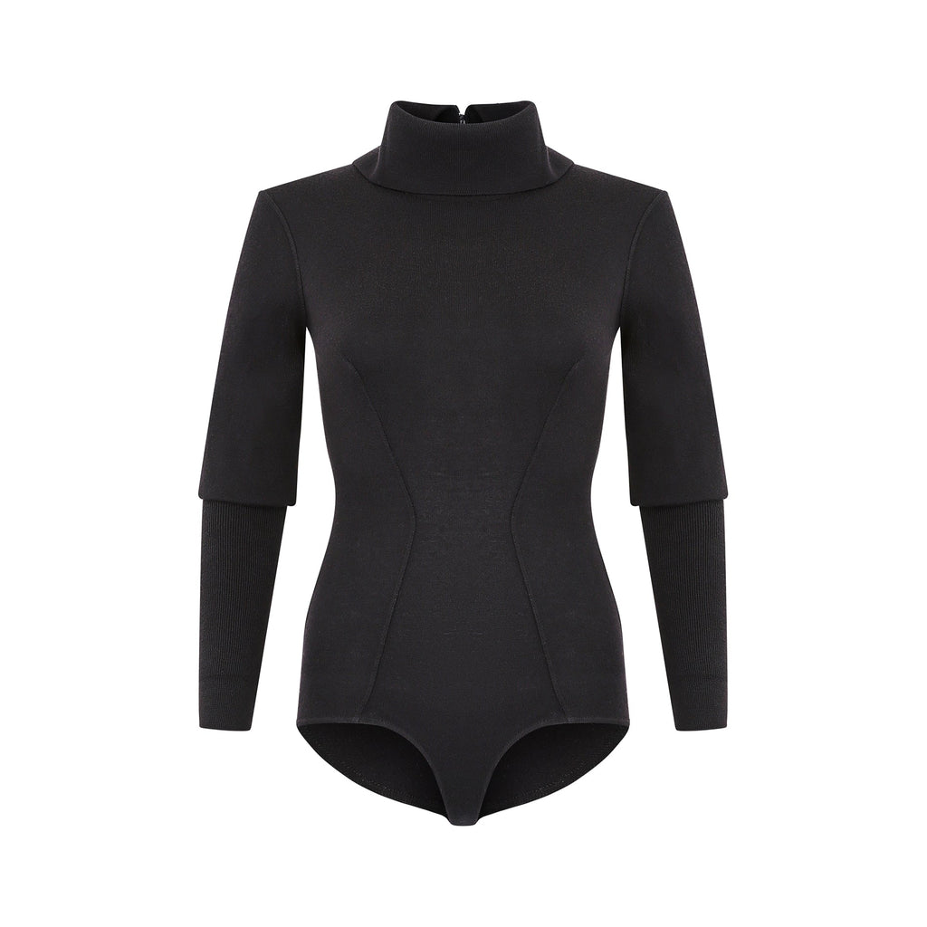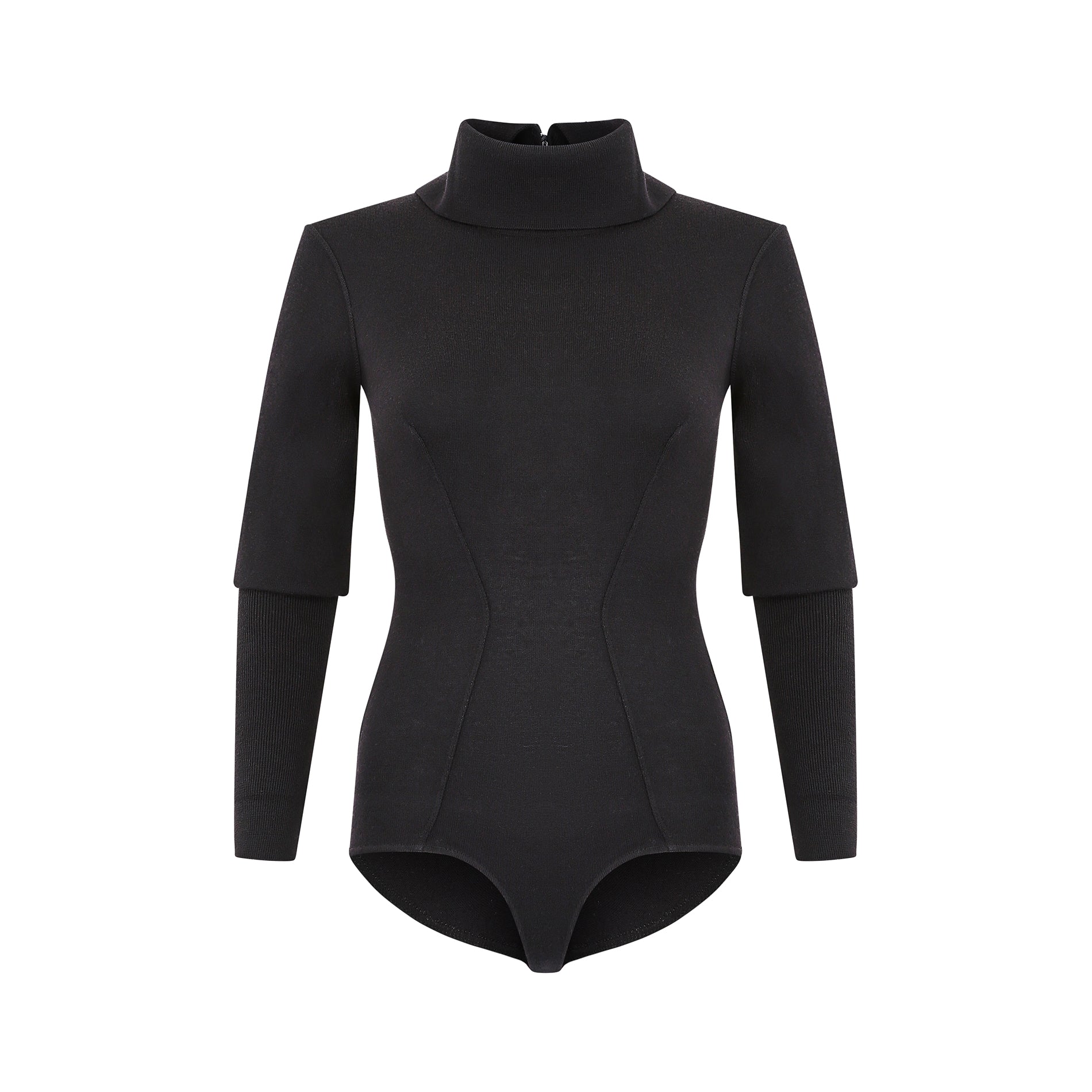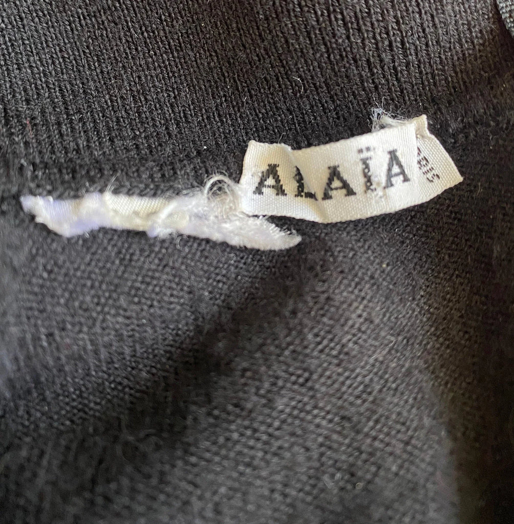 This is a super sassy and figure hugging Alaia long sleeve blended knit bodysuit from the renowned 1987 collection. The top section has a high neck and flattering seam detail which spans vertically from waist to bust, cinching in the middle section. The lower section has two popper fastenings, and the back features a half zip closure.