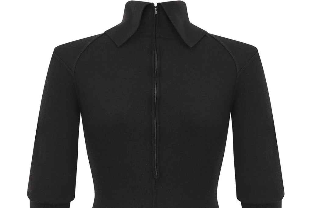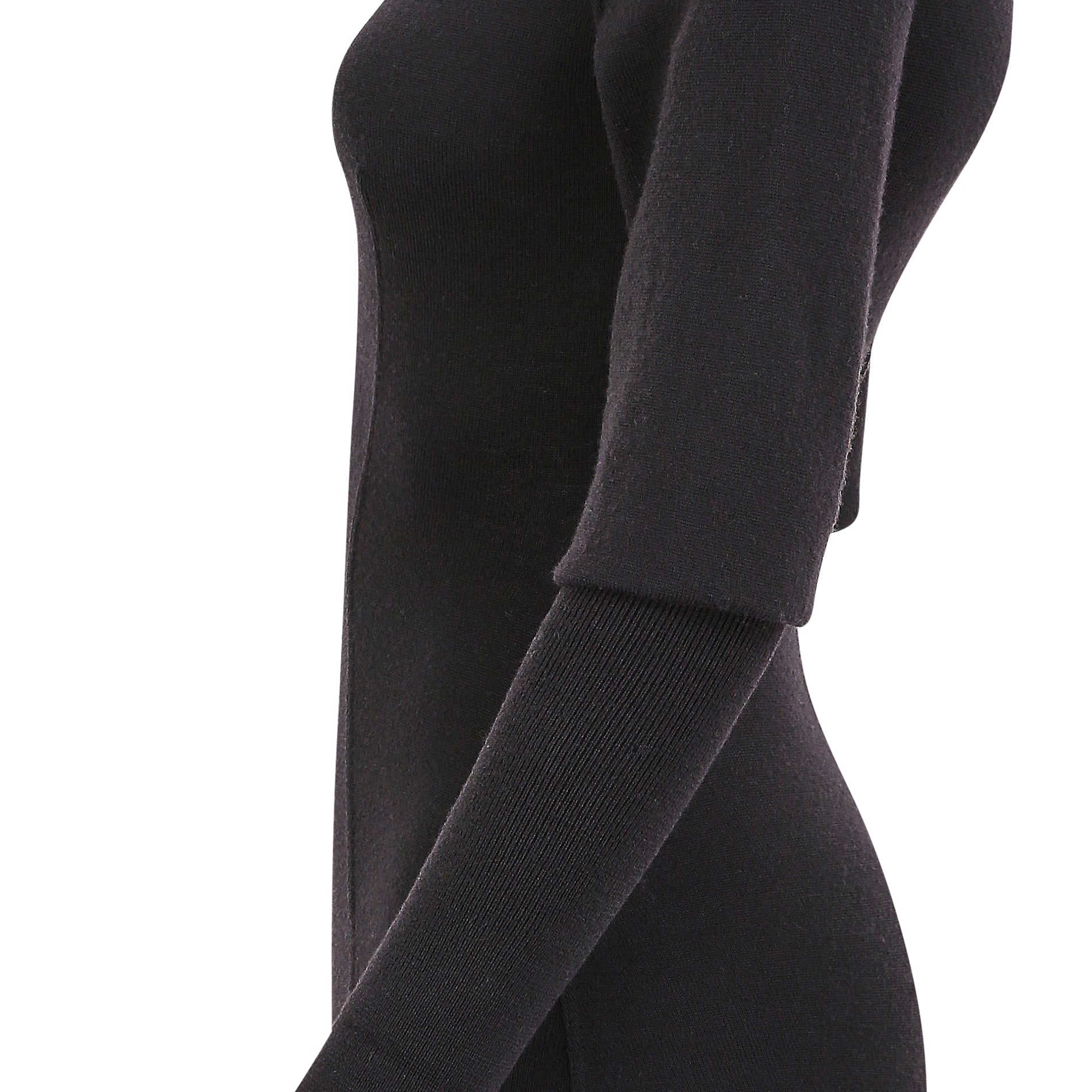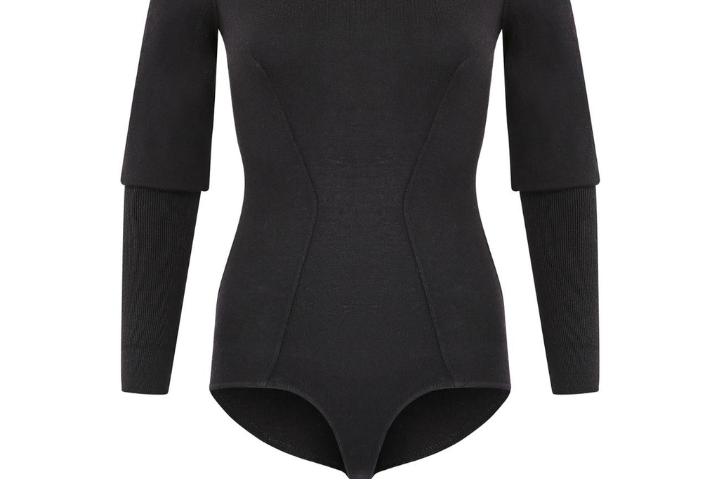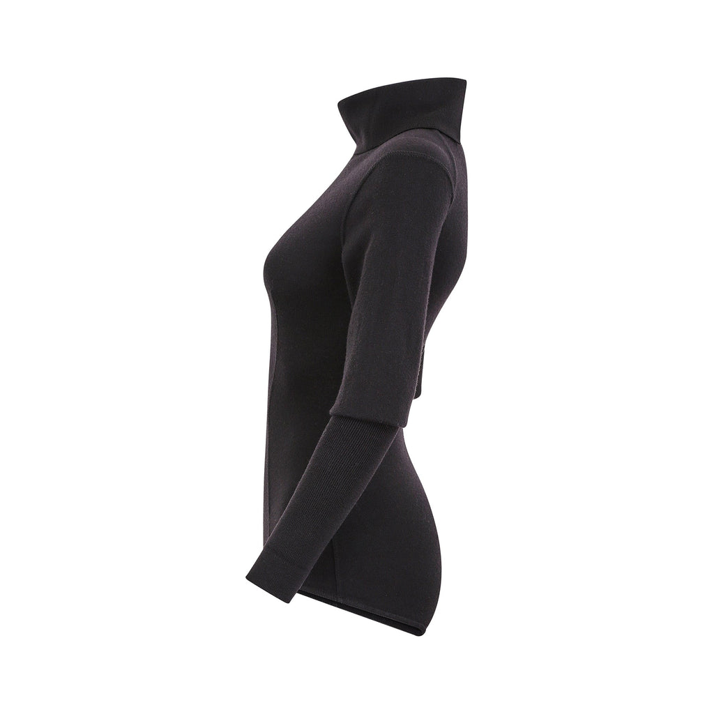 This is a super sassy and figure hugging Alaia long sleeve blended knit bodysuit from the renowned 1987 collection. The top section has a high neck and flattering seam detail which spans vertically from waist to bust, cinching in the middle section. The lower section has two popper fastenings, and the back features a half zip closure.