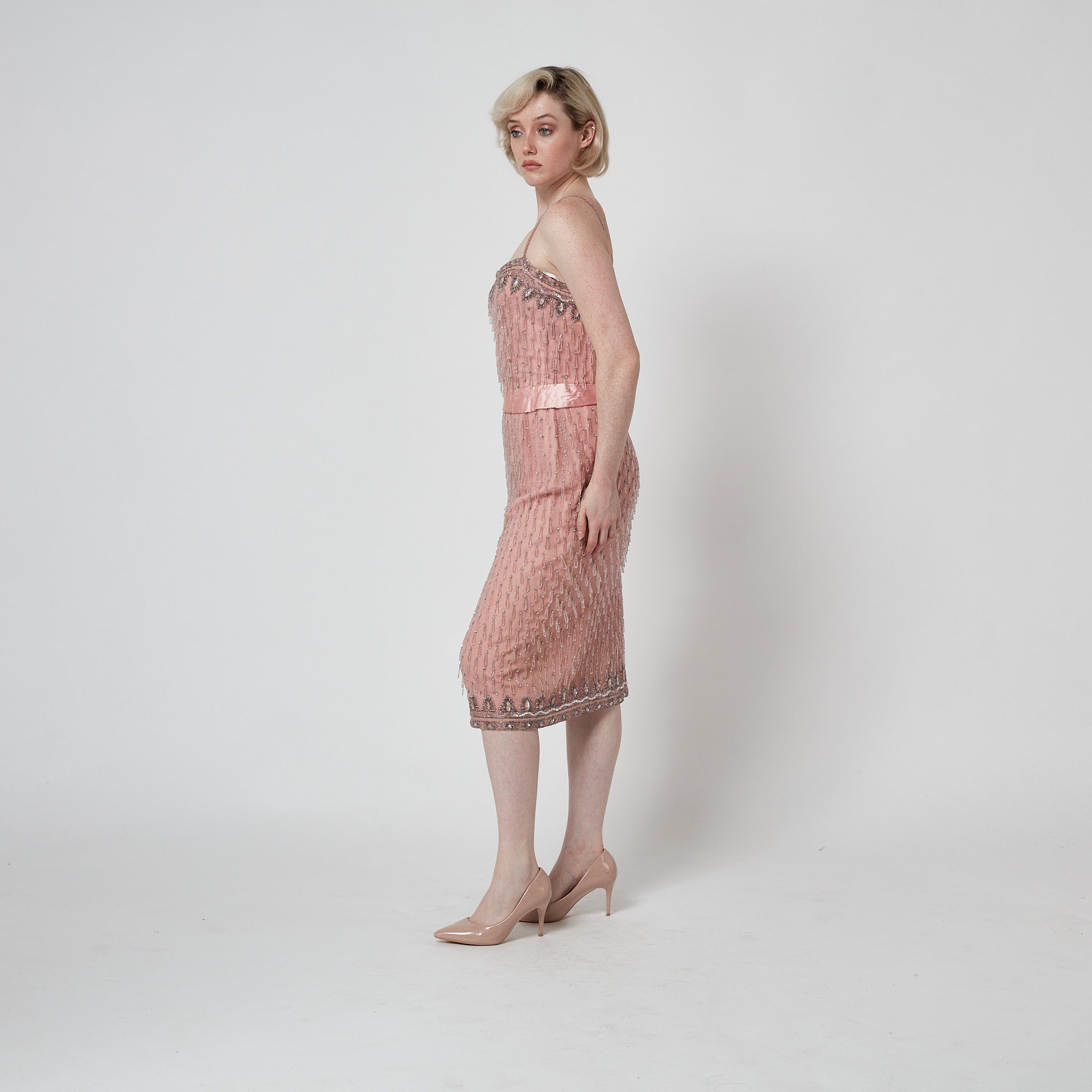 Couture made in the 1950s, this truly stunning pale pink gown has retained all of the delicate intricacy of when it was first designed. With elaborate bead work, it is cut to a fitted, body skimming silhouette with spaghetti straps. The dress is constructed from stiff silk and overlaid with chalk pink mesh. The mesh fabric is embroidered all-over with heavy intricate beading; loops of transparent beads hang from sequins the full length of the piece, whilst dark grey beads form glittering shapes along the bust and bottom hem that echo the curves of the tailoring. The gown is boned the whole way around and features an underwired bra and modesty straps inside the bodice for extra support. The bust is also lined with nude mesh. It fastens at the rear with a pink tonal zip and hook-and-eye clasp. The thin straps are adorned with two rows of pearlescent sequins. This dress is fully lined in cream silk. A final stand-out feature is the bubble-gum pink silk-satin sash that adorns the waist, christened by a lovely, typically ‘50s flat bow at the centre of the back.