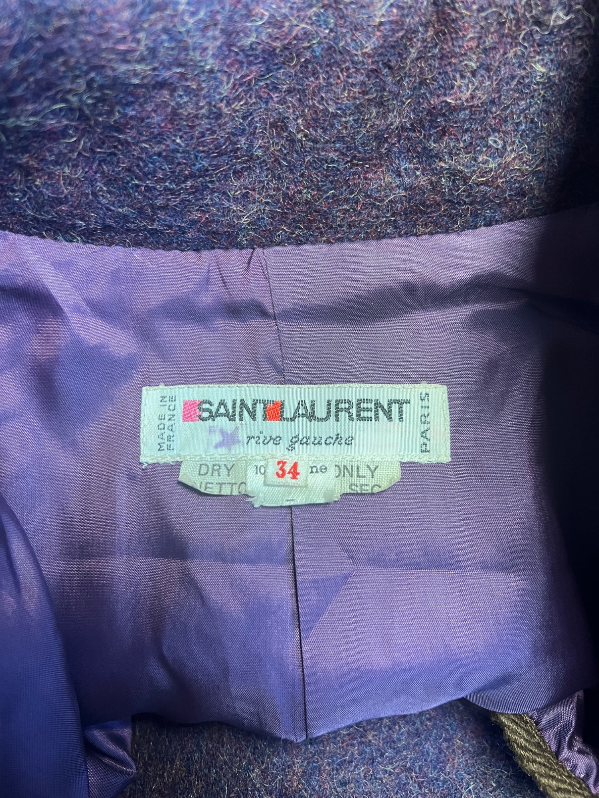 Tailored from a rich aubergine purple wool, it is woven with other hues - including gold, russet and cobalt - resulting in a textured, speckled felt effect. It features wide, voluminous bell-sleeves, each buttoning at the cuff with four brown buttons. The bodice is tailored and fitted to the curves of the body, finished with a graceful Mandarin high-neck and secured down the front with seven wooden buttons. The bottom half of the jacket is full, falling from under the bodice in soft pleats. The coat is trimmed at the seams, cuffs, collar and down the front with intricate twisted brown braid, which is also used as fabric loops to close the buttons. There are in-seam pockets in the side seams. This coat is lined at the top and inside the sleeves and pockets with purple satin. The label reads “Yves Saint Laurent Rive Gauche”, a reference to Paris’s younger and trendier left bank.