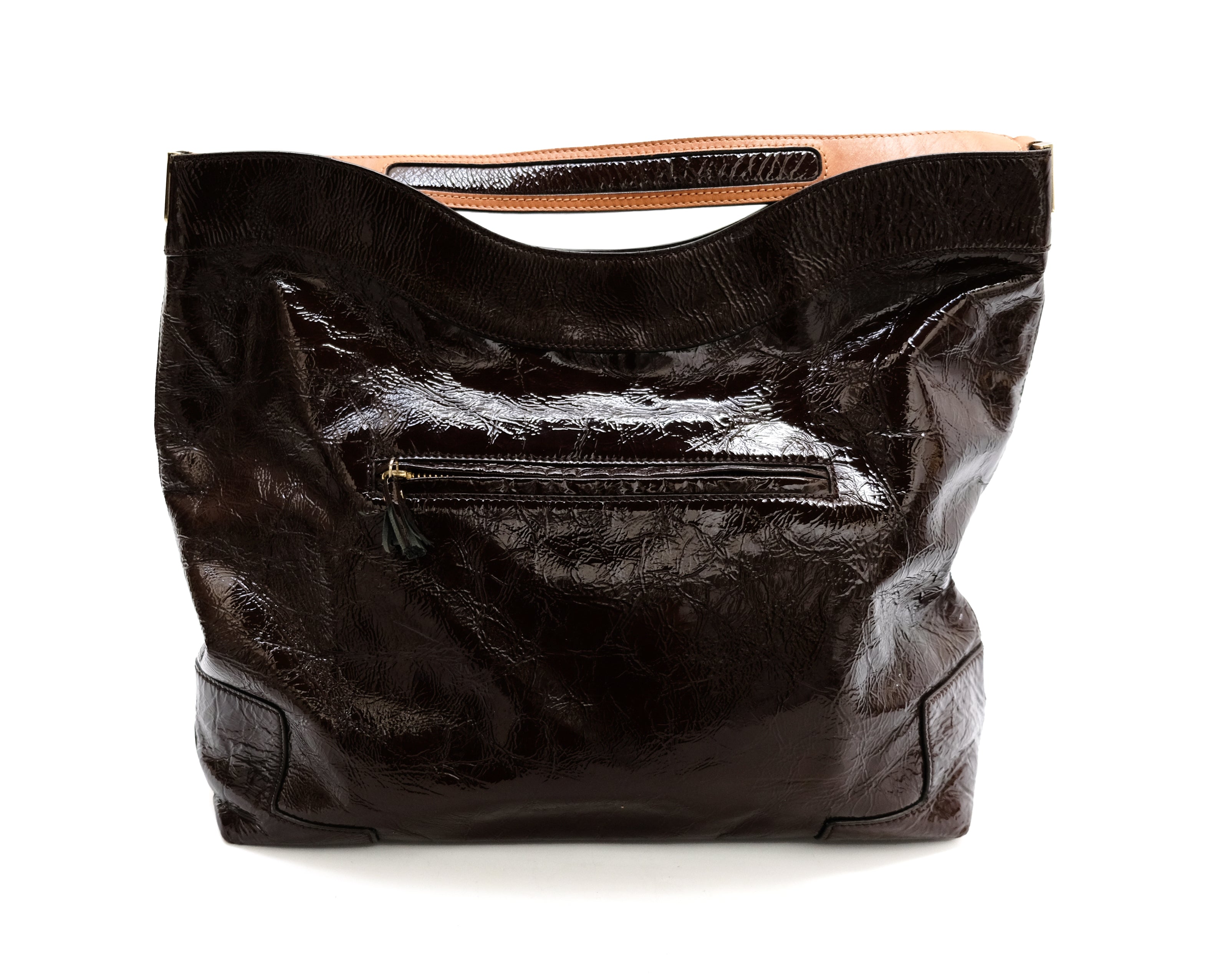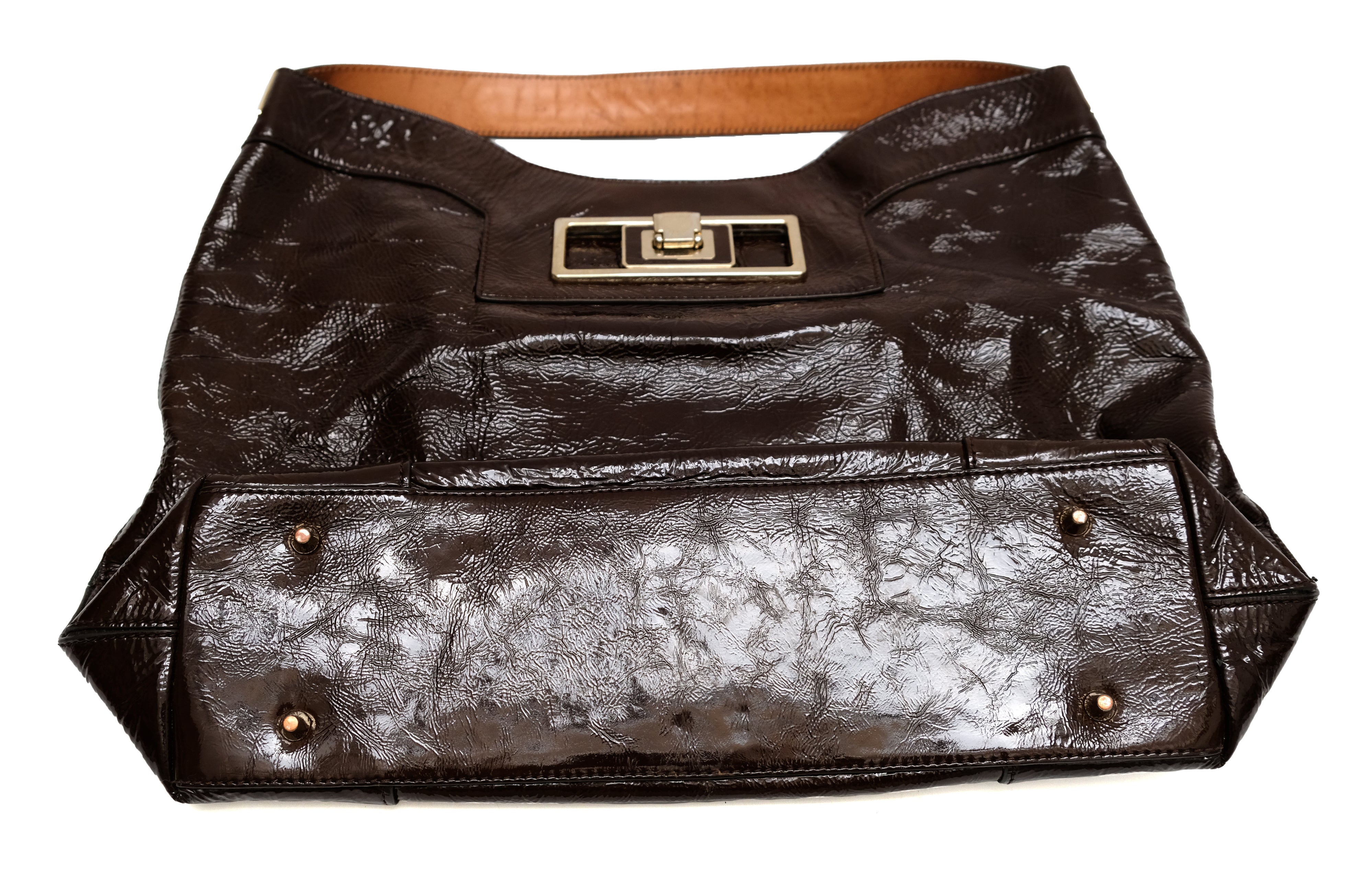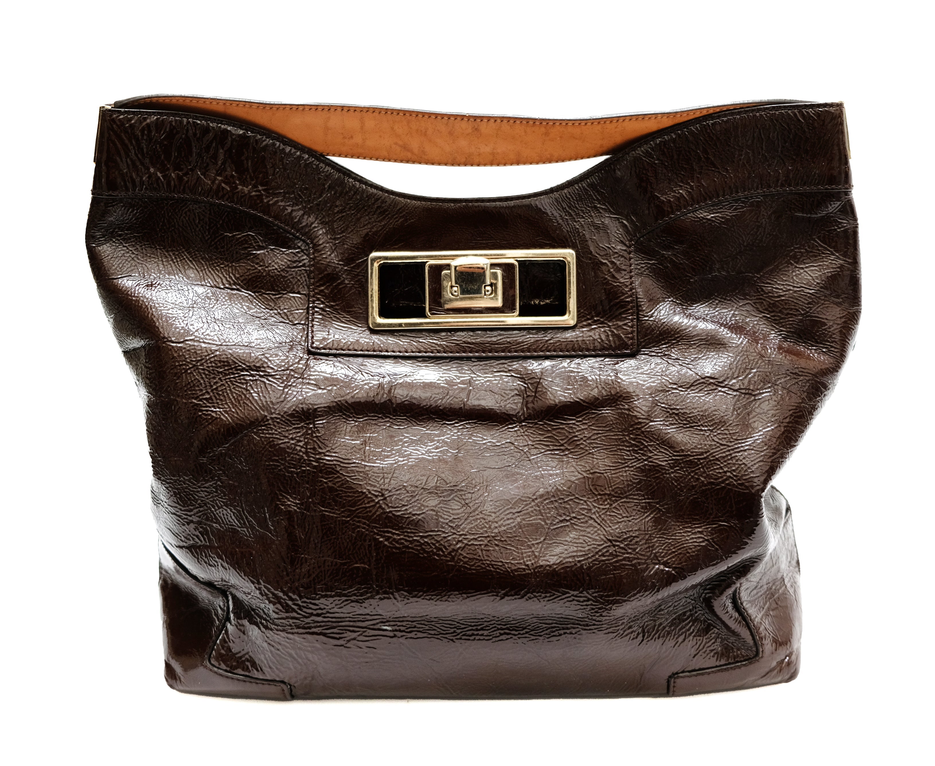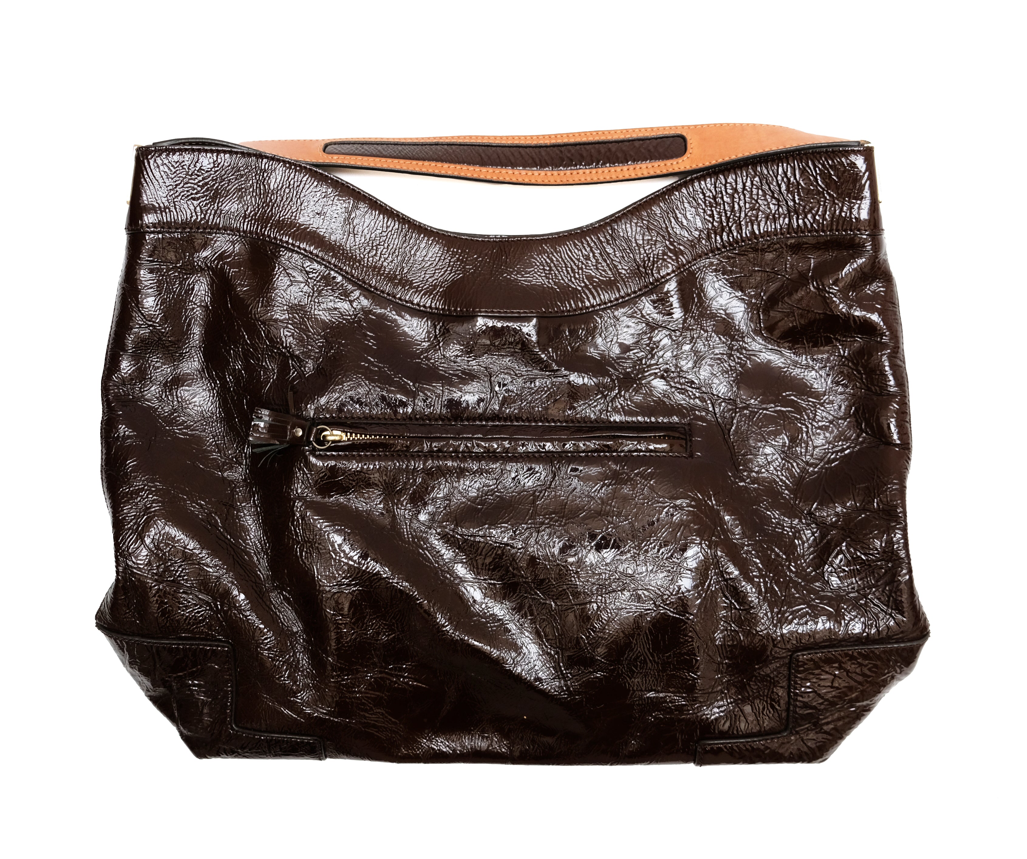 A large slouchy shoulder bag in crinkly brown patent leather by Anya Hindmarch.