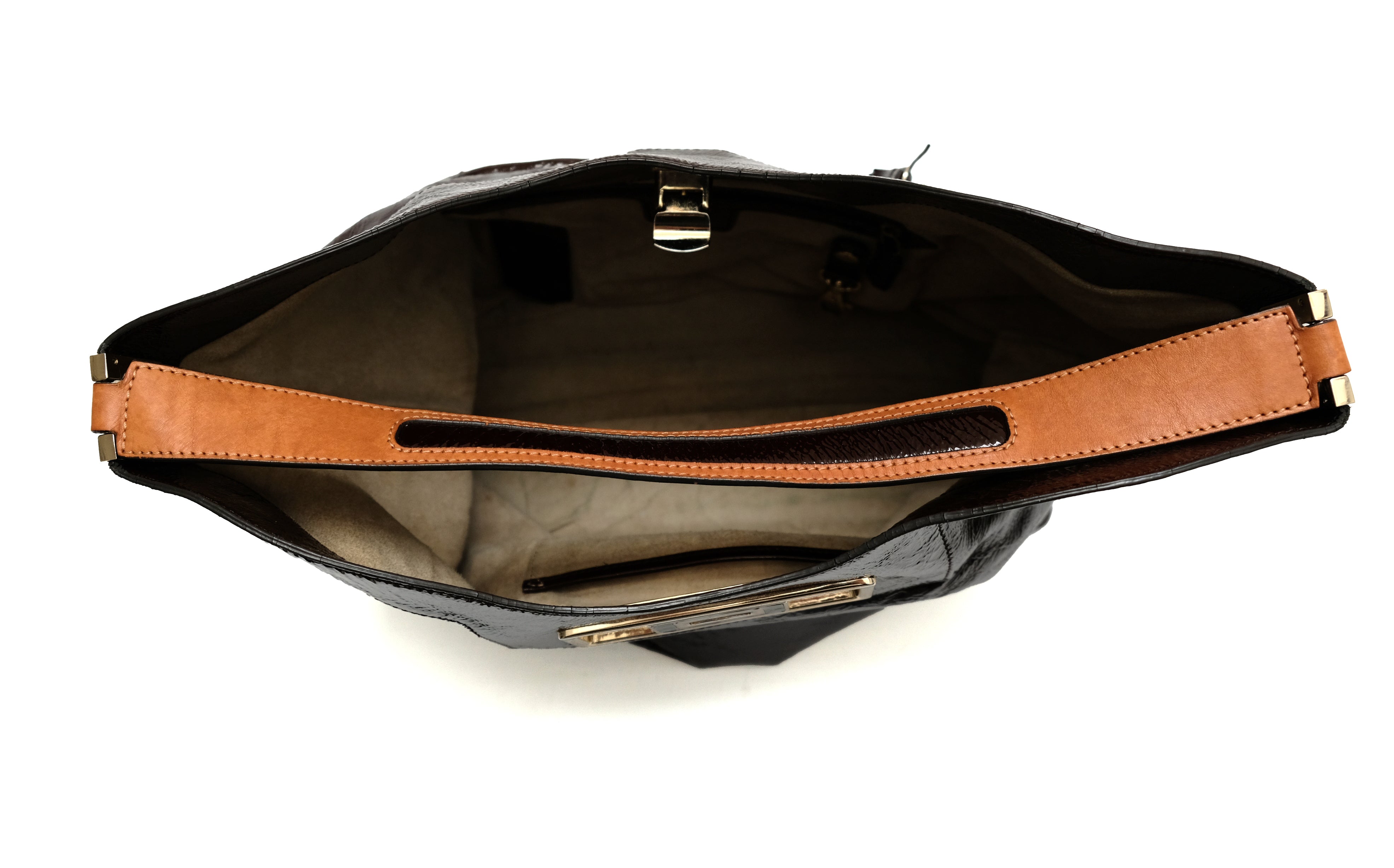 Lined in soft beige suede with patent leather detailing. Two interior pockets one with a zip; pen pocket and key clip.