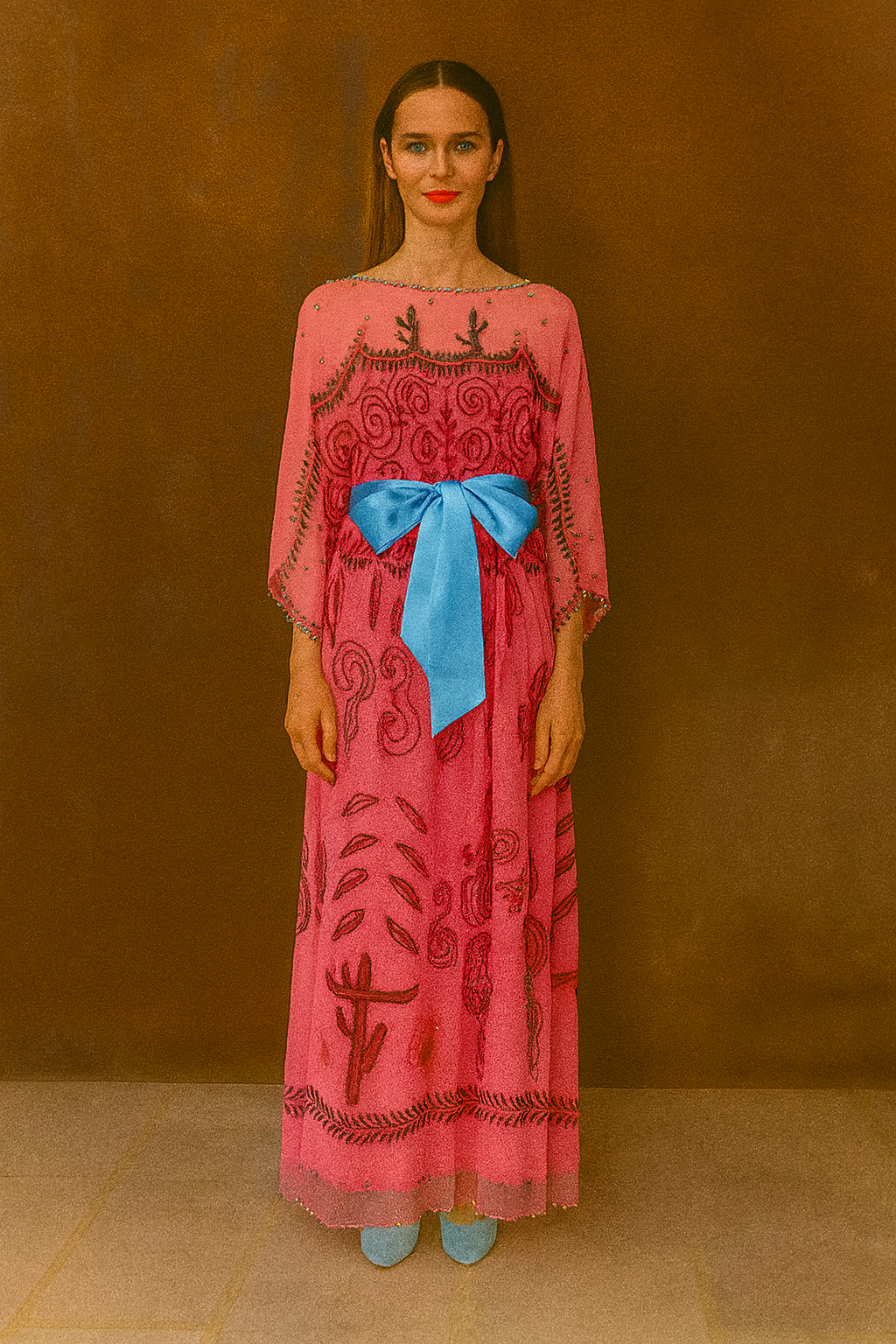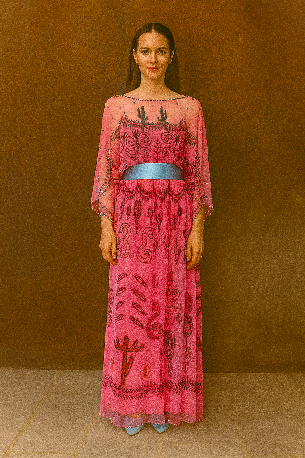 This rare and collectible chiffon dress from Zandra Rhodes's 1976 Spring/Summer Cactus and Cowboy collection showcases iconic design elements. Featuring a sequin-trimmed neckline, long sleeves, and an elasticated waist, the straight pleated skirt creates elegant movement. The adjustable back tie and keyhole detail add bespoke refinement. Fully lined and accompanied by its original pale blue satin sash, this historically significant piece has been museum-featured and bears its original numbered label, underscoring its authenticity and archival value.