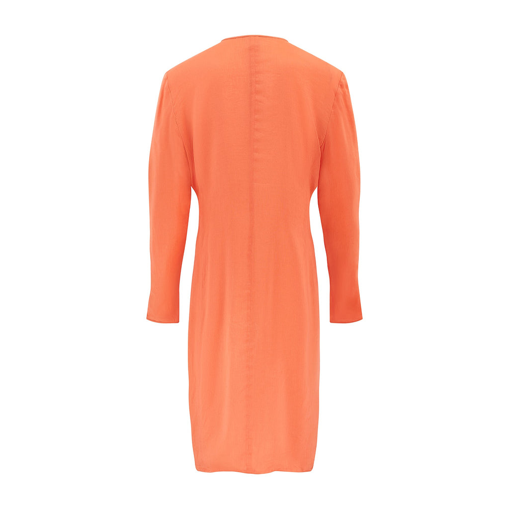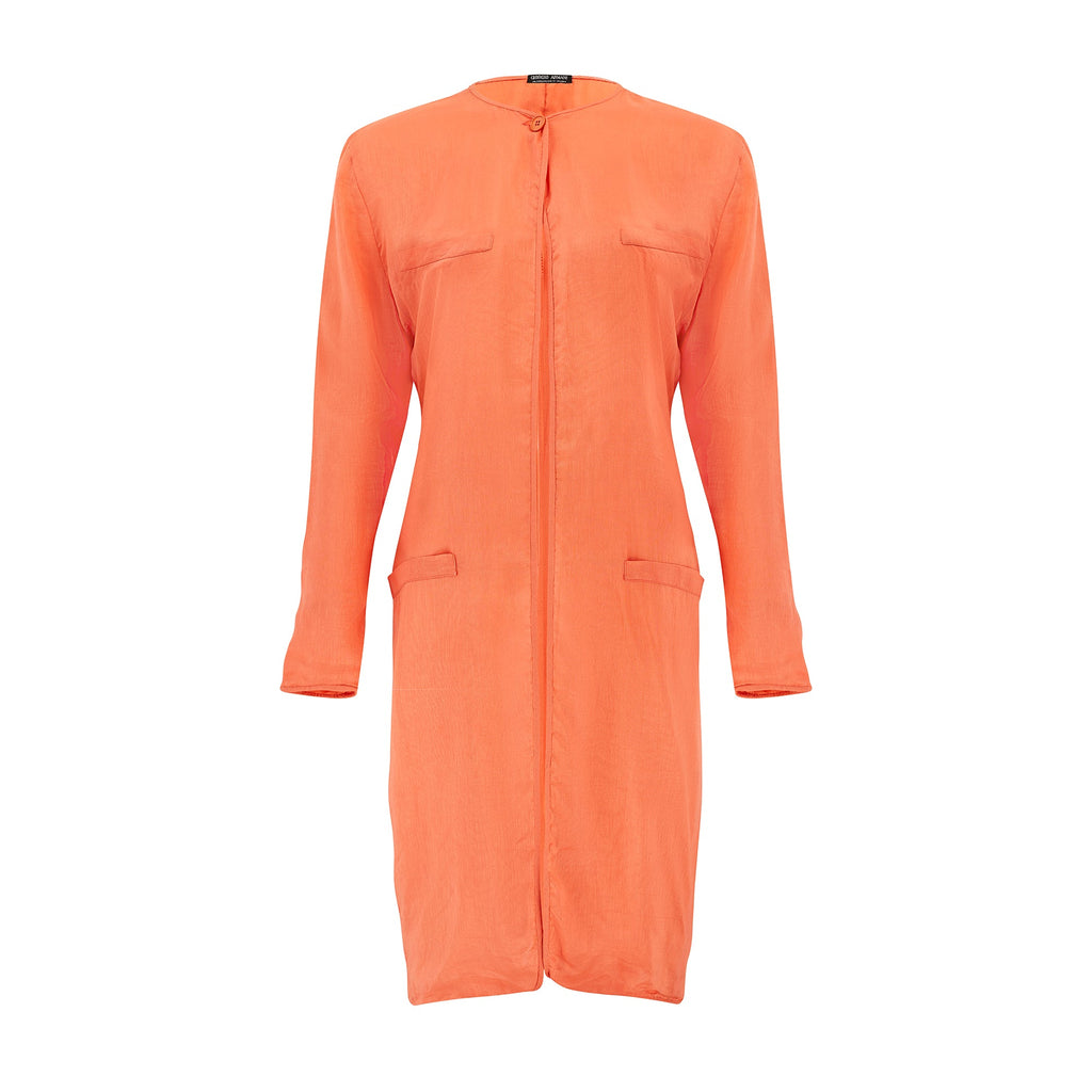 This 1980s or very early 1990s orange silk cover-up was designed by Giorgio Armani who defined the decade’s power-dressing with his unstructured jackets and fluid tailoring, epitomising understated luxury and the rise of the “Armani woman”. Tailored from smooth silk with a subtle tonal horizontal stripe, it has a slim, straight cut designed to hang open around the body. It fastens at the neck with one tonal orange plastic button and hangs open from there. It is detailed with four faux welt pockets - two at the chest and two on the hips. This piece is unlined and, as a result, has a slightly sheer finish. A vibrant, highly wearable take on a timeless, everyday piece.