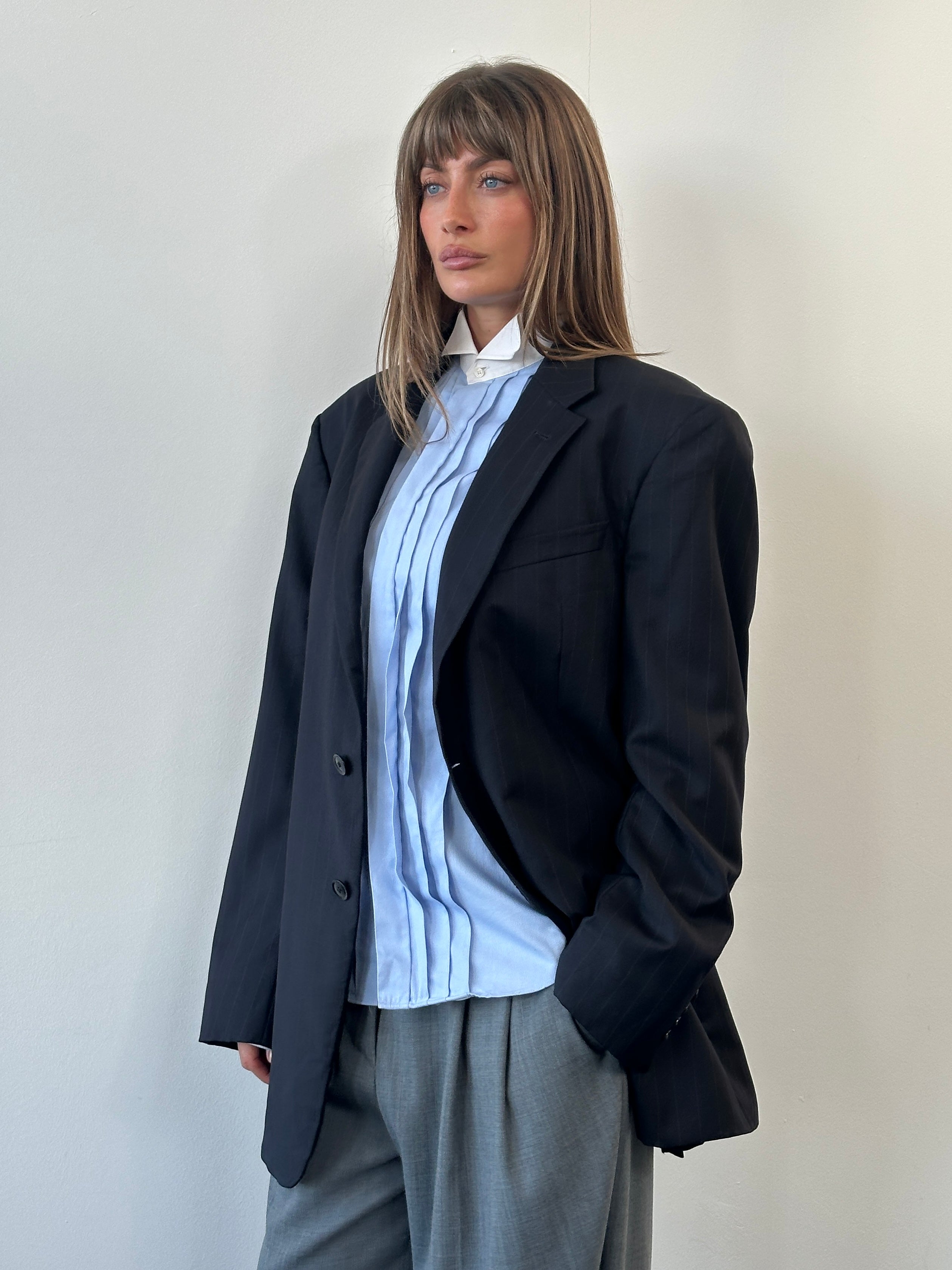 Navy with a subtle pinstripe, this early 2000s Armani Collezioni blazer offers a clean tailored silhouette with a structured shoulder and refined minimal finish. Made in Italy in pure wool for a polished quiet luxury feel.