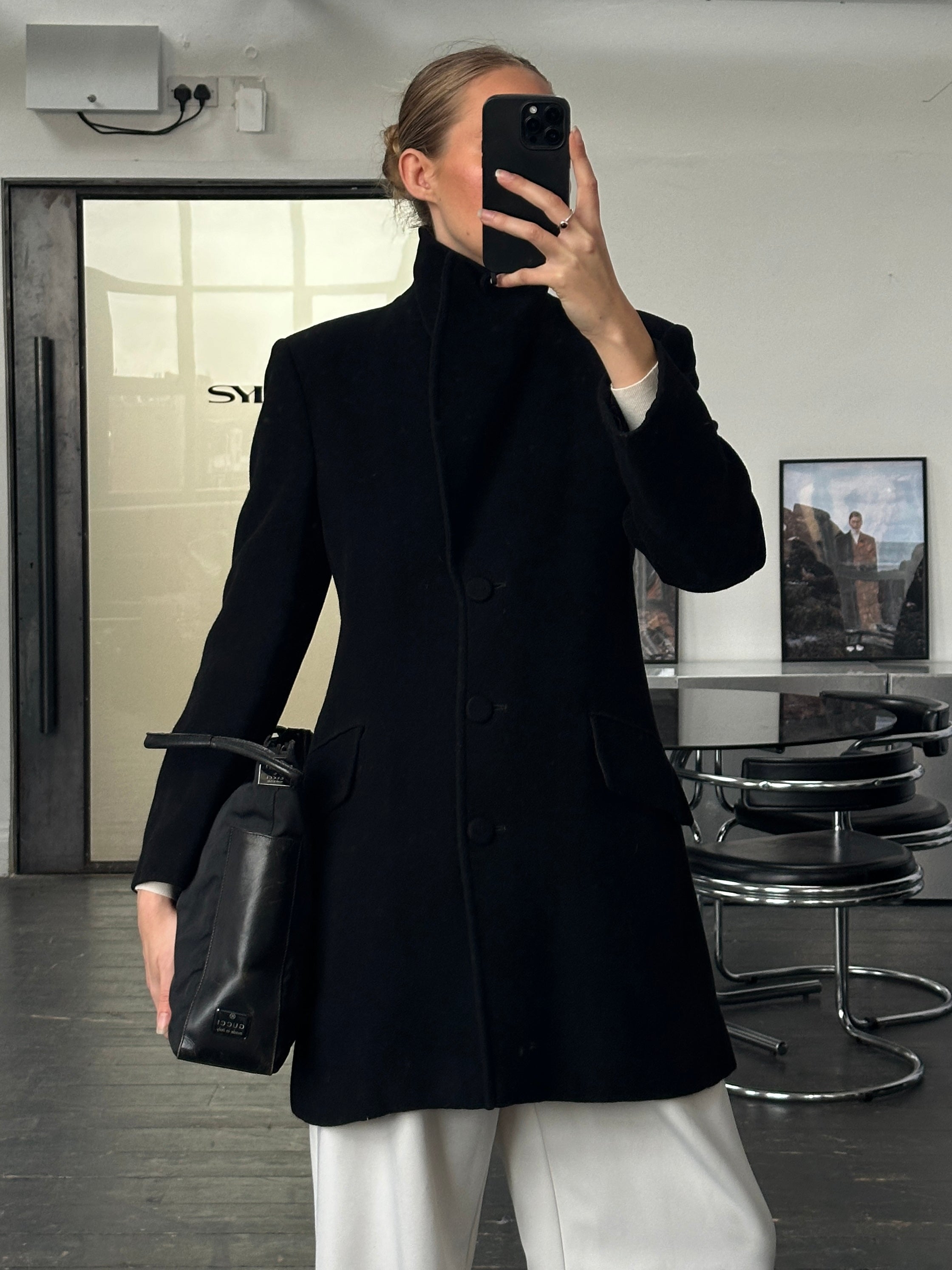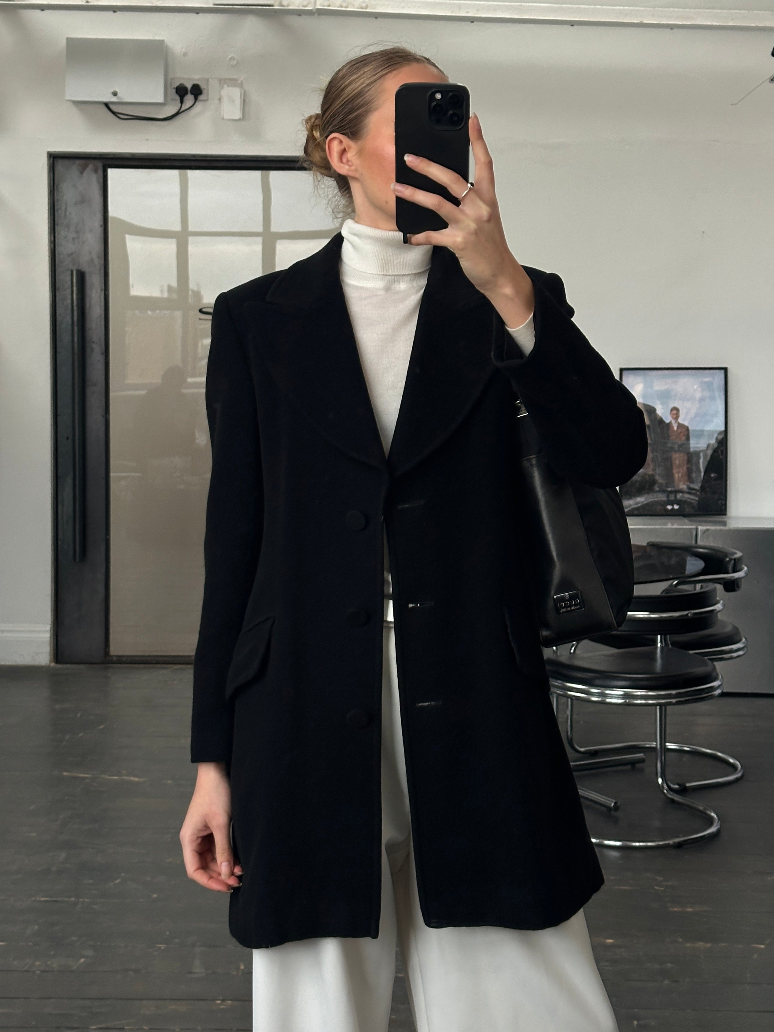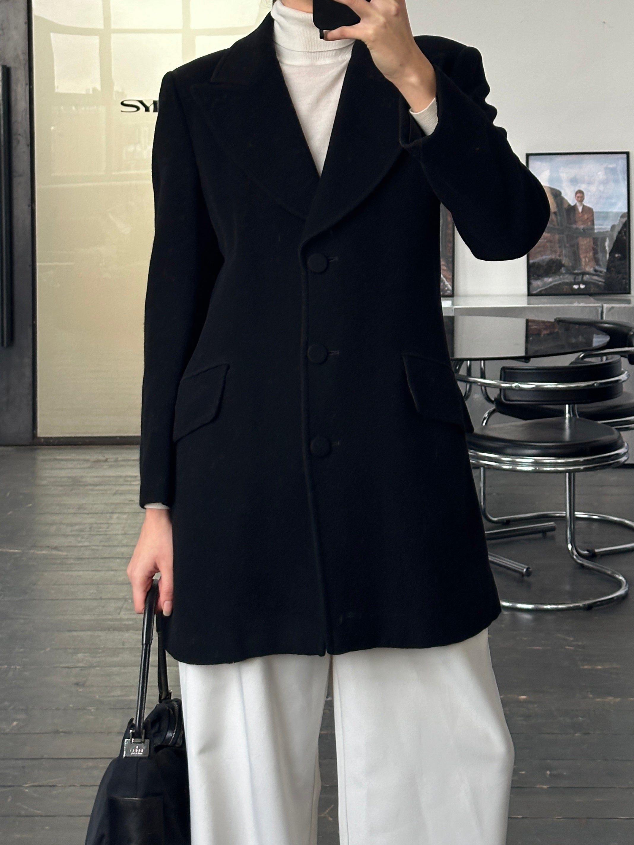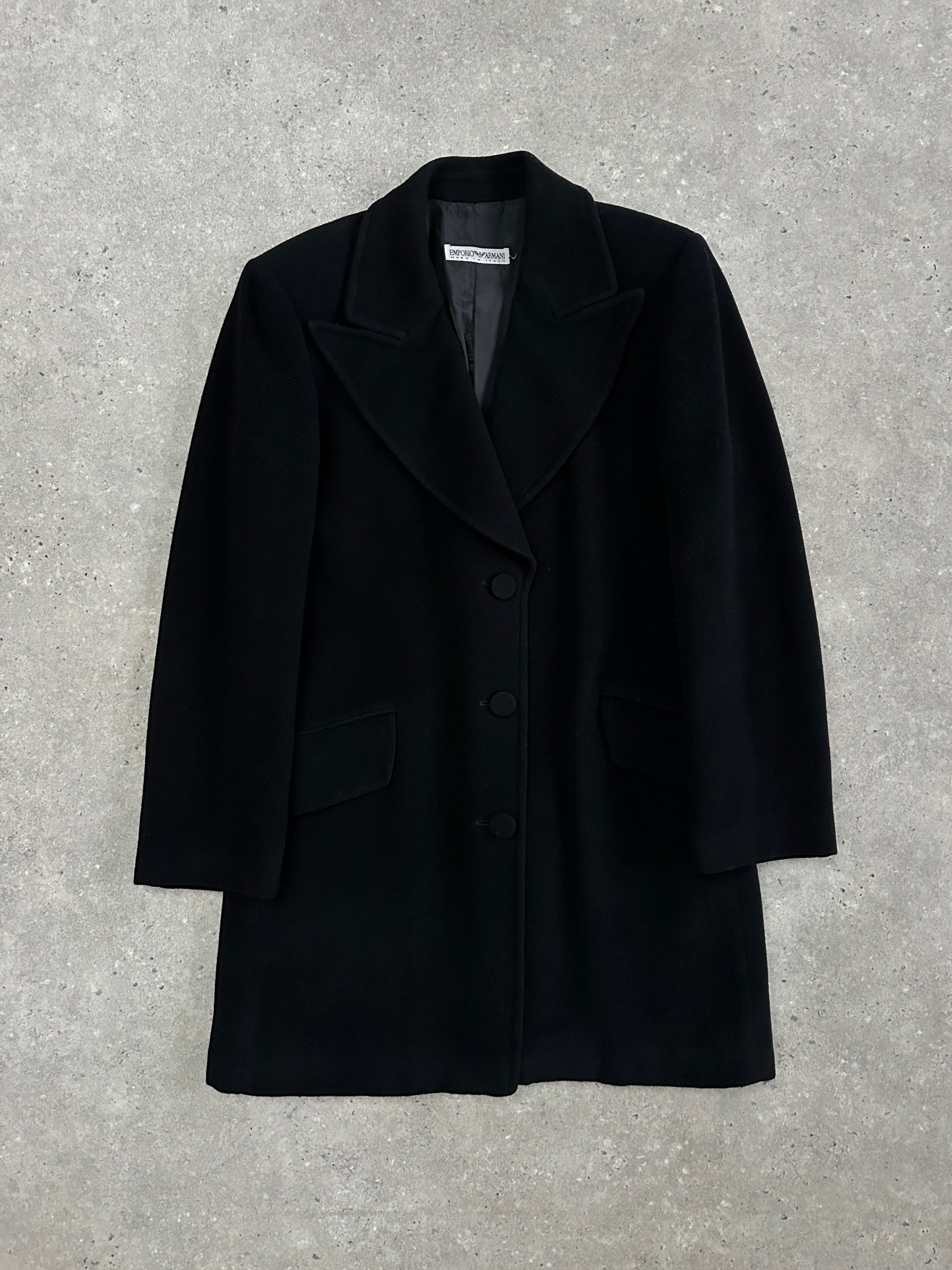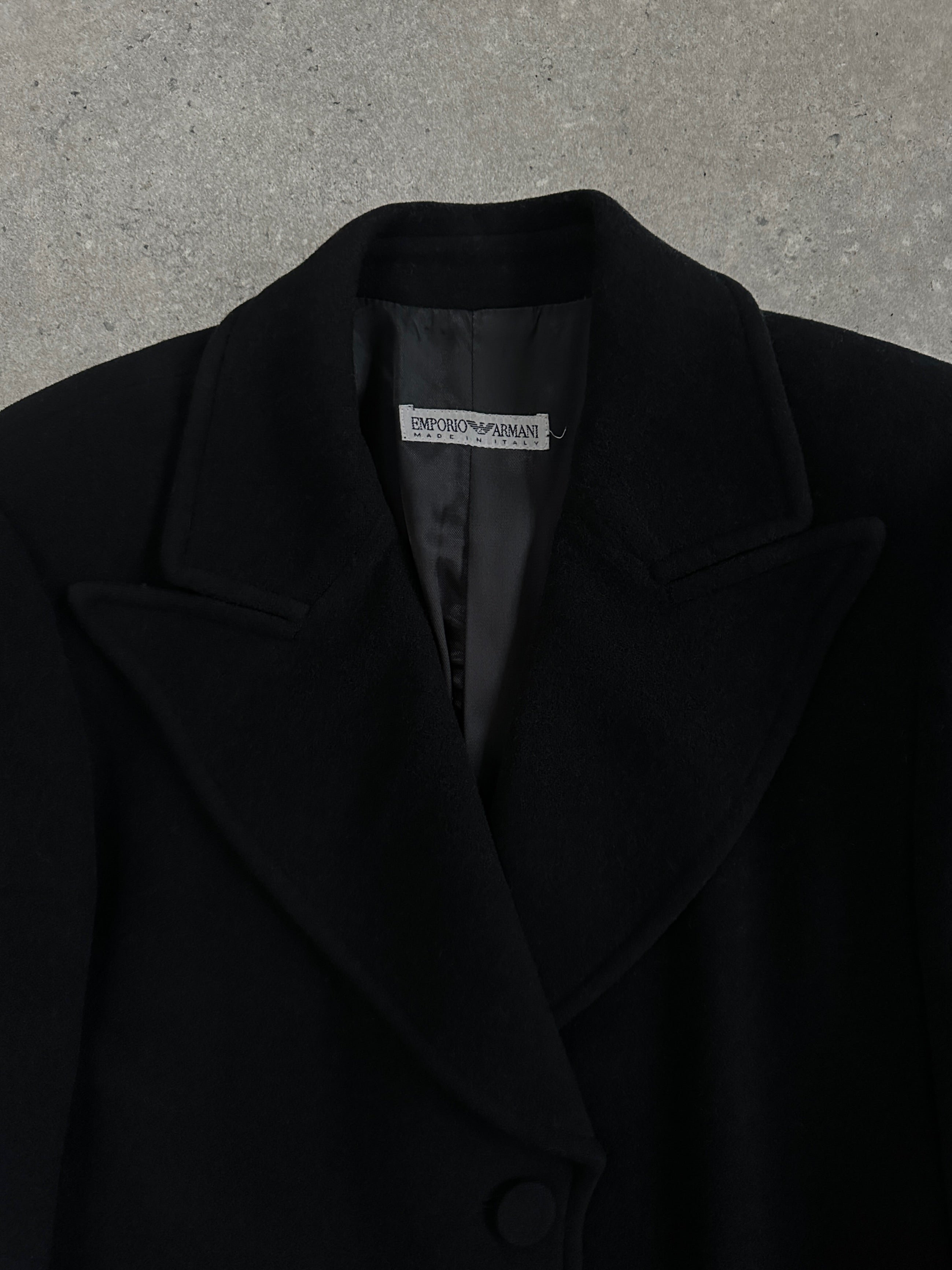 A vintage 1990s Emporio Armani tailored coat in black with a dramatic oversized lapel and clean architectural lines. A refined outerwear piece that reflects the brand’s sharp minimalist tailoring from the era.