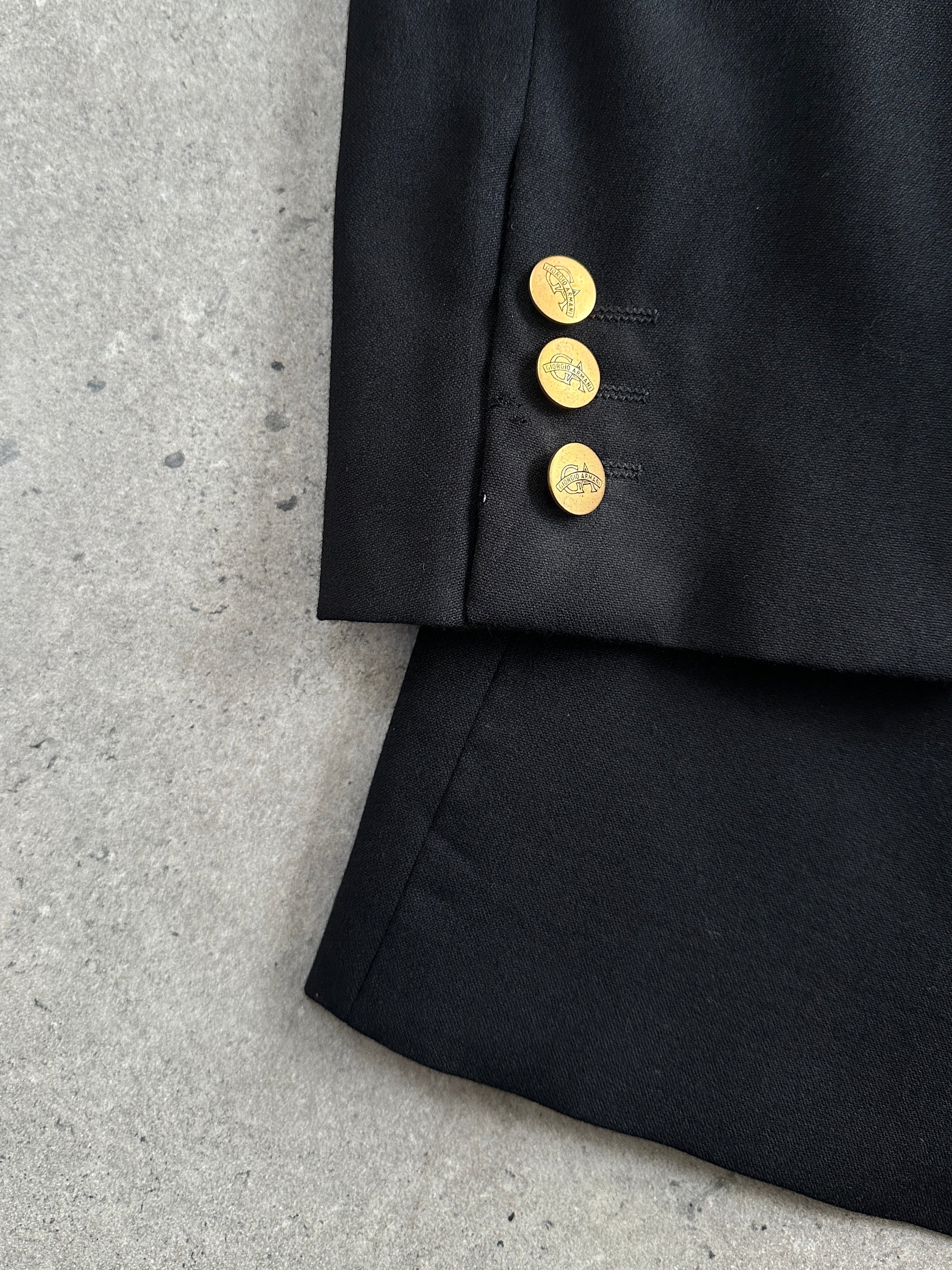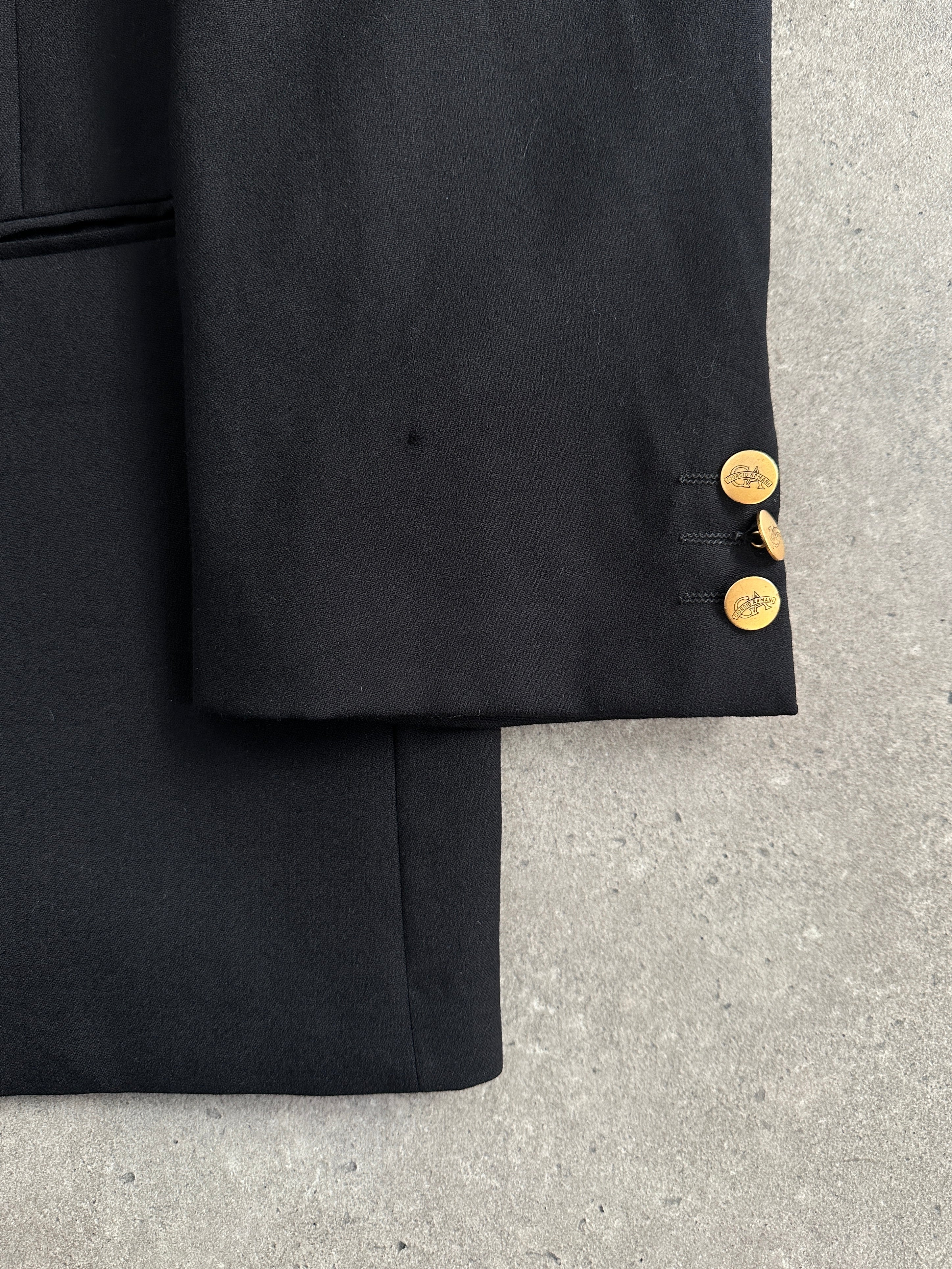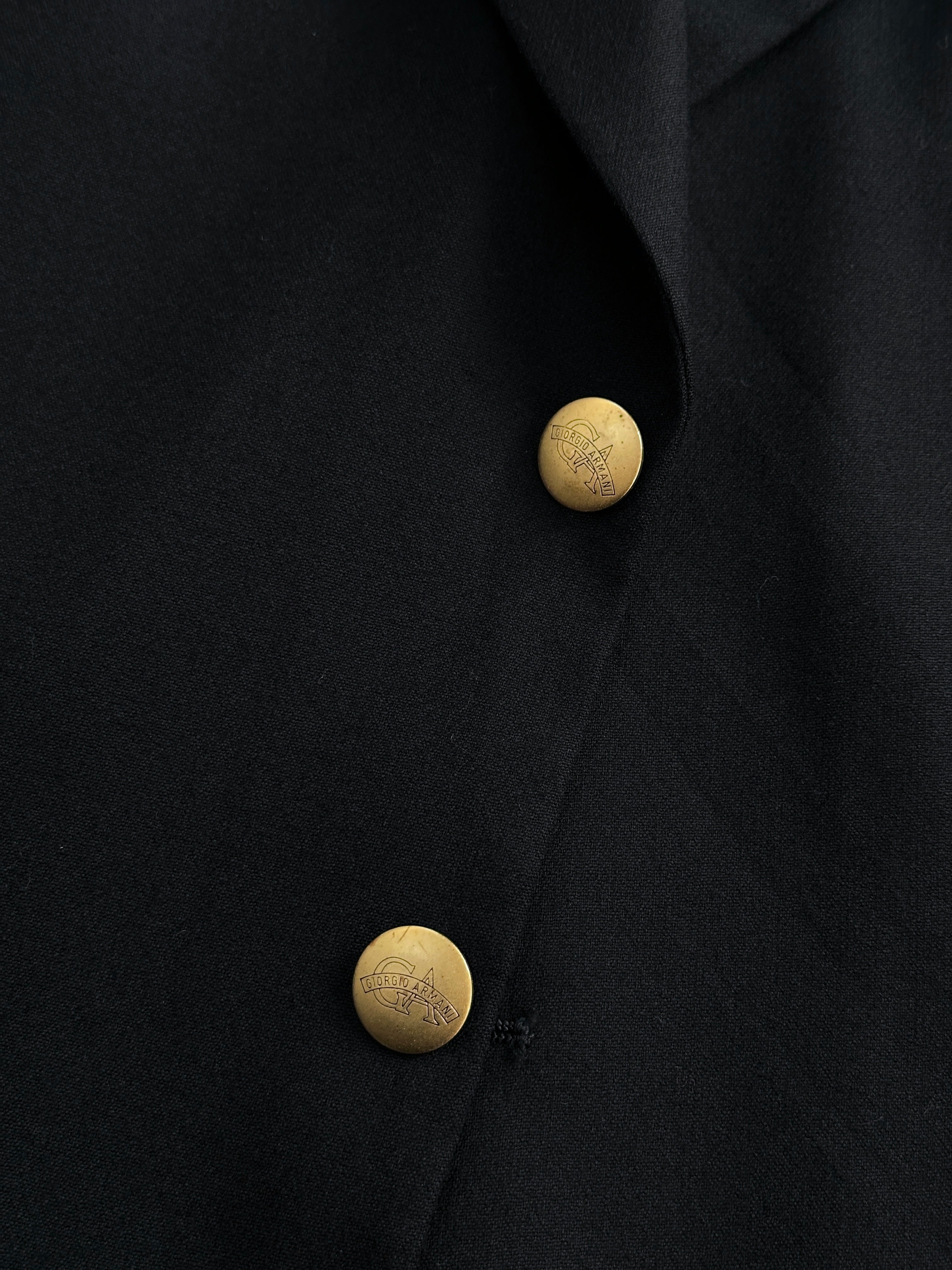 A vintage 1990s Giorgio Armani single breasted blazer in a deep navy tone with signature gold GA buttons. Clean tailoring with subtle structure that reflects Armani’s refined and quietly confident approach to menswear.