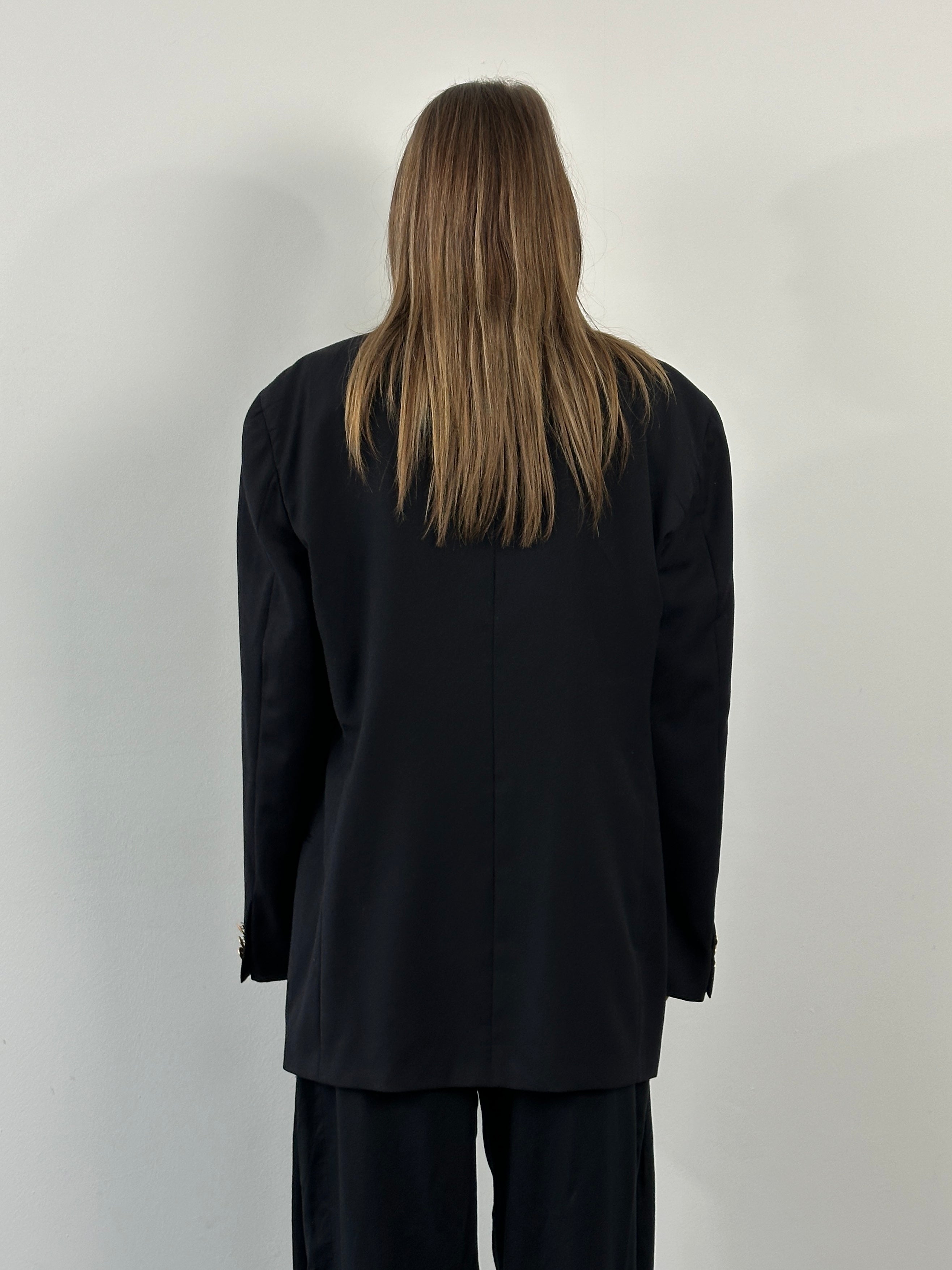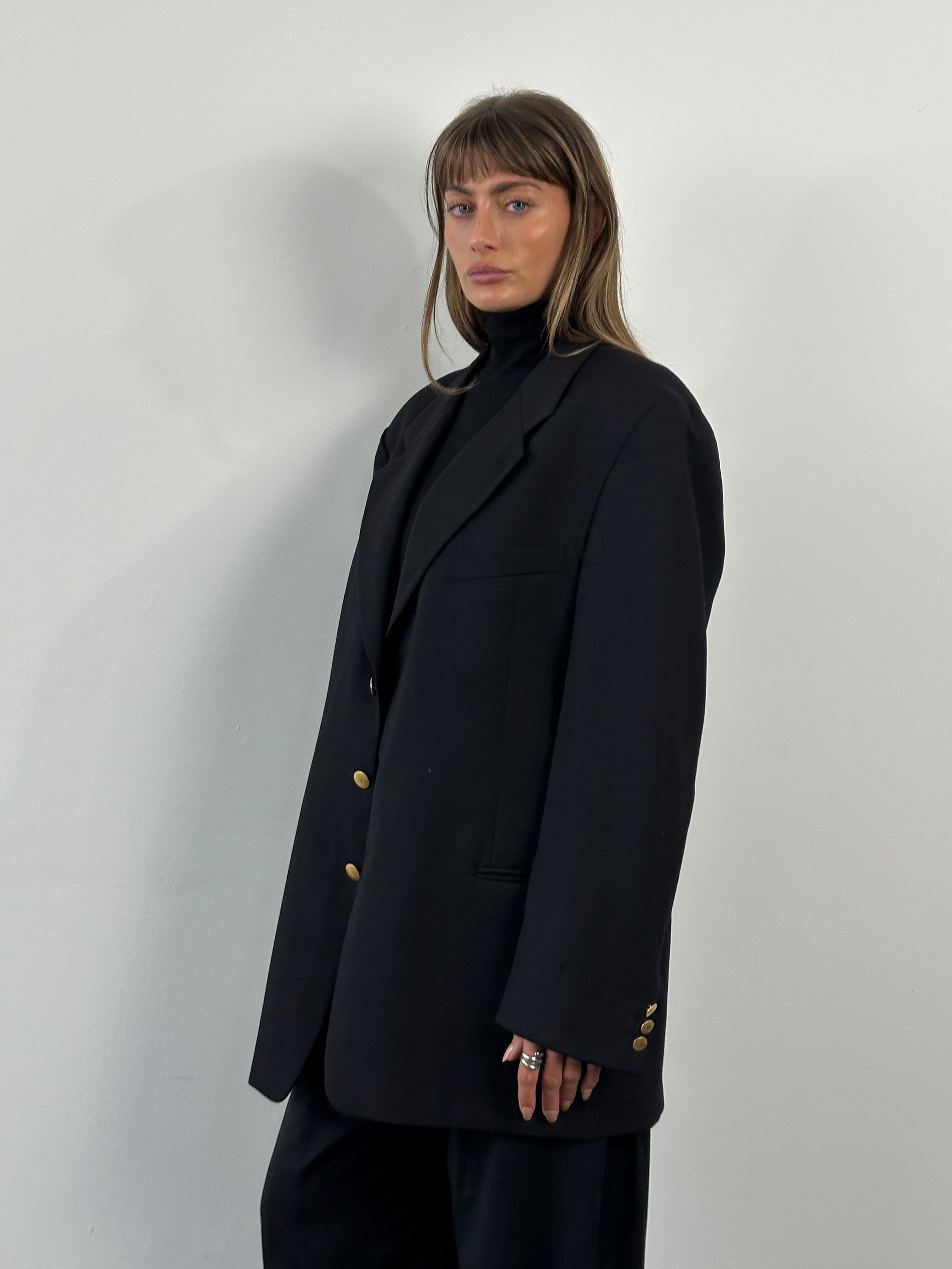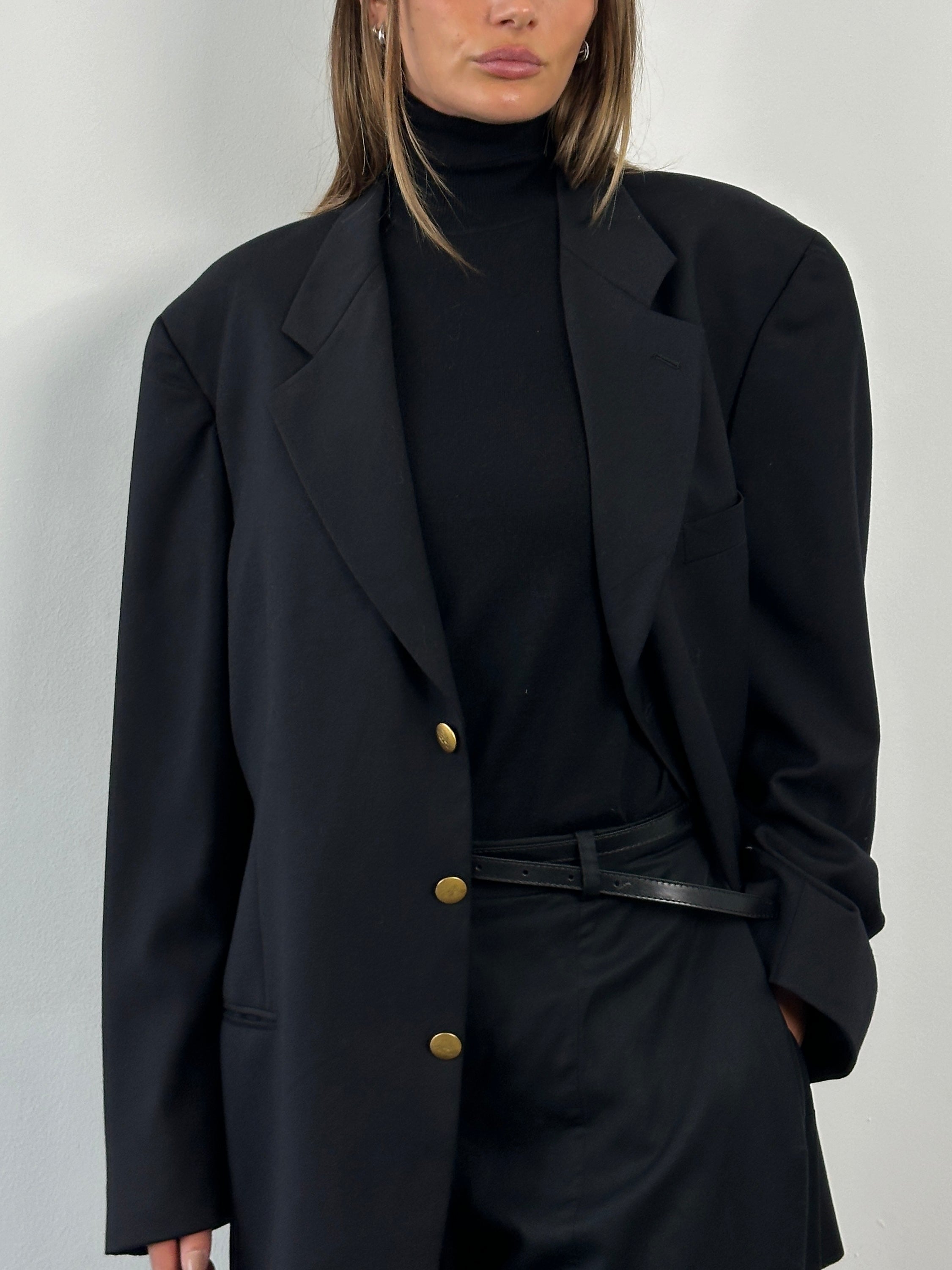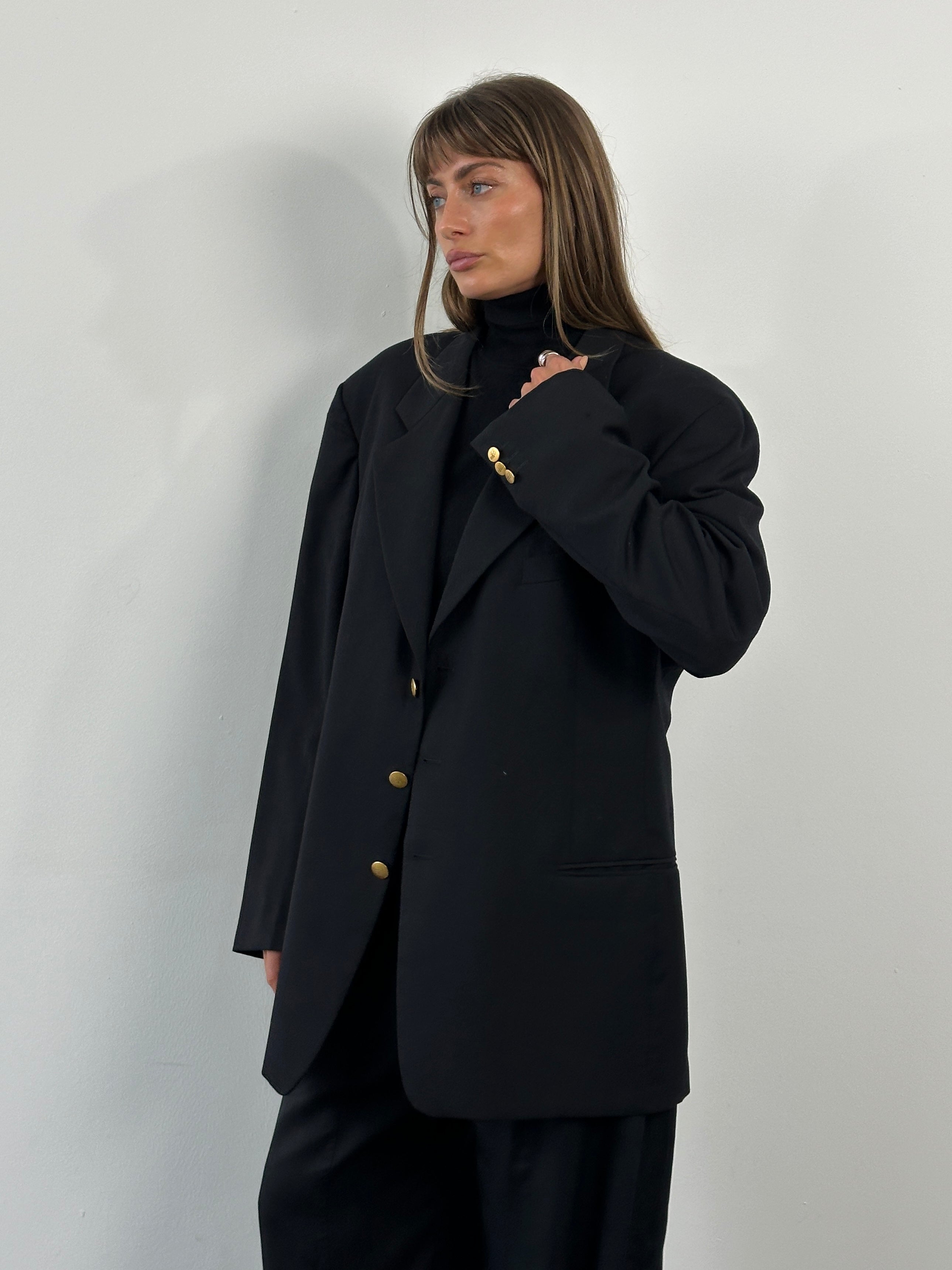 A vintage 1990s Giorgio Armani single breasted blazer in a deep navy tone with signature gold GA buttons. Clean tailoring with subtle structure that reflects Armani’s refined and quietly confident approach to menswear.