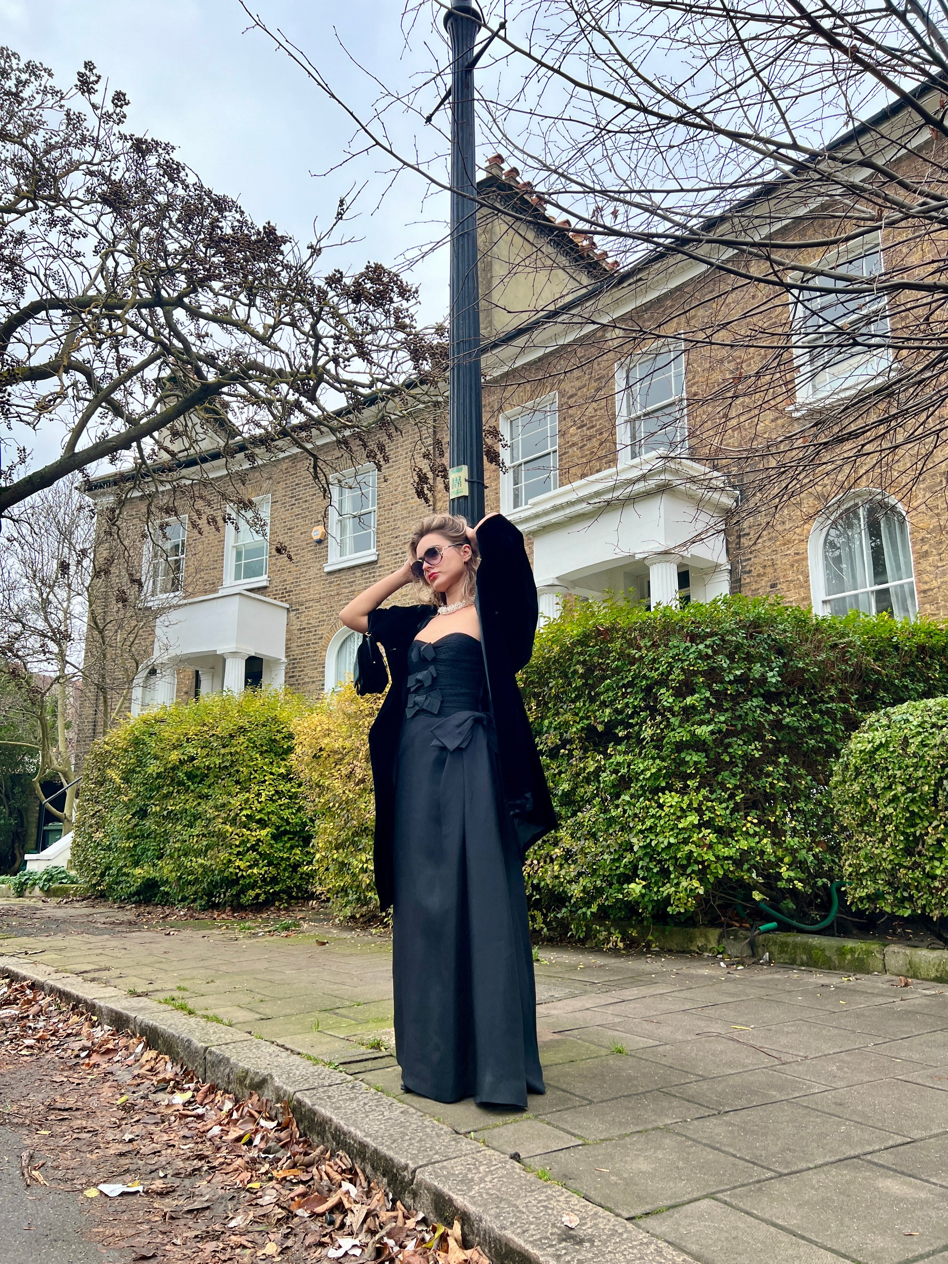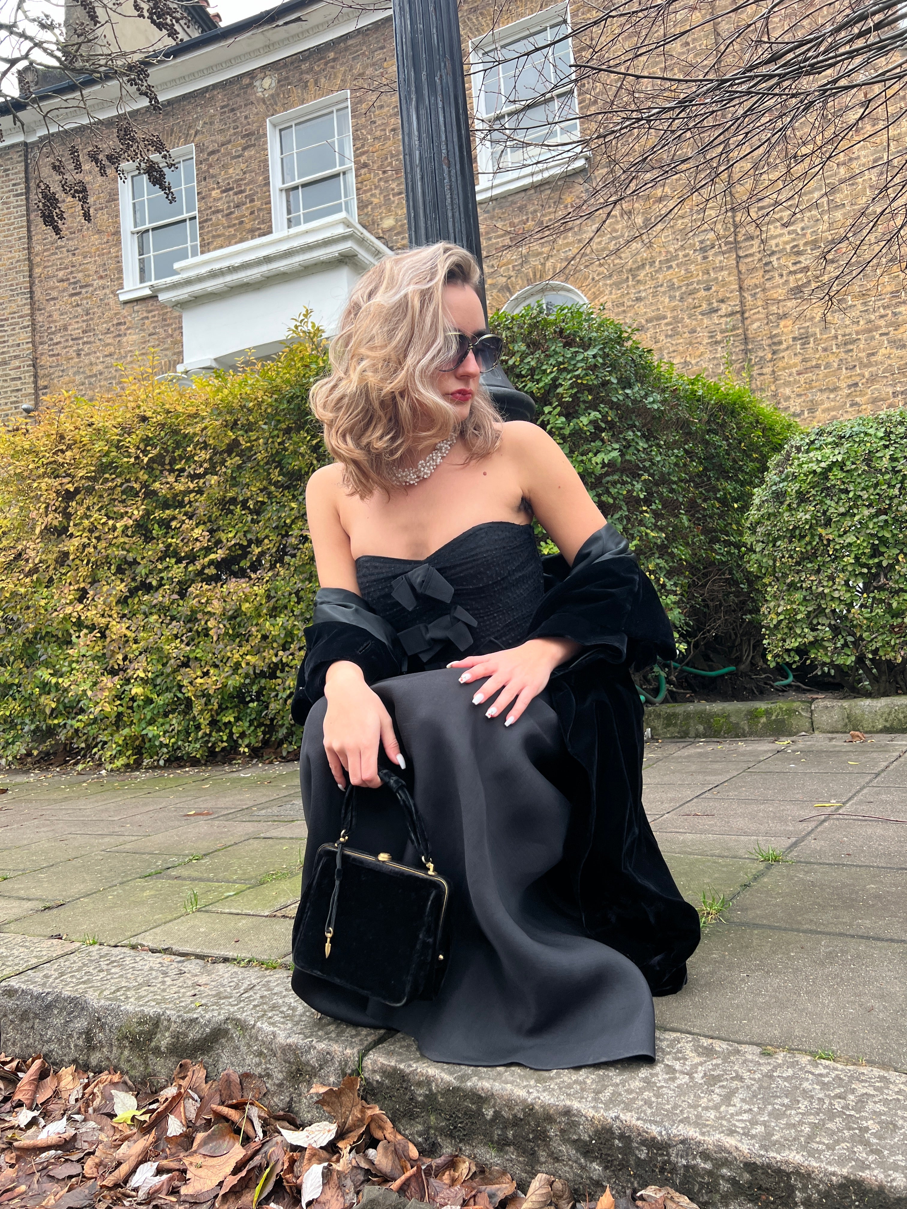 This show-stopper of a gown from Yves Saint Laurent dates back to 1987. A truly stunning strapless dress that could easily become your go-to black evening dress, it is in the details that this dress really shines. Adorned with layereds of frothy polka-dot tulle, the bodice is finished at the centre with three bows crafted from thick black grosgrain ribbon. The bodice is boned and has a flattering sweetheart neckline, softened by the polka-dot tulle. The full, cocooning skirt is crafted from a thick silk twill and tailored to a straight silhouette. A single soft pleat falls from under a floppy silk twill bow that sits atop the left hip, mirrored by another single pleat at the rear of the dress. Inside, this gown is fully lined with black cotton. It fastens under the left arm with a concealed black zip.