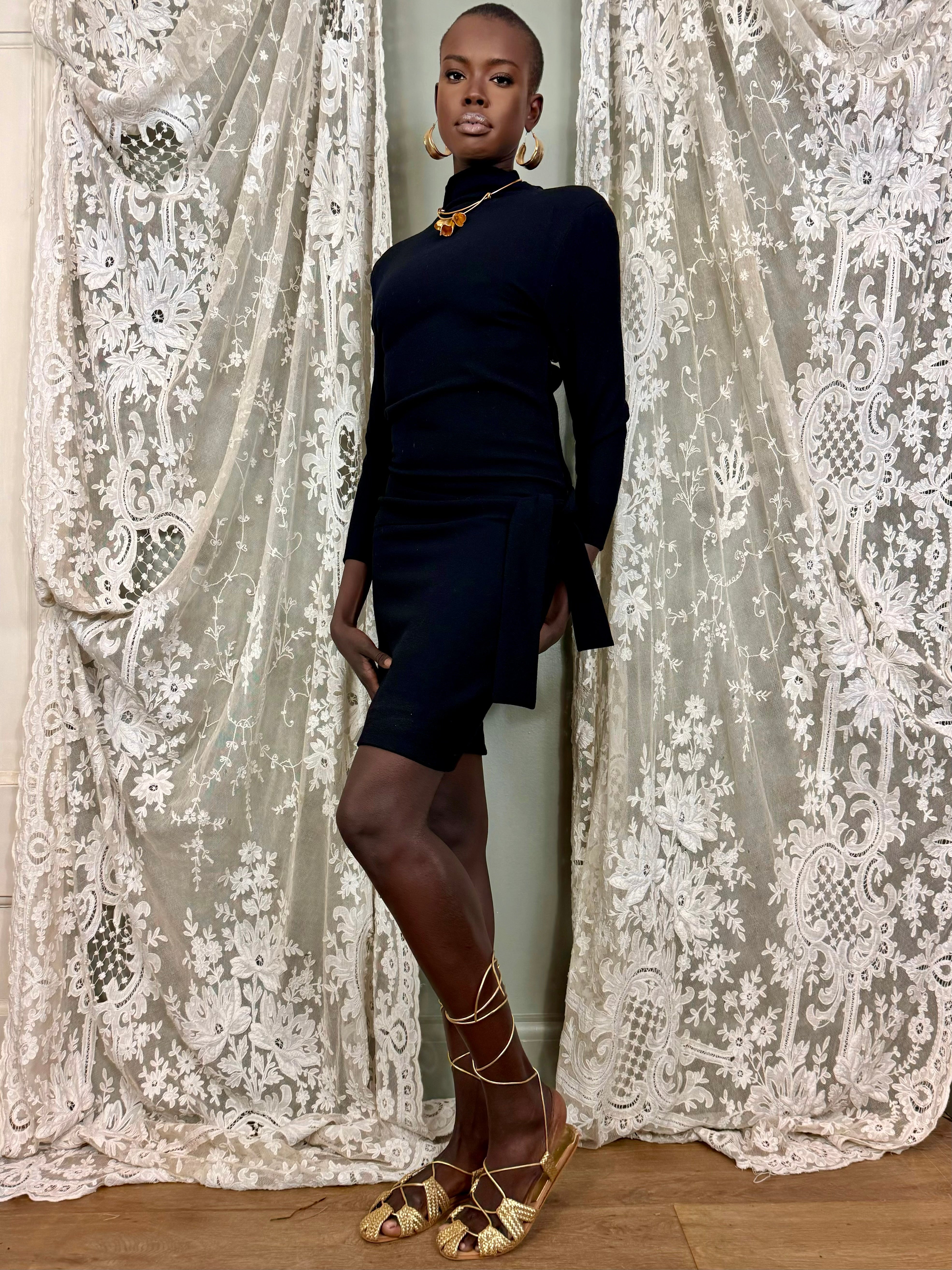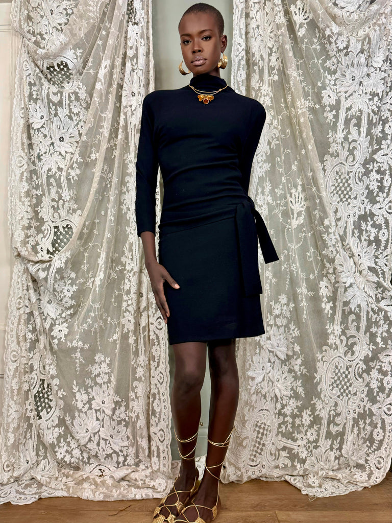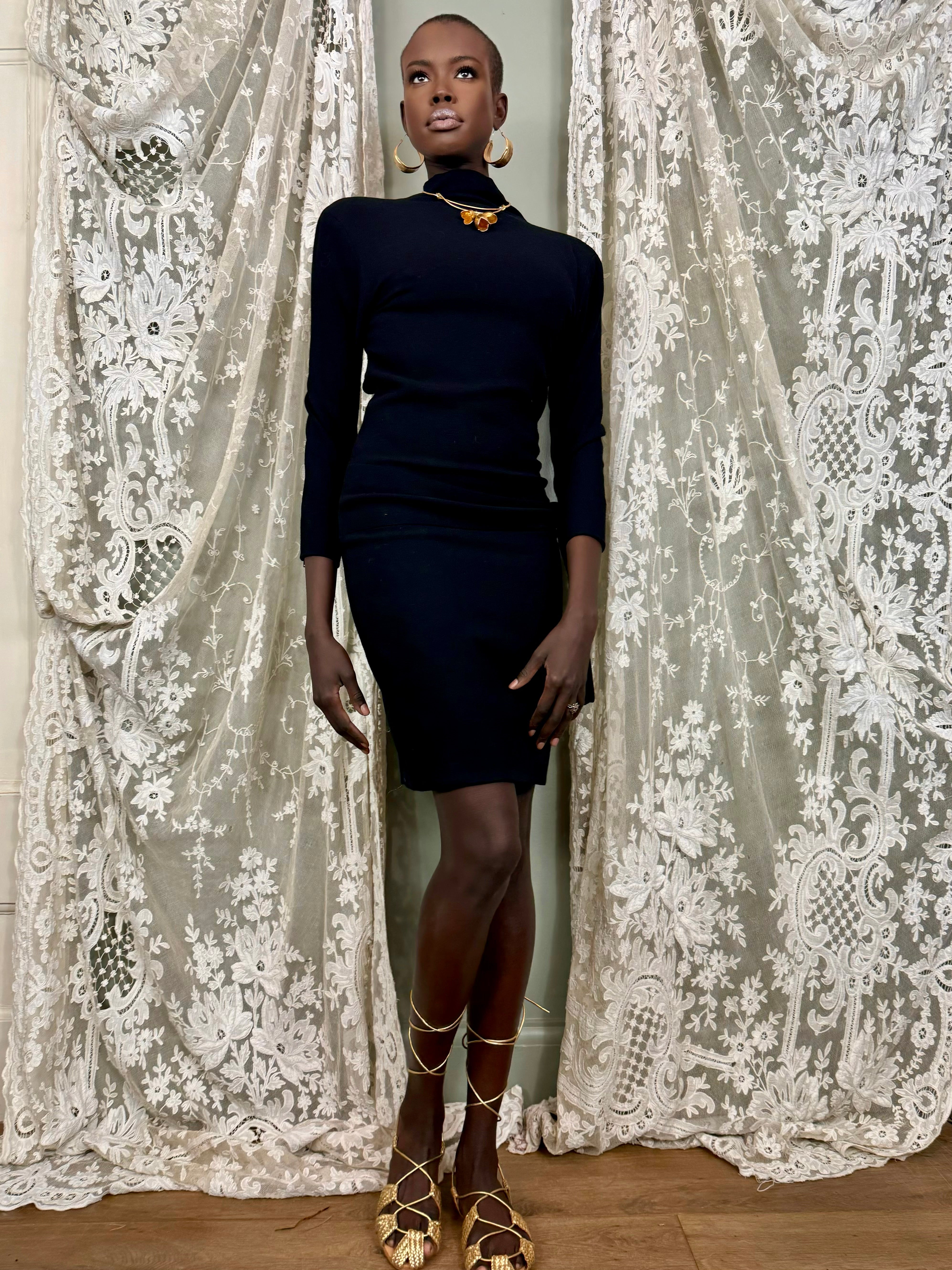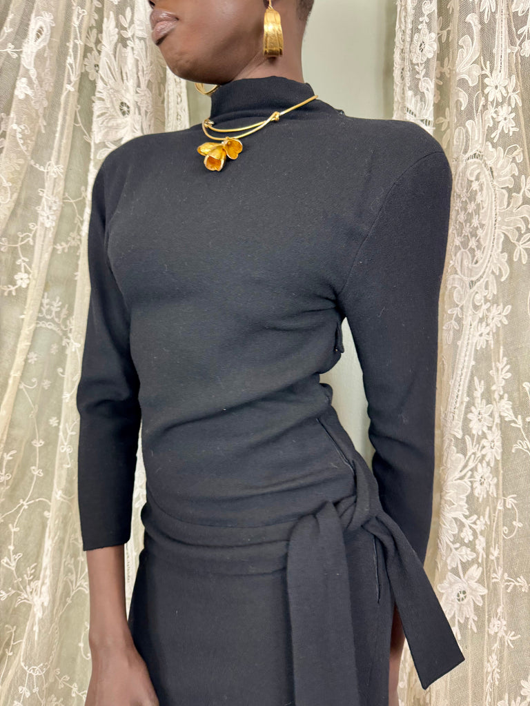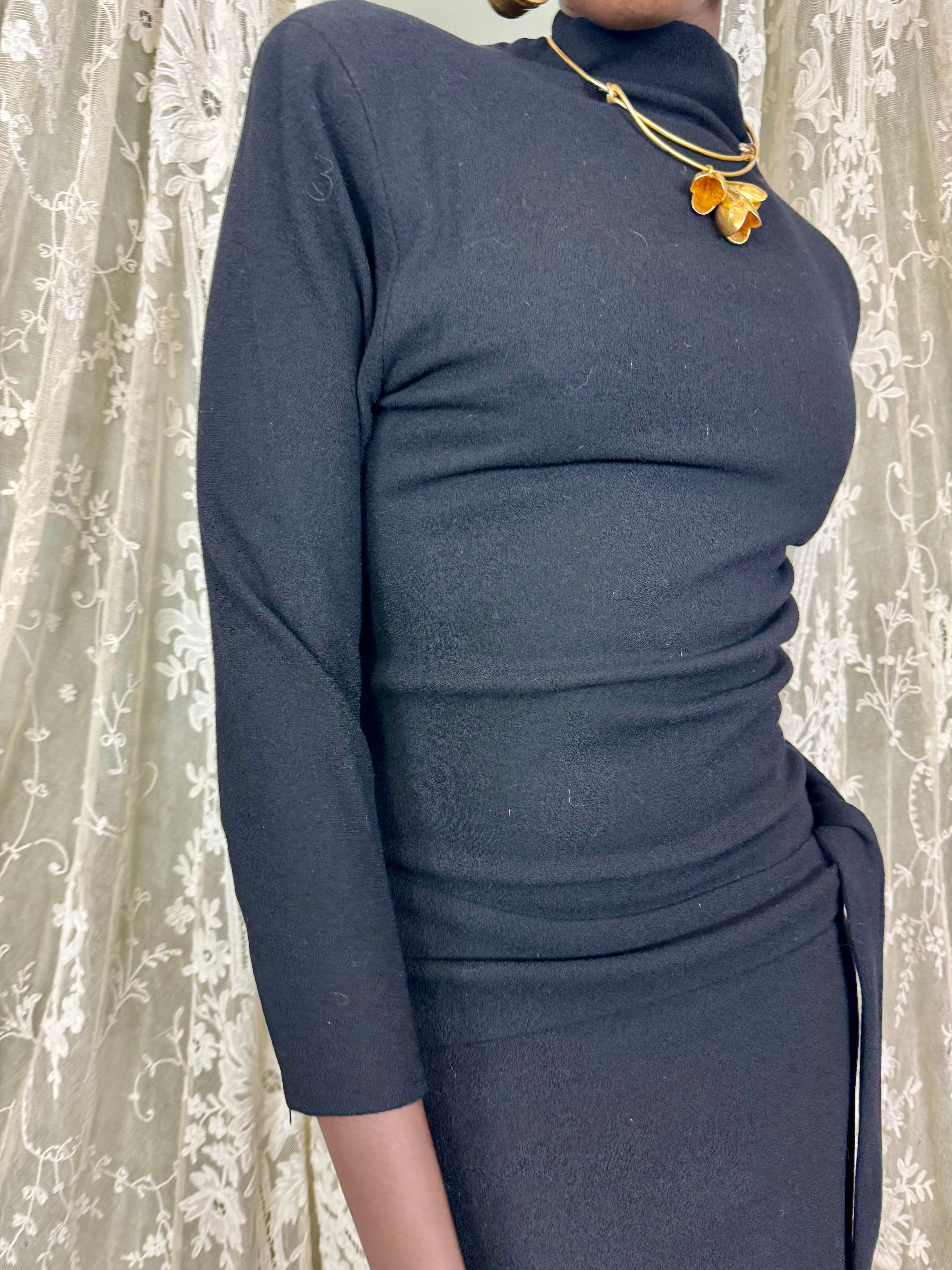 Elevate your wardrobe with this versatile Christian Dior 90s dress. With a high neckline and long sleeves, this crepe dress exudes elegance and class. The keyhole design on the back adds a touch of sophistication. The side black tie cinches the hips for a flattering, straight fit.