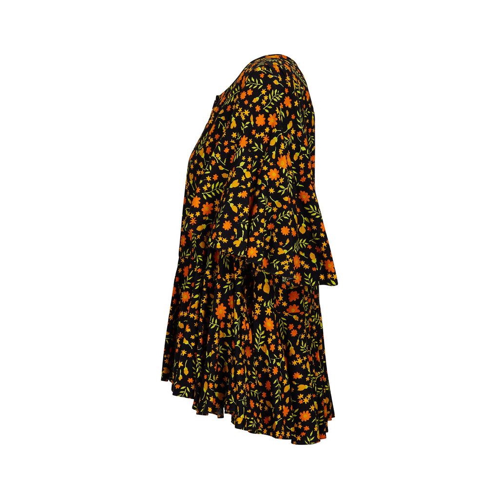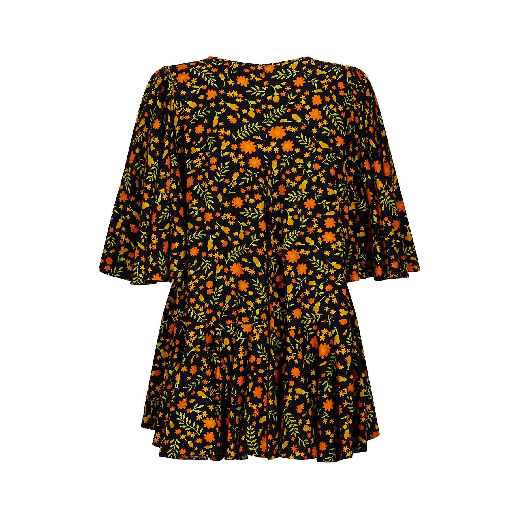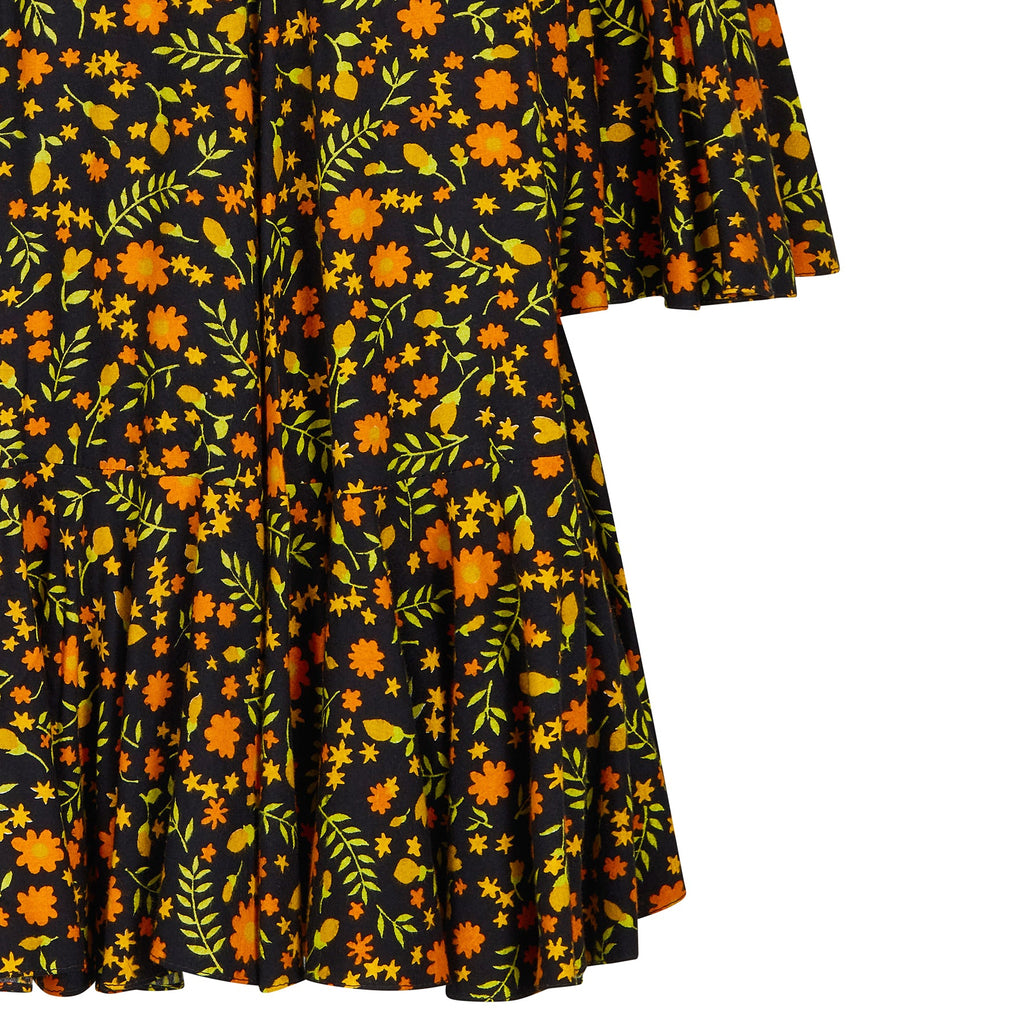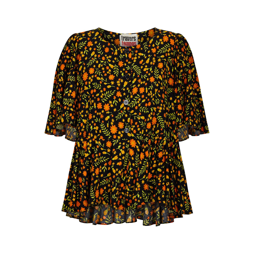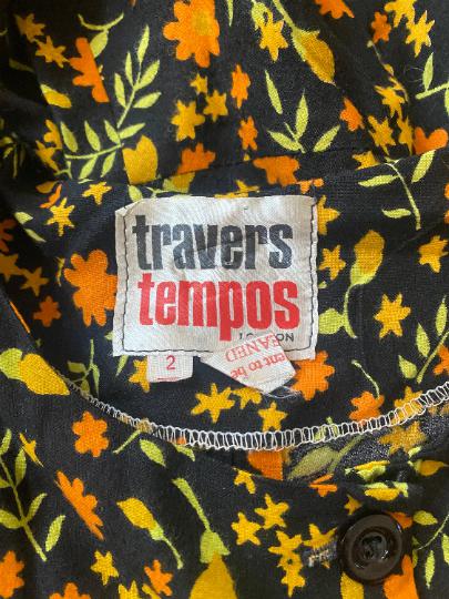 This collectable Travers Tempos top originates from the very late 1960s or early 1970s at the height of the London Fashion scene of the swinging 60s. An oversized style featuring a vibrant, repeat floral print in yellow, orange, green and black and in a tactile flock cotton fabric. It has a round neck and fastens to the front with a central button stand and four buttons. The blouse flows from the shoulders to the hem and there is a tremendous amount of fabric with the addition of the trumpet sleeves with a full circle flounce.