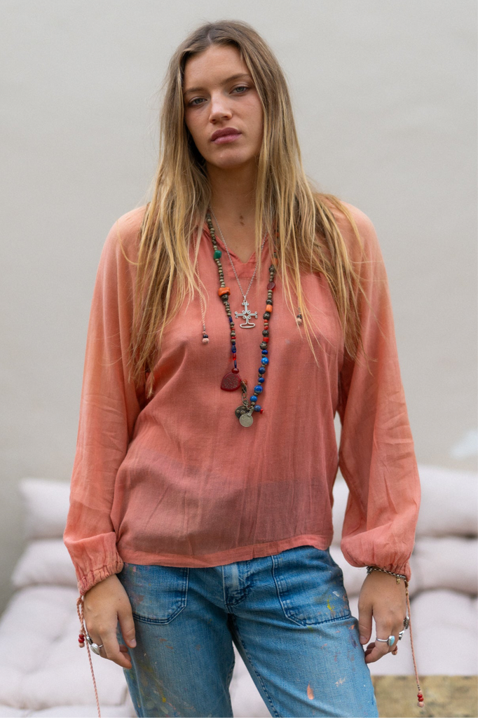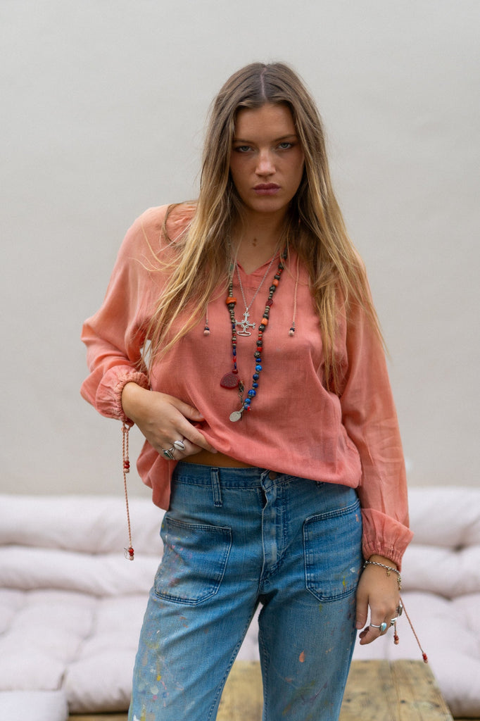 1970S PHOOL COTTON BLOUSE. FADED PEACH TONE, SMALL FRILL ON THE COLLAR AND ROPE TOES AT THE CUFFS. THIS PIECE HAS NATURAL SUN FADING.