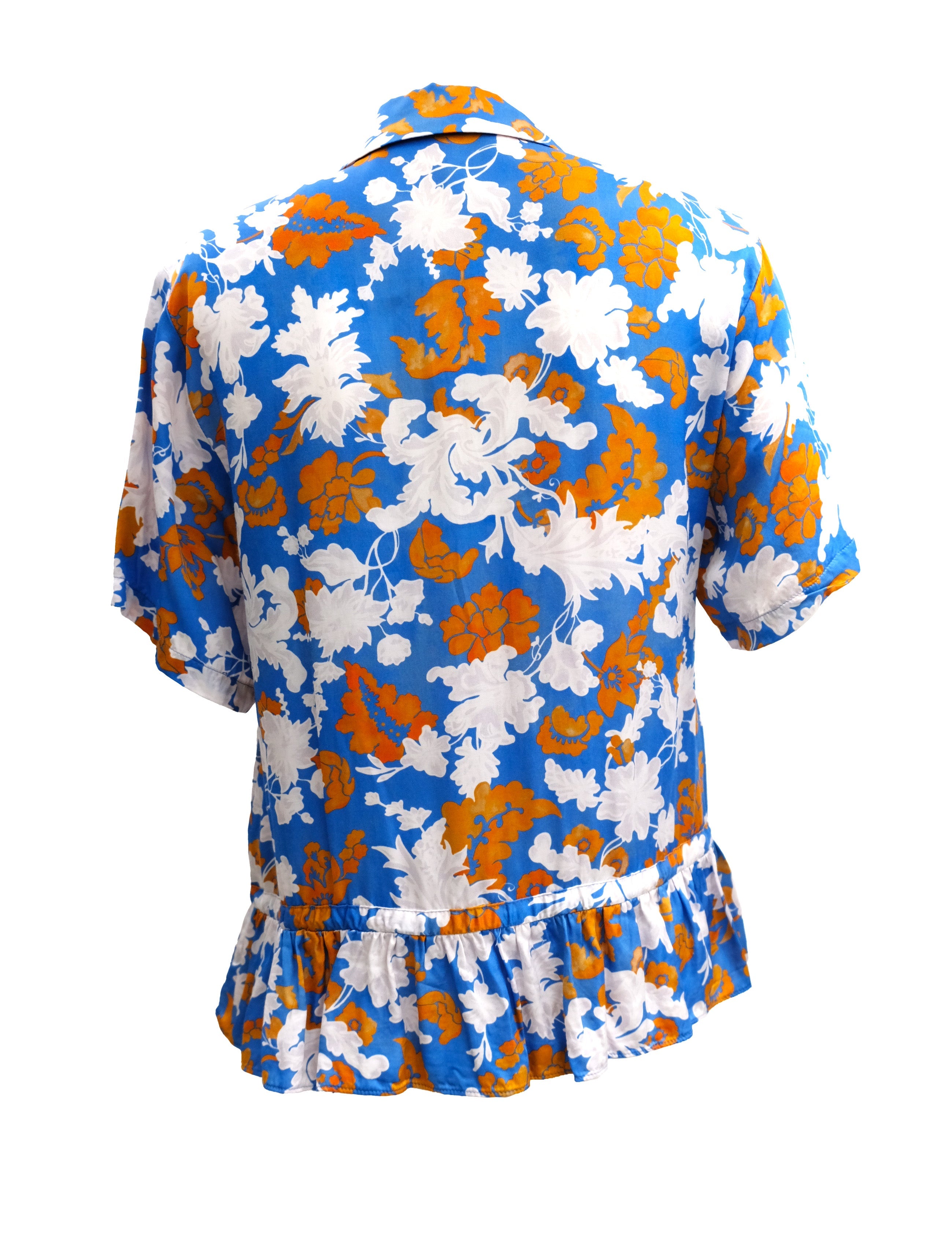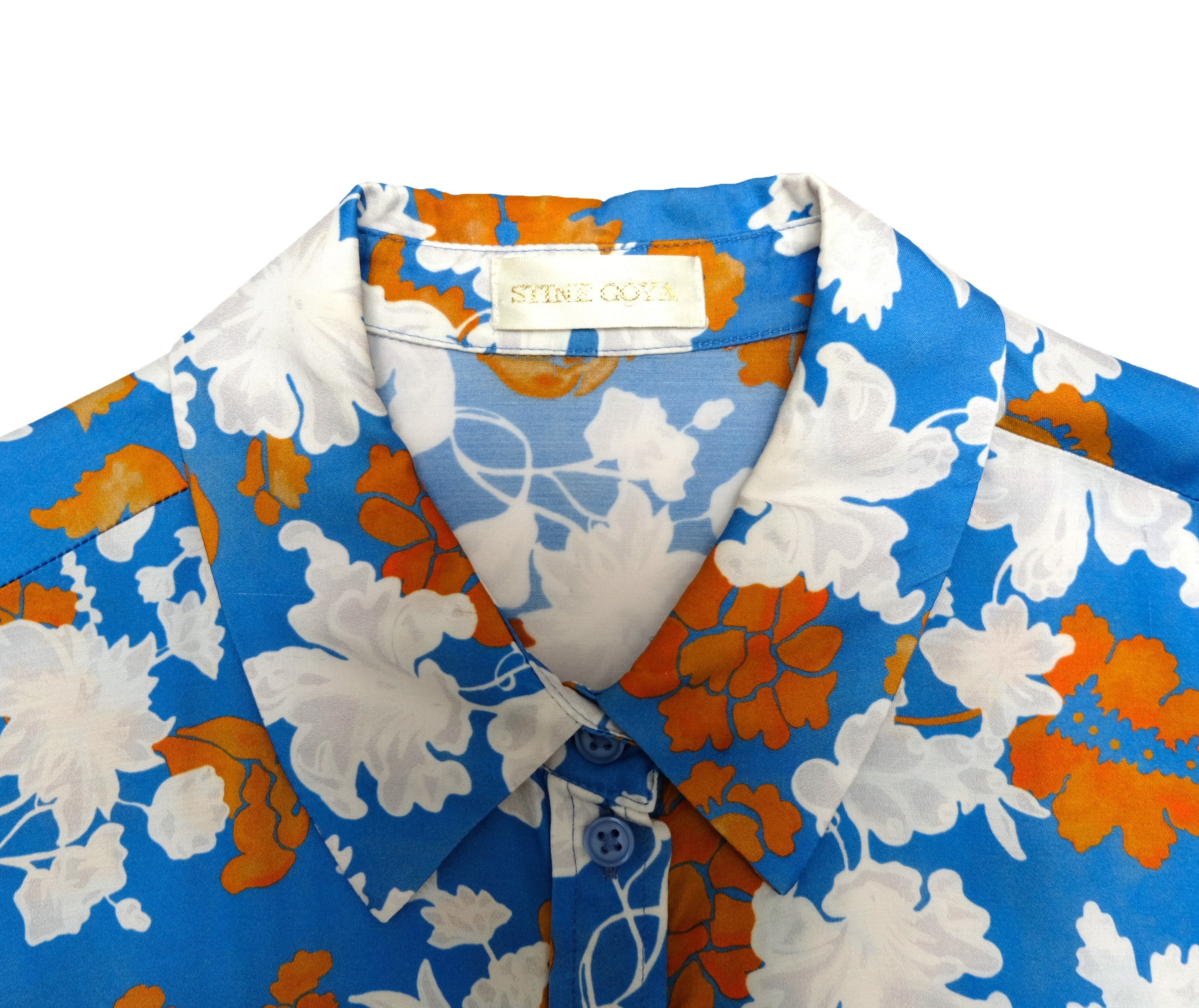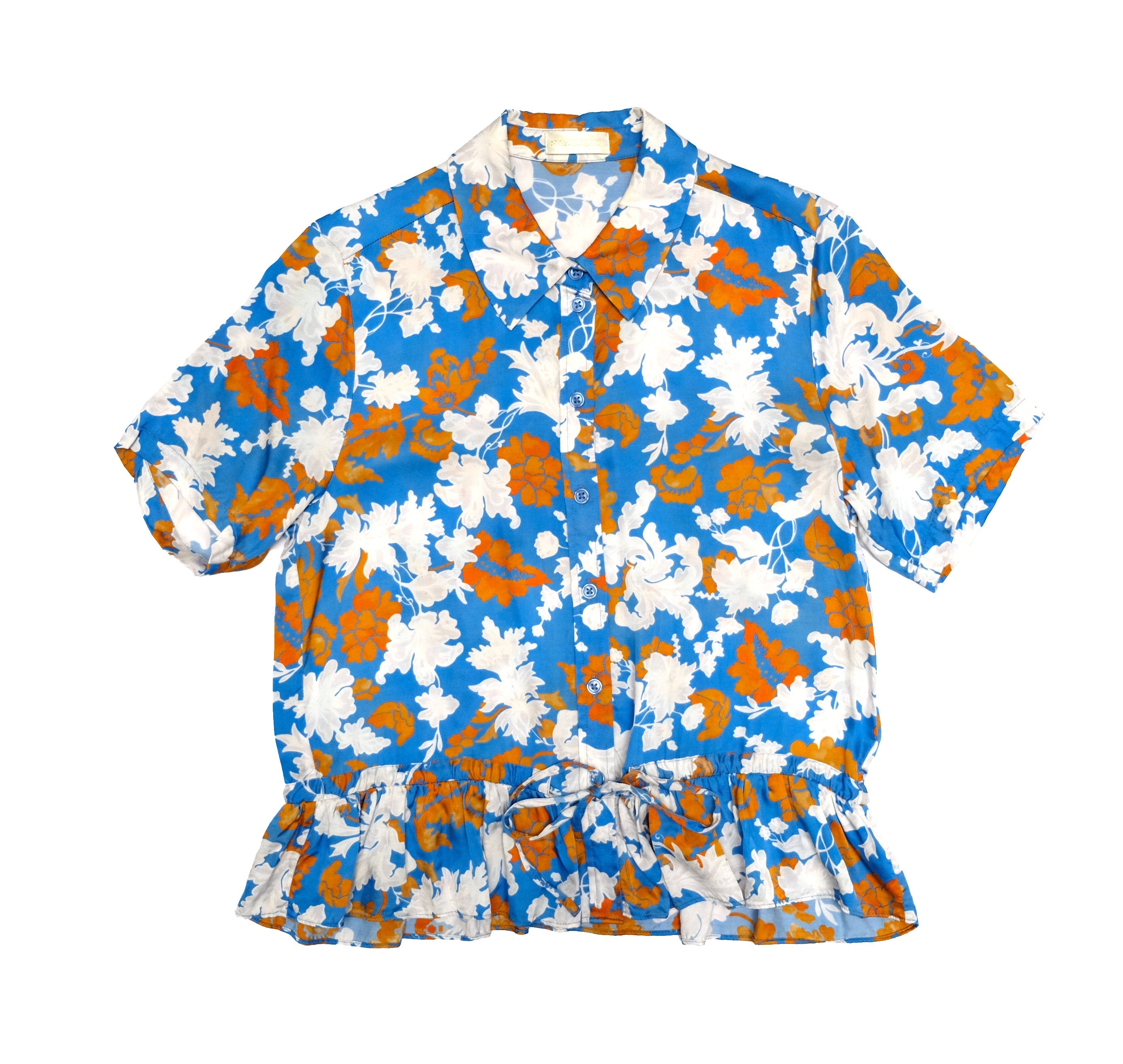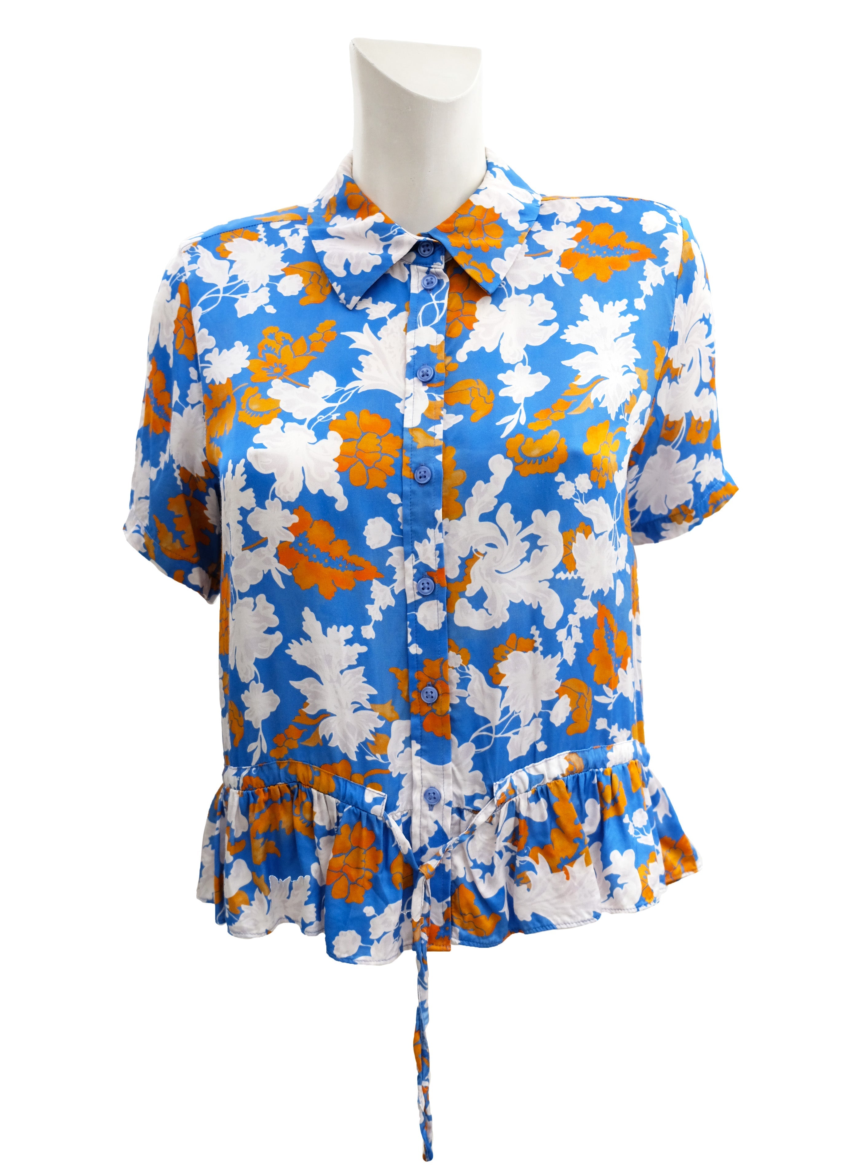 A summery blouse by Stine Goya, in fresh floral print, with white and orange flowers on a cobalt blue background.