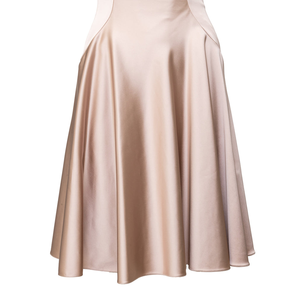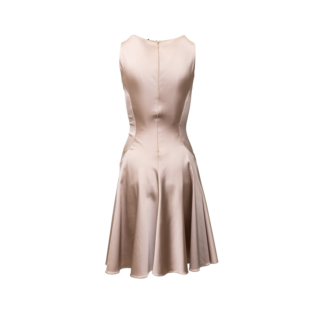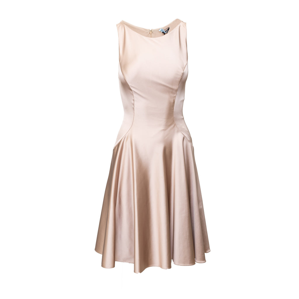 This Blumarine dusty pink sleeveless dress features a flattering a-line silhouette that falls gracefully from the waist. The pleated fit on the upper and boatneck add subtle details to this elegant and versatile satin dress.