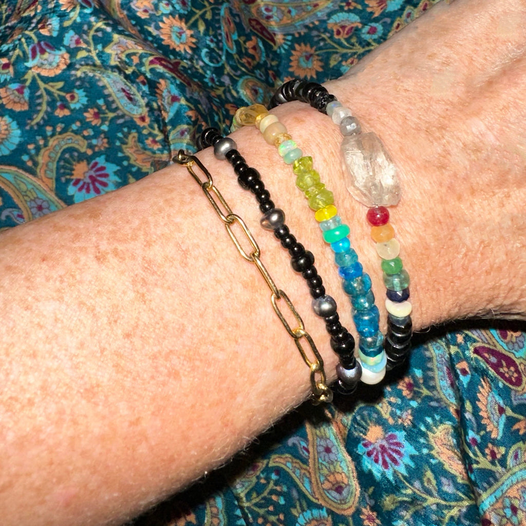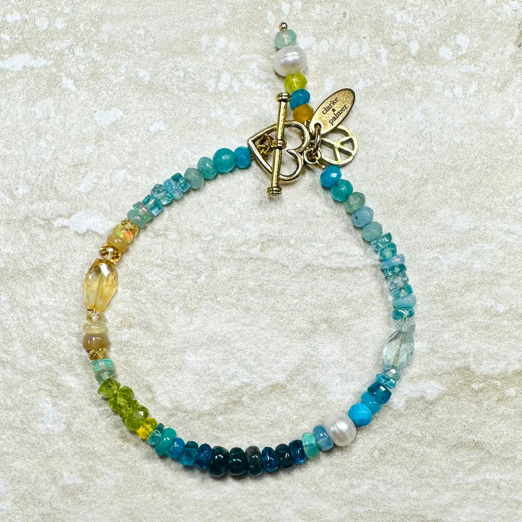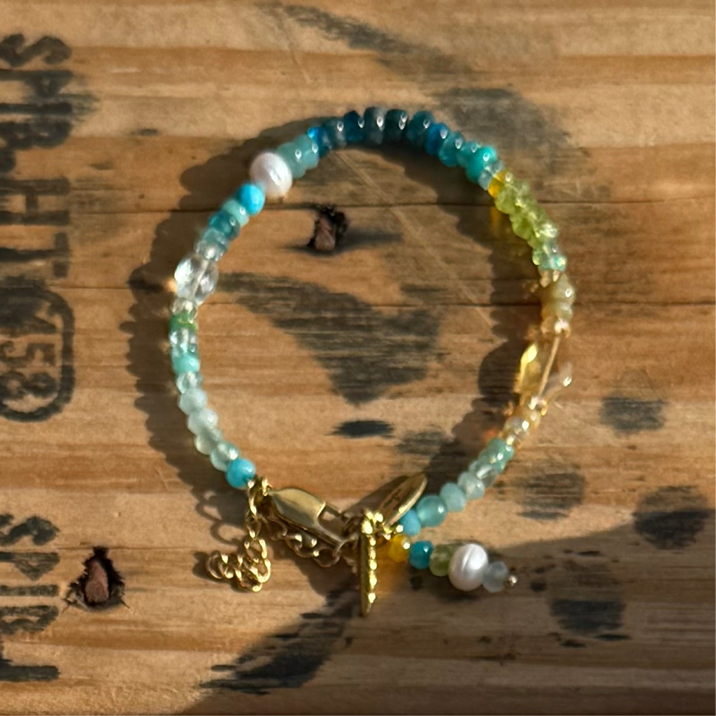 Our stunning Dream Beach Bracelet is handmade from ombré shades of sustainably sourced gemstones. It includes hand cut opal, aquamarine, apatite, citrine, topaz, pearl, peridot and pearl rondelles. It has a 22 kt gold cz star and a pearl and gemstone charm.