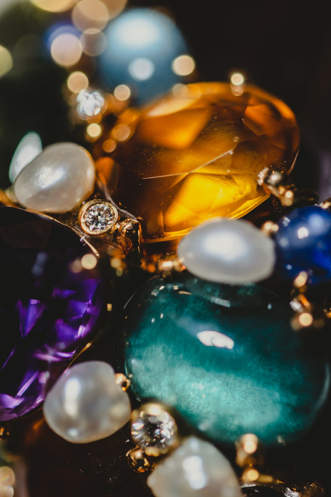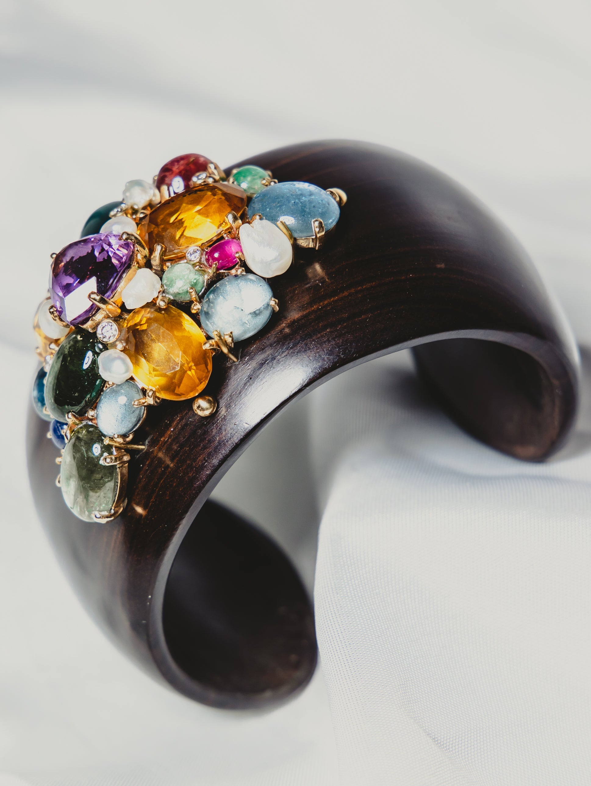 Materials: Sapphire, citrine, aquamarine, ruby, tourmaline, emerald & diamond in 14K gold, wood
