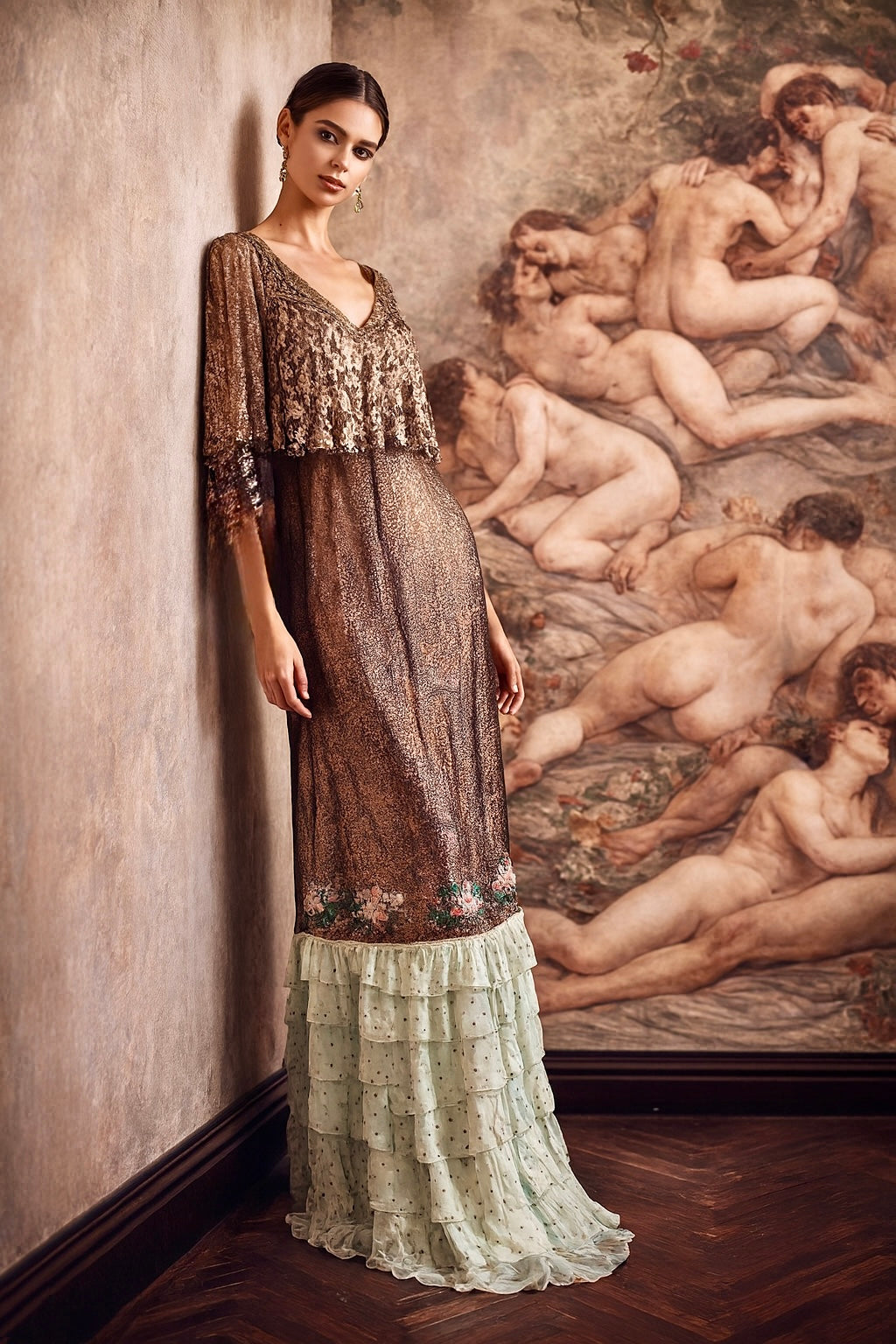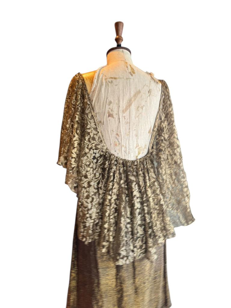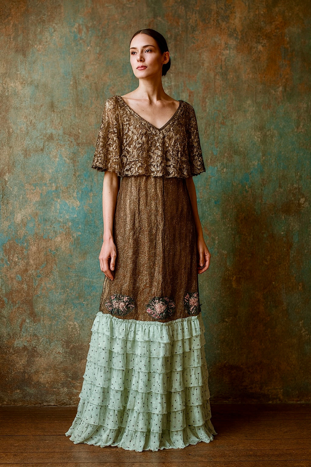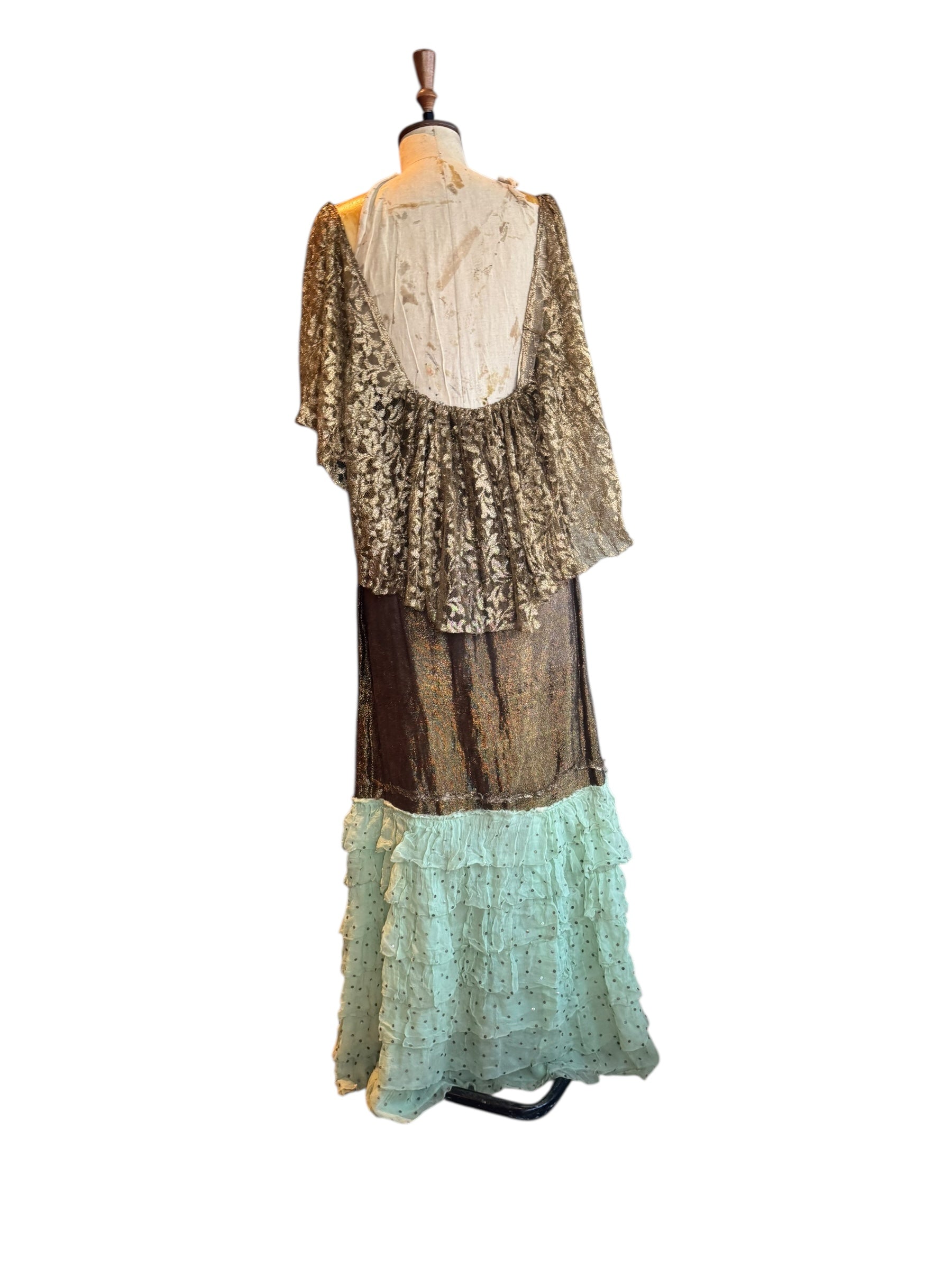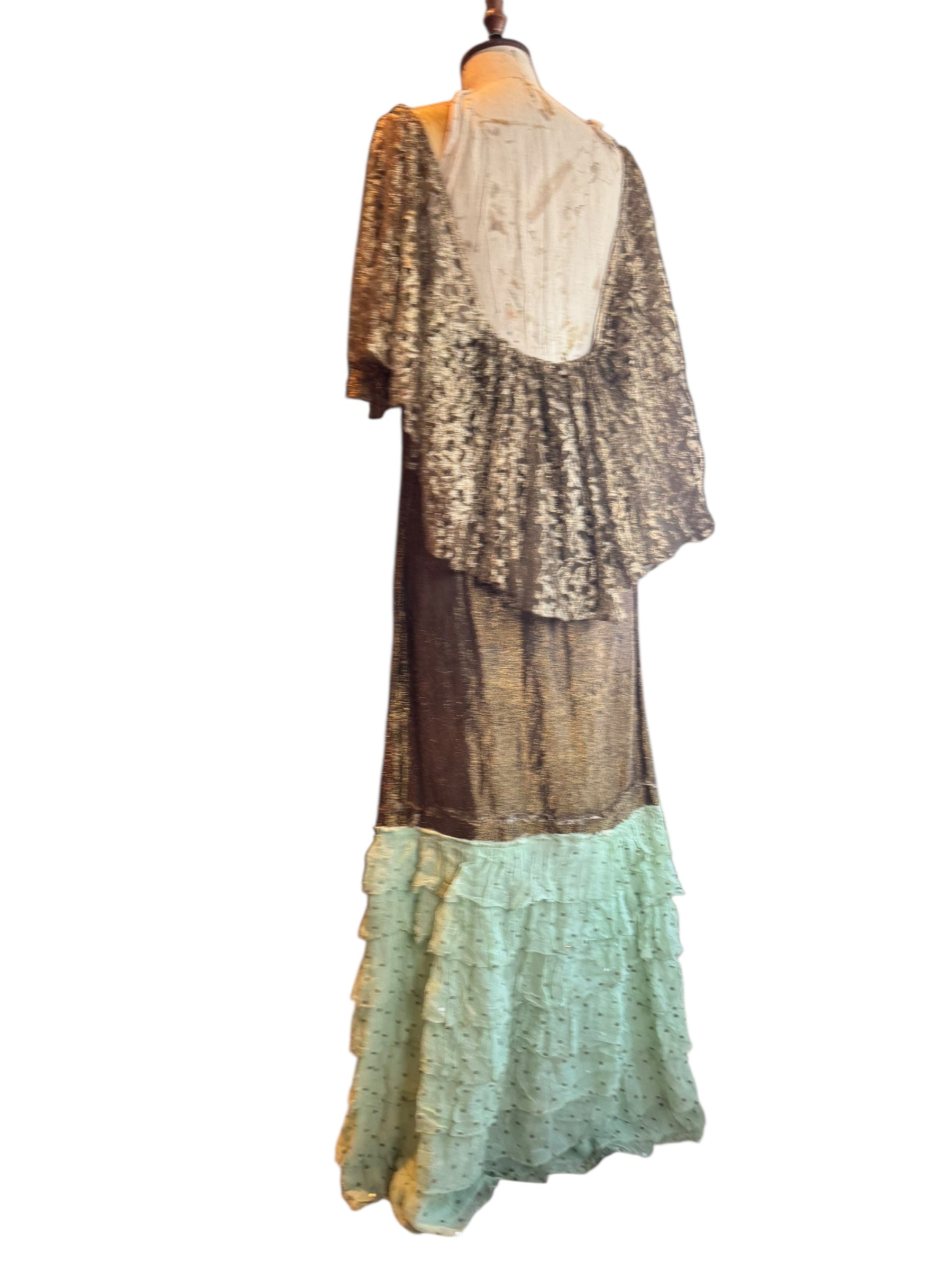 Eris, reworked 20s gold lamé and lace caped dress with pale green chiffon sequins frill fishtail