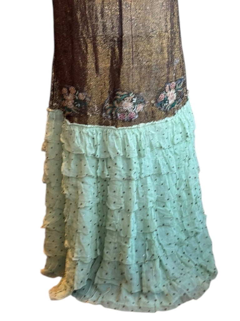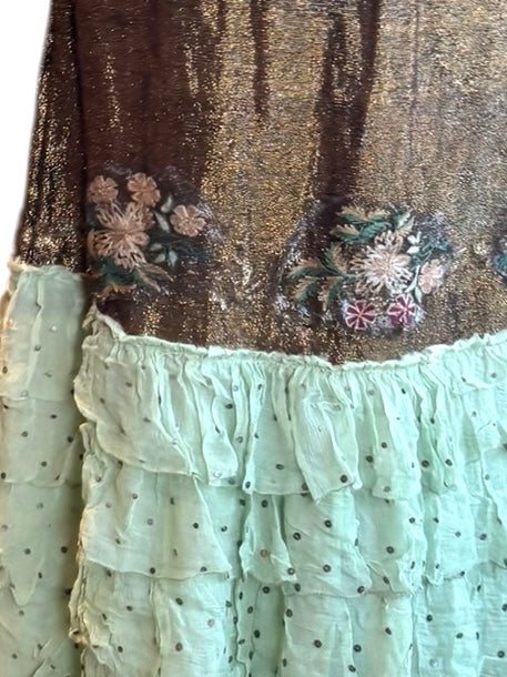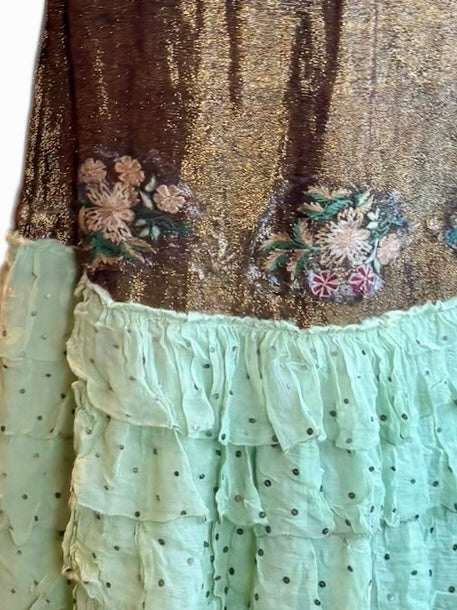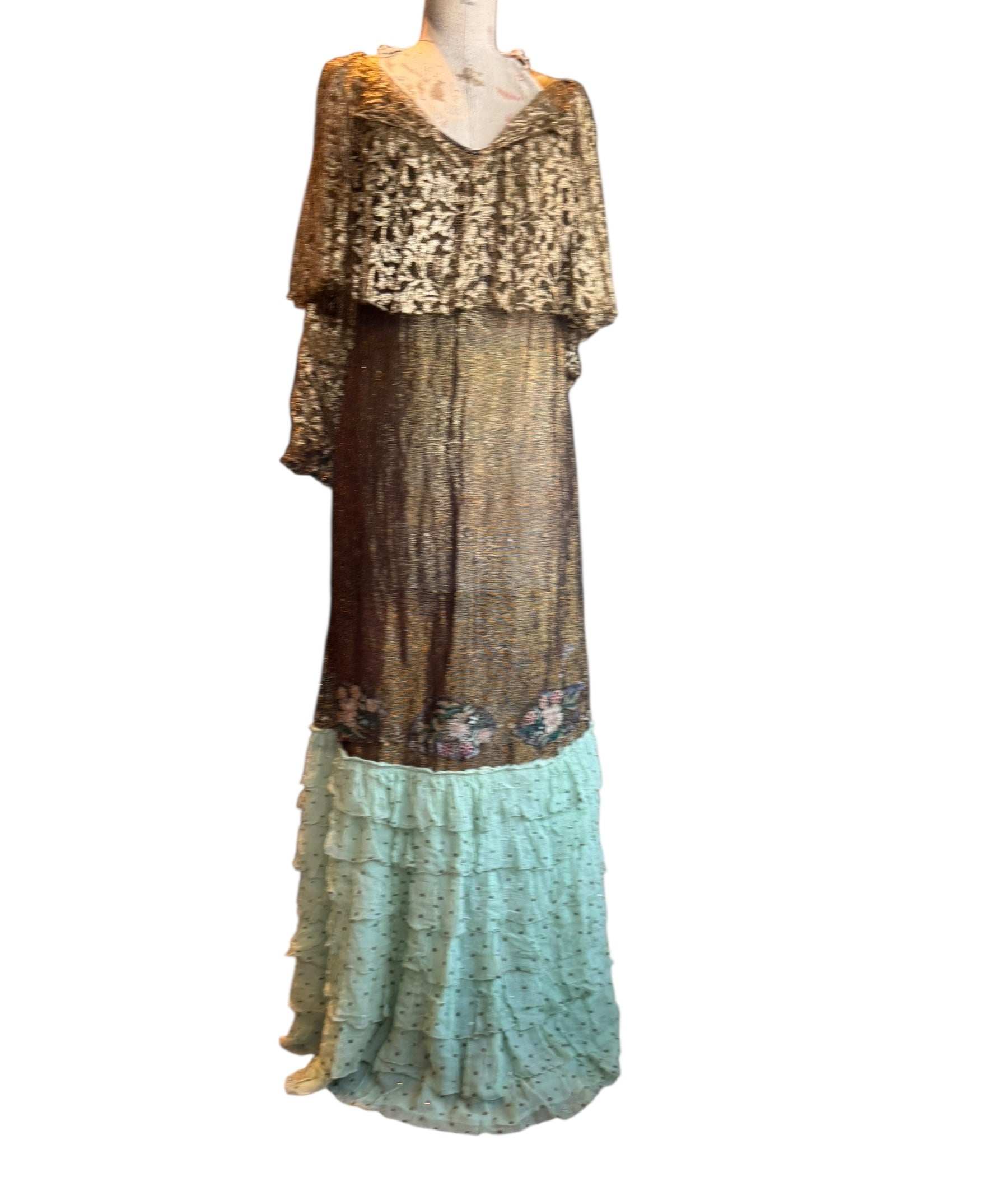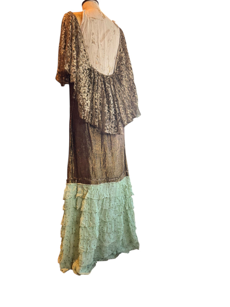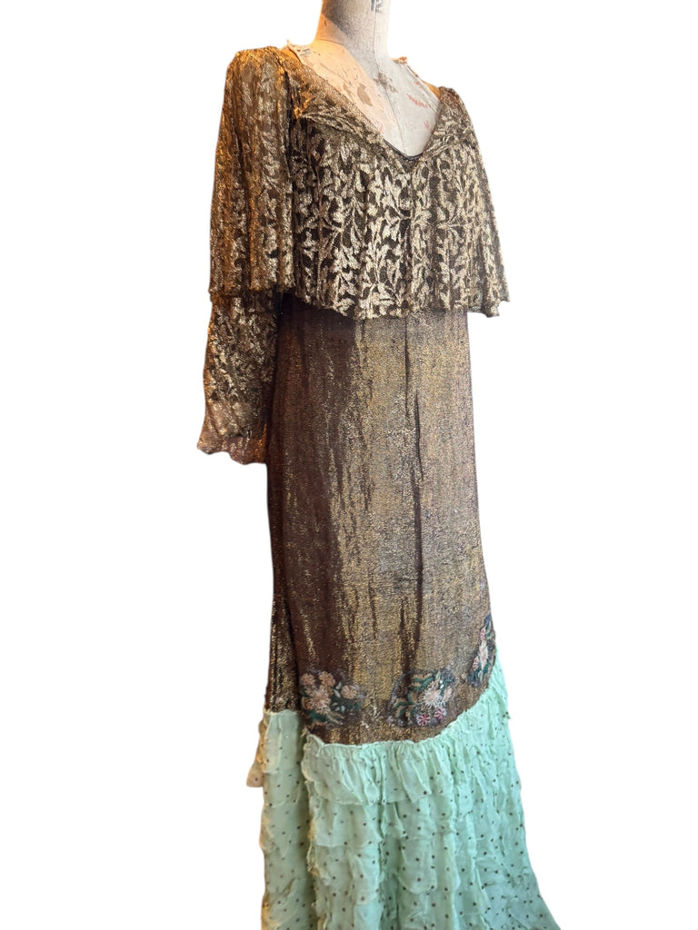 Experience true luxury with this reworked one of a kind gold lamé dress. Featuring a stunning gold lace caped design and a delicate fine point Edwardian floral embroidery on the front seam. The elegant pale green chiffon fishtail adds a touch of ethereal 1920s glamour, creating a captivating mermaid silhouette. A true heirloom piece for any avid collector.