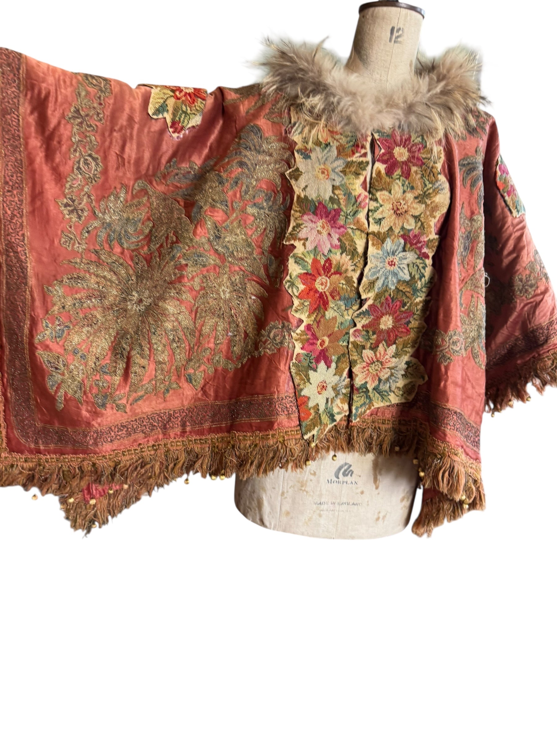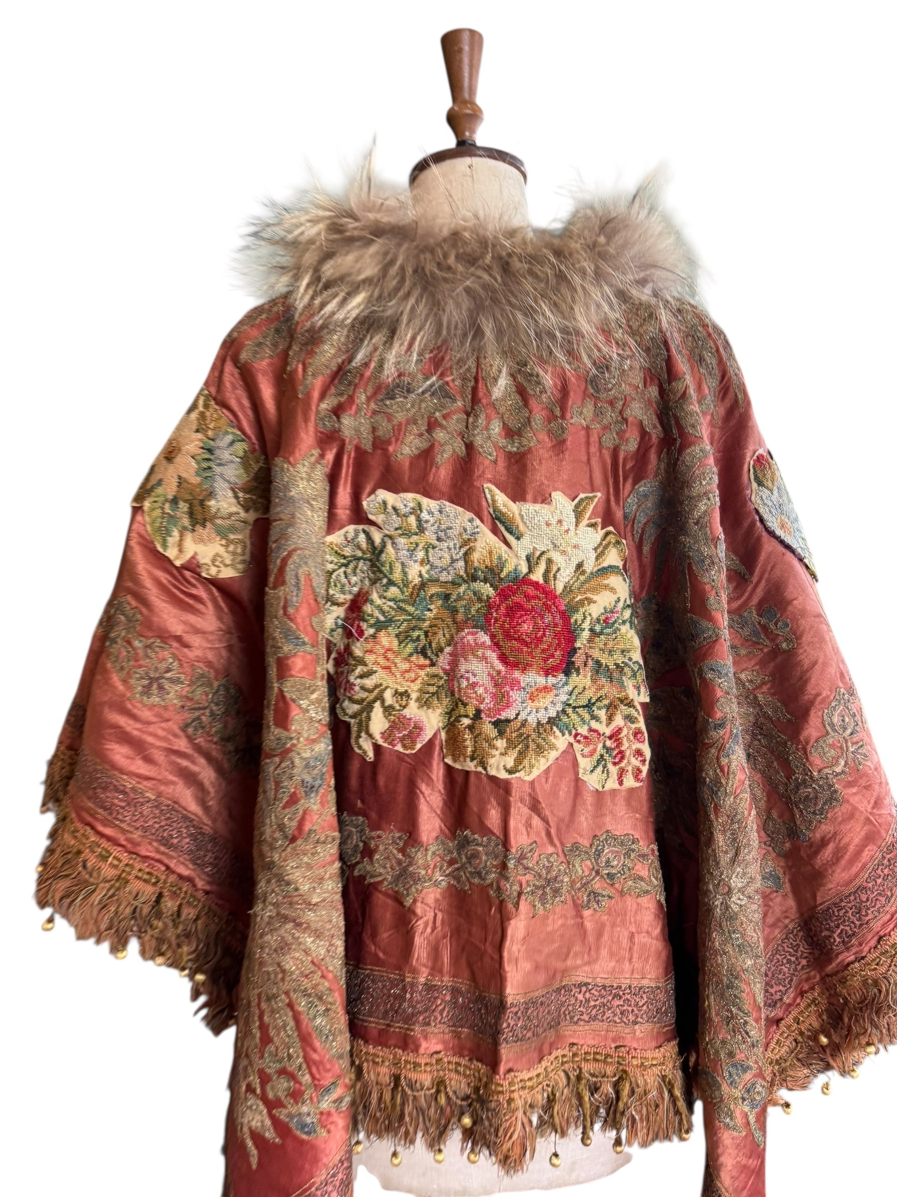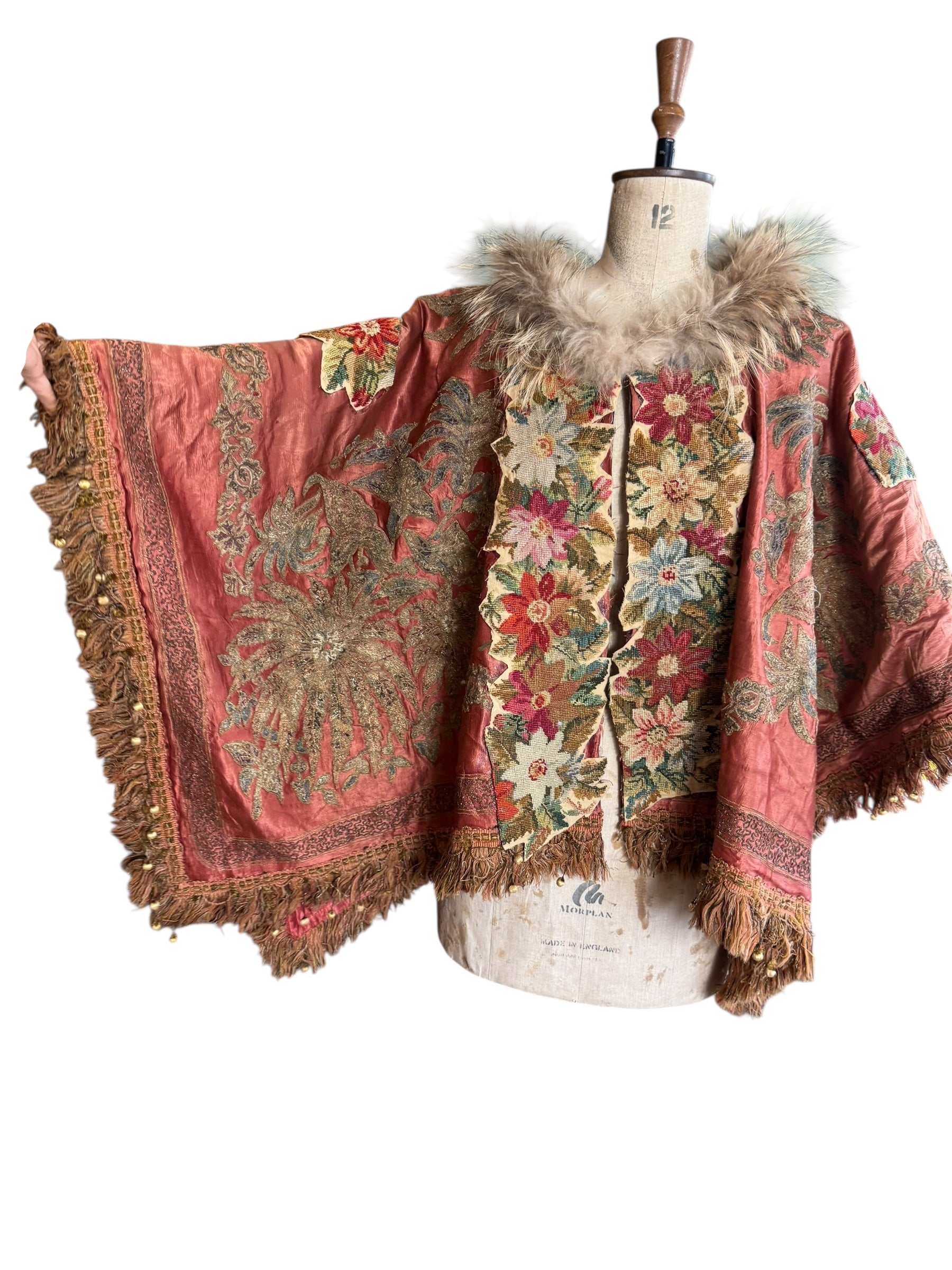 Paulina, 19thC silk embroidered fringed cape with needlepoint florals