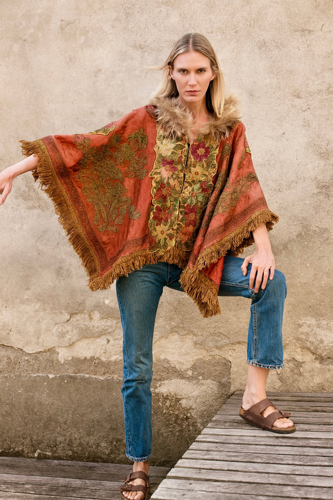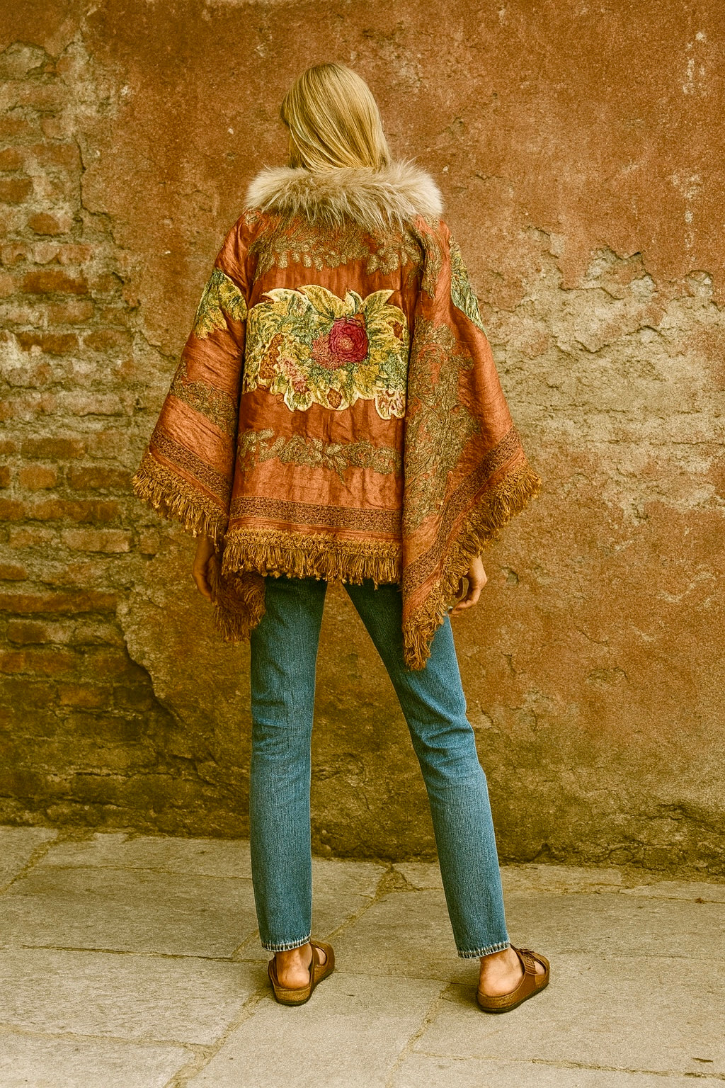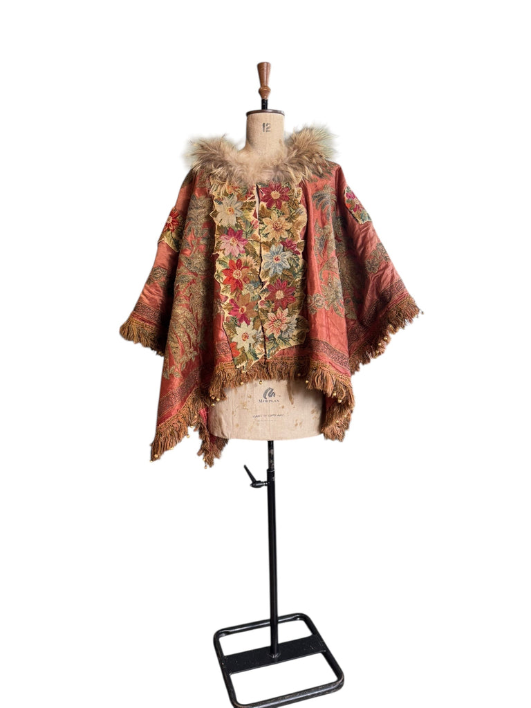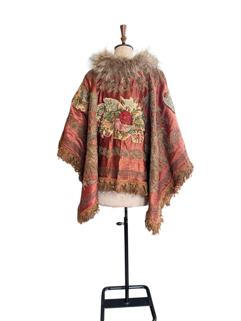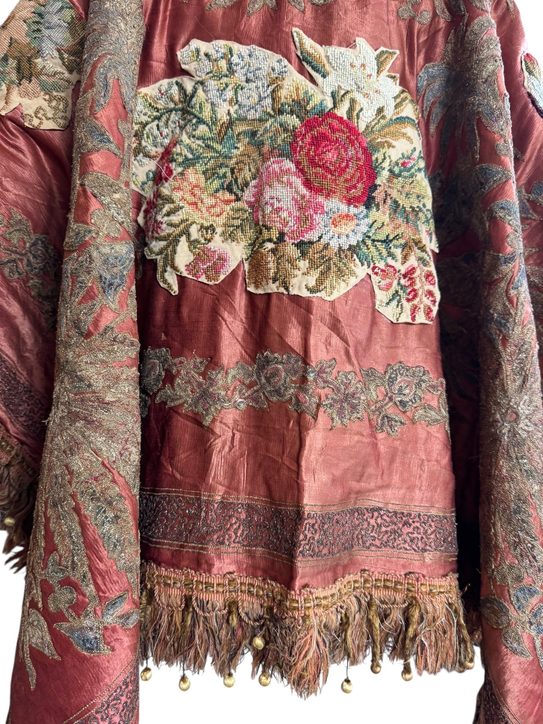 Paulina, 19thC silk embroidered fringed cape with needlepoint florals