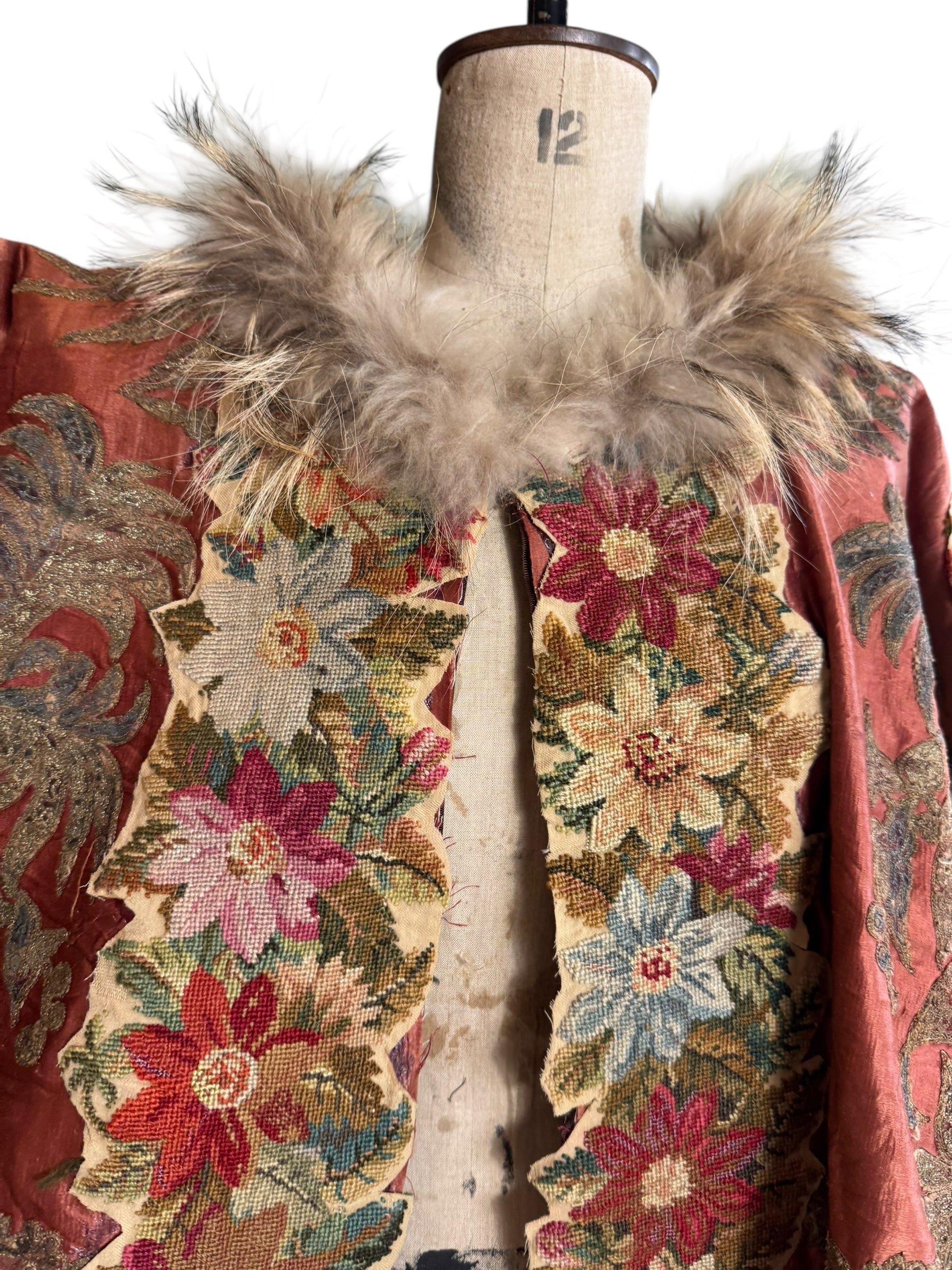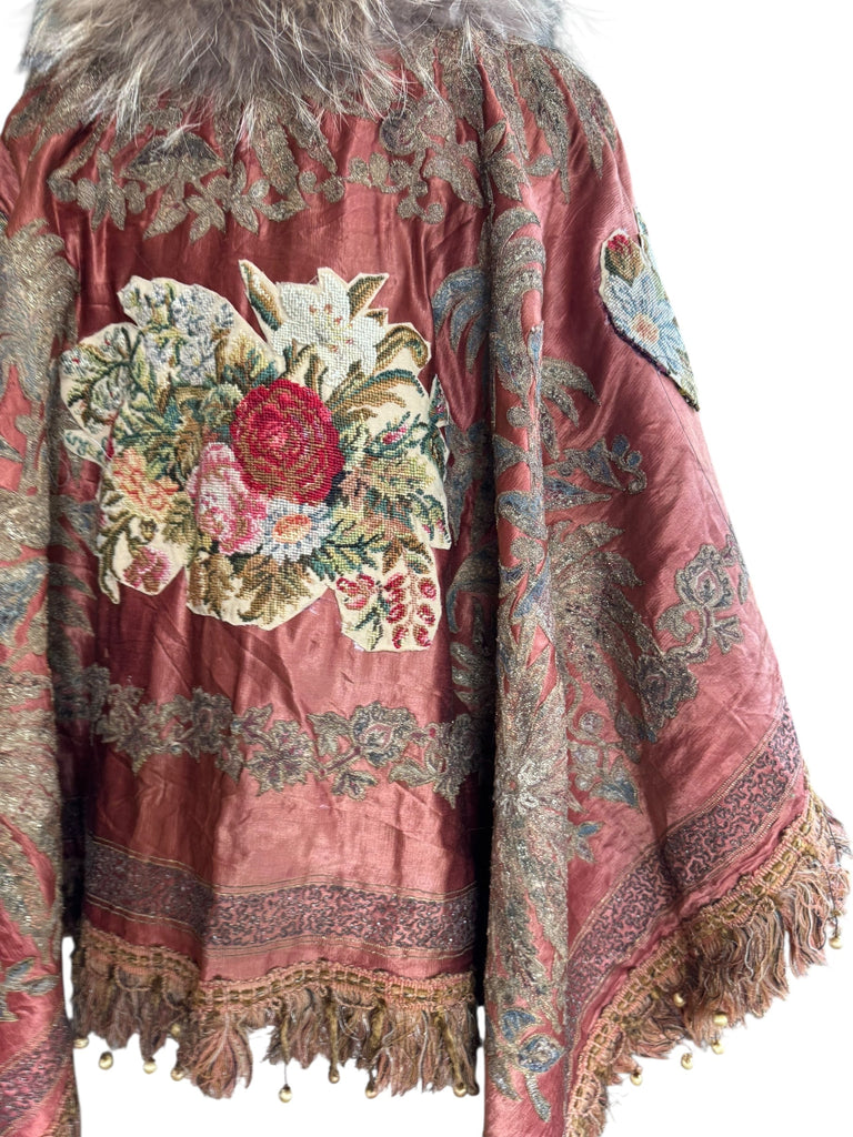 This exceptional 19th-century silk cape is reworked to highlight its exquisite embroidered silver thread design, paired with a distinctive Fox fur collar and a secure neck hook fastening. Lined in fine wool for comfort and warmth, it features a rare Victorian needlepoint floral pattern along the neckline and back. Ideal as a sophisticated layering piece, this cape combines historical craftsmanship with timeless elegance.