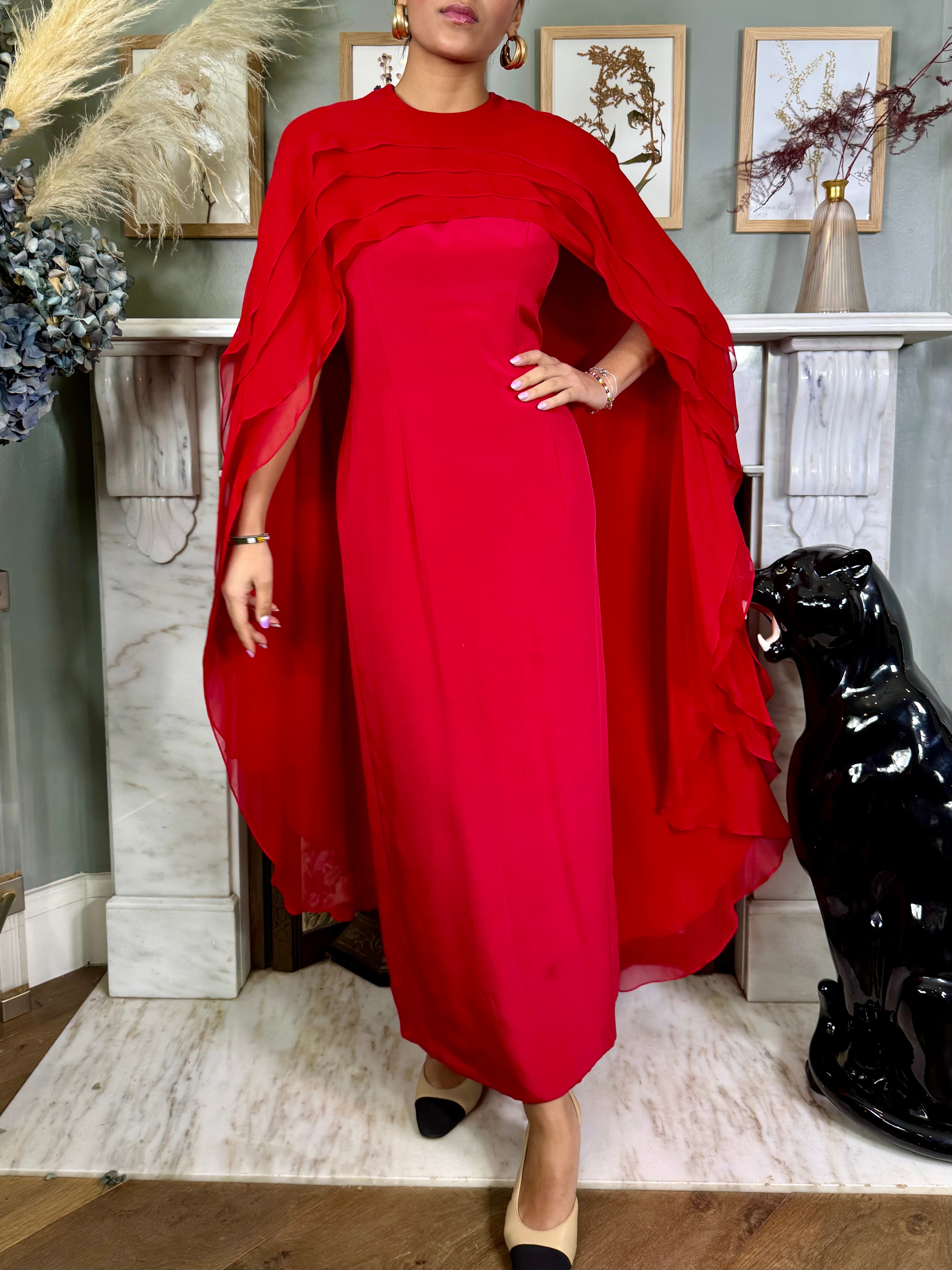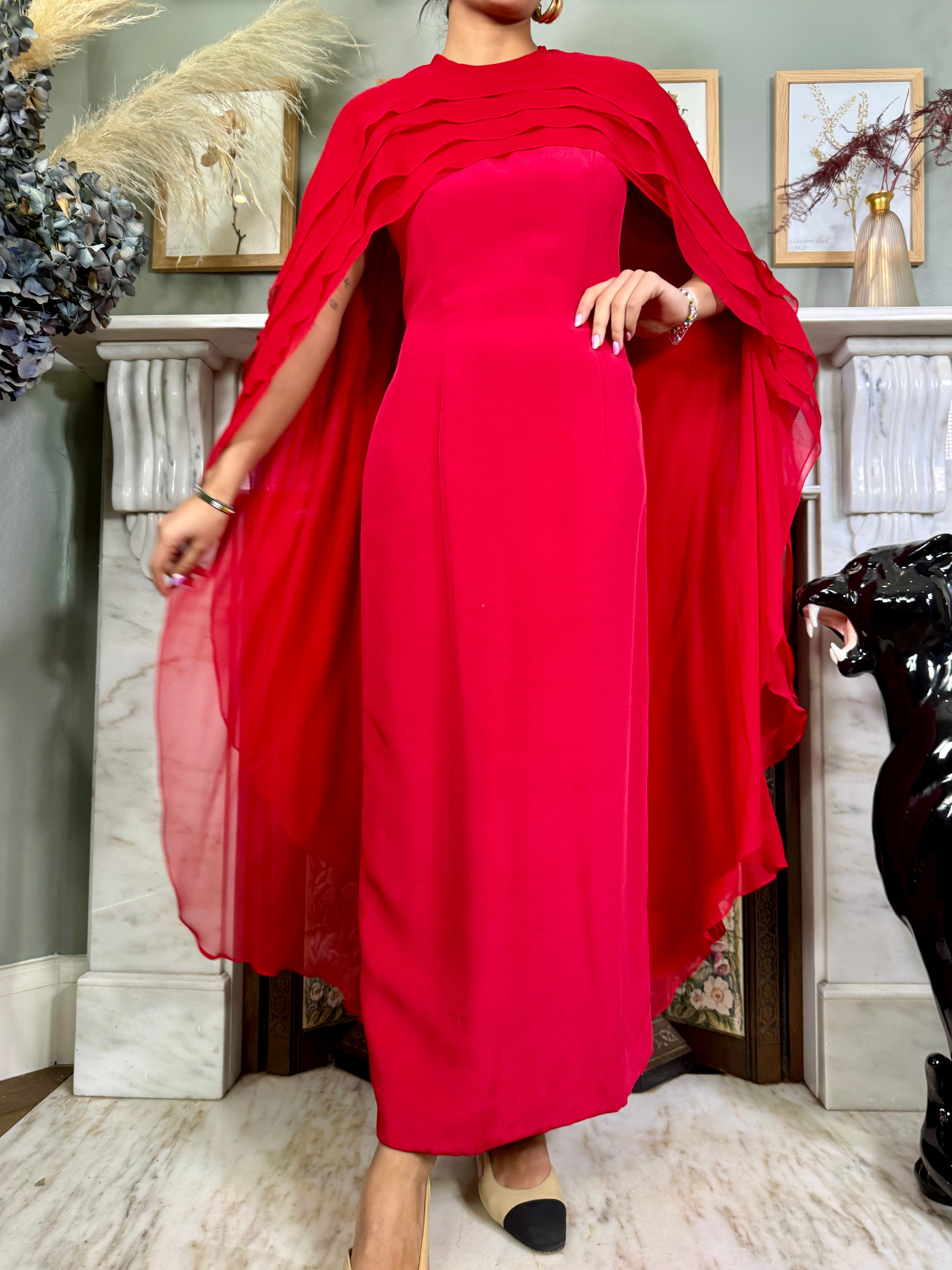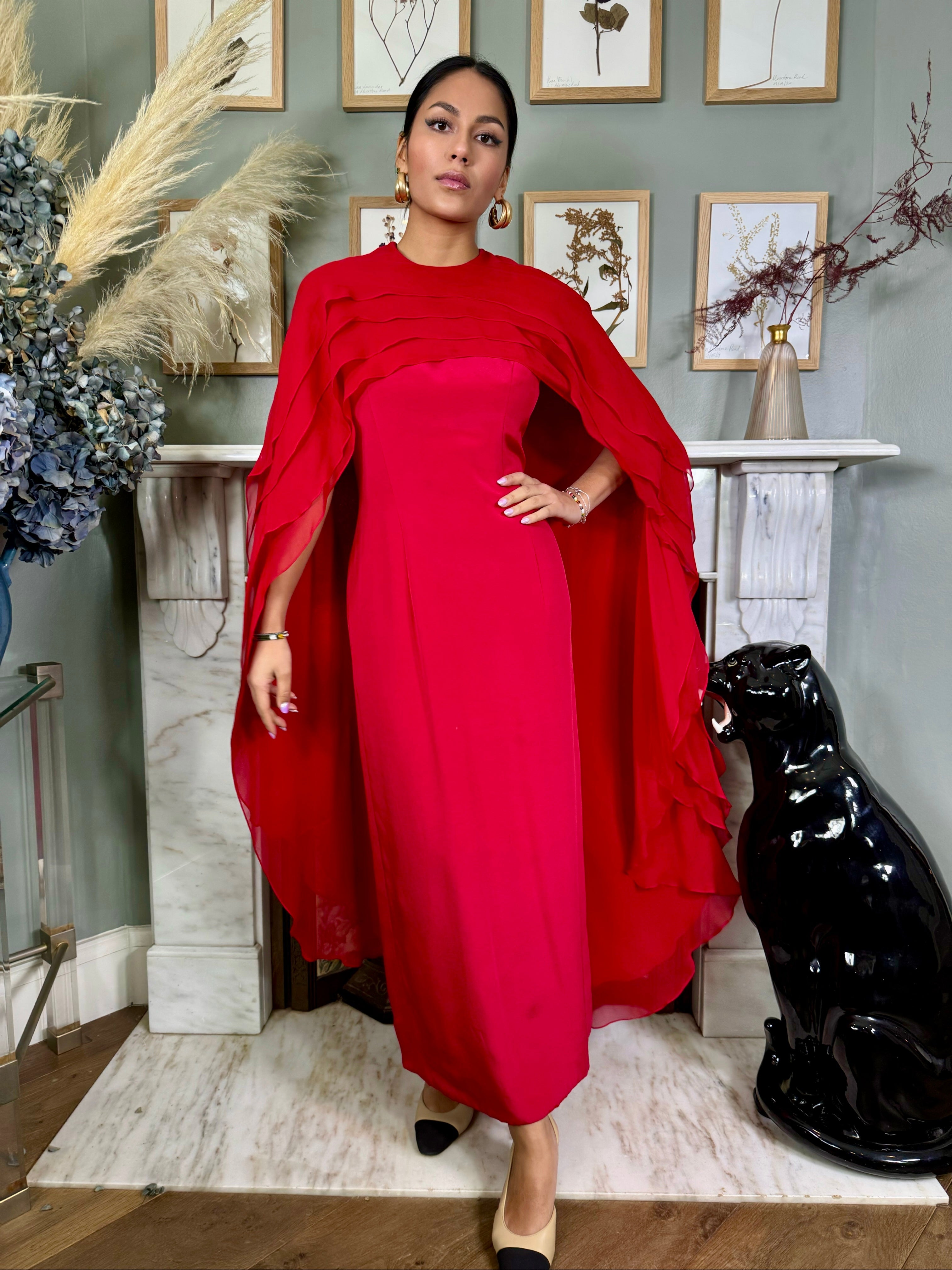 Absolutely gorgeous vintage Carolina Herrera red silk dress. Comes sleeveless, has a round neck, a tailored waistline and falls ankle length. Zips at the back. Has 3 layers of wispy red chiffon covering the chest and cascading down the back covering the arms and floating beautifully in motion. Has buttons on the back.