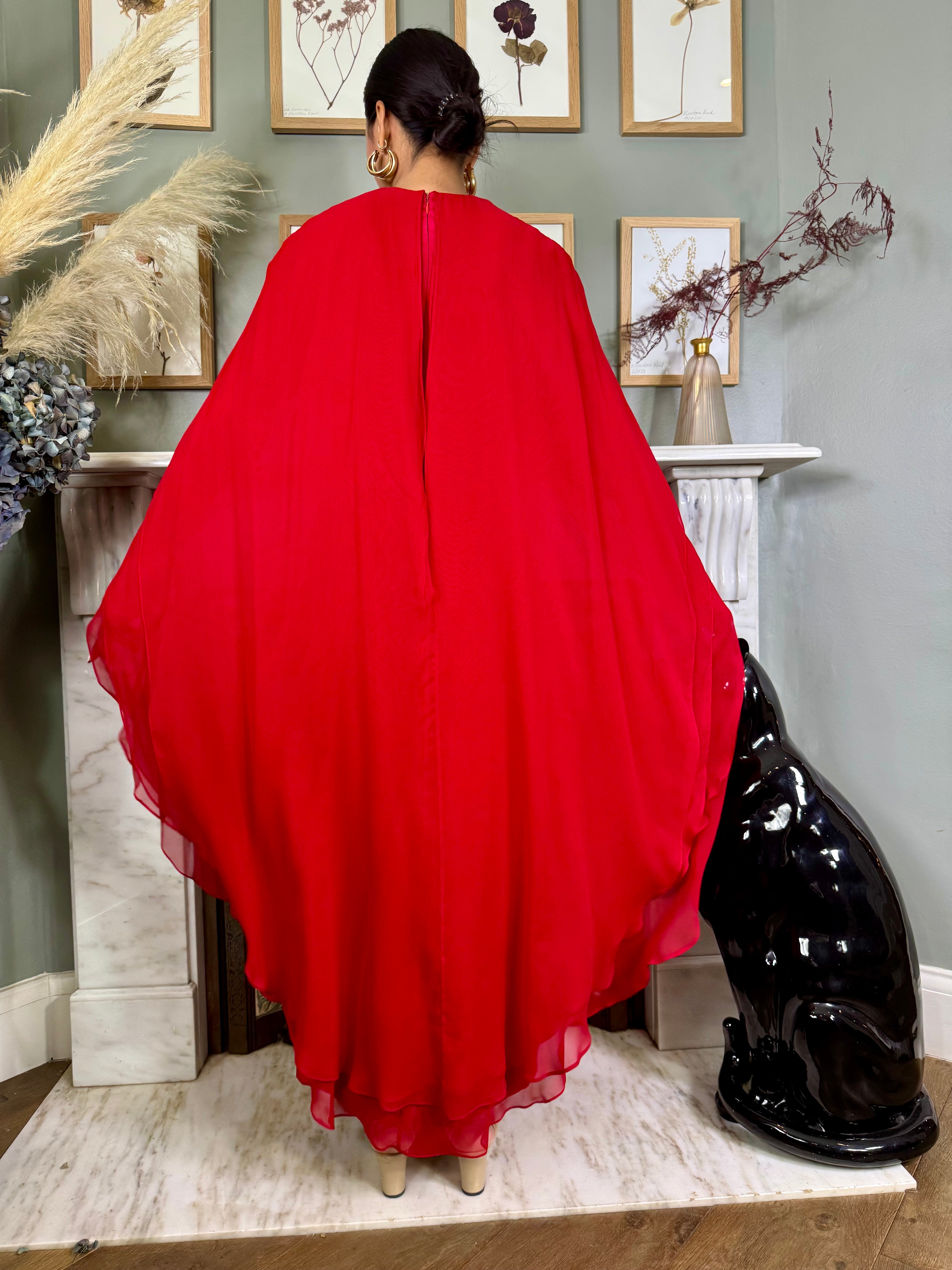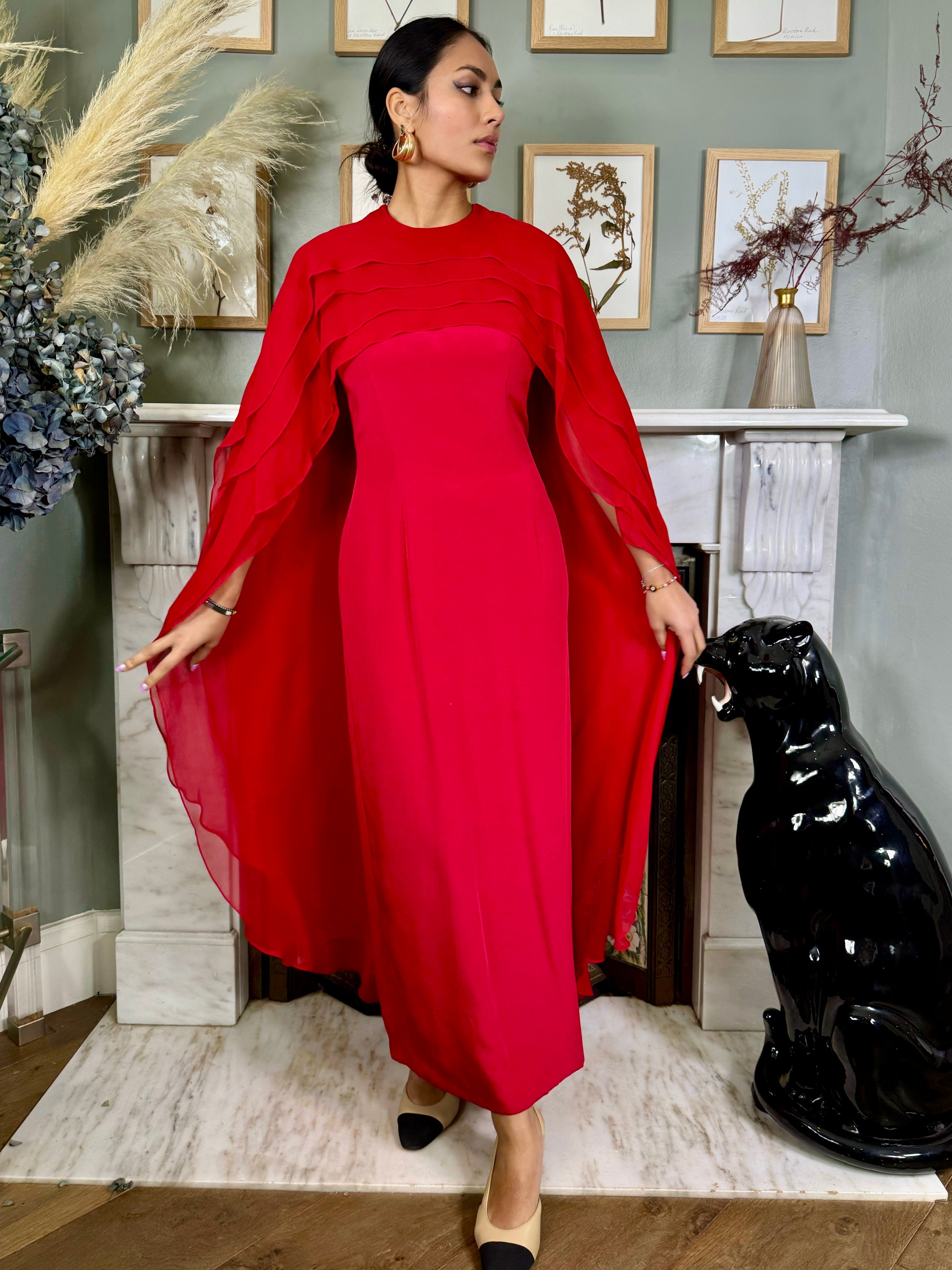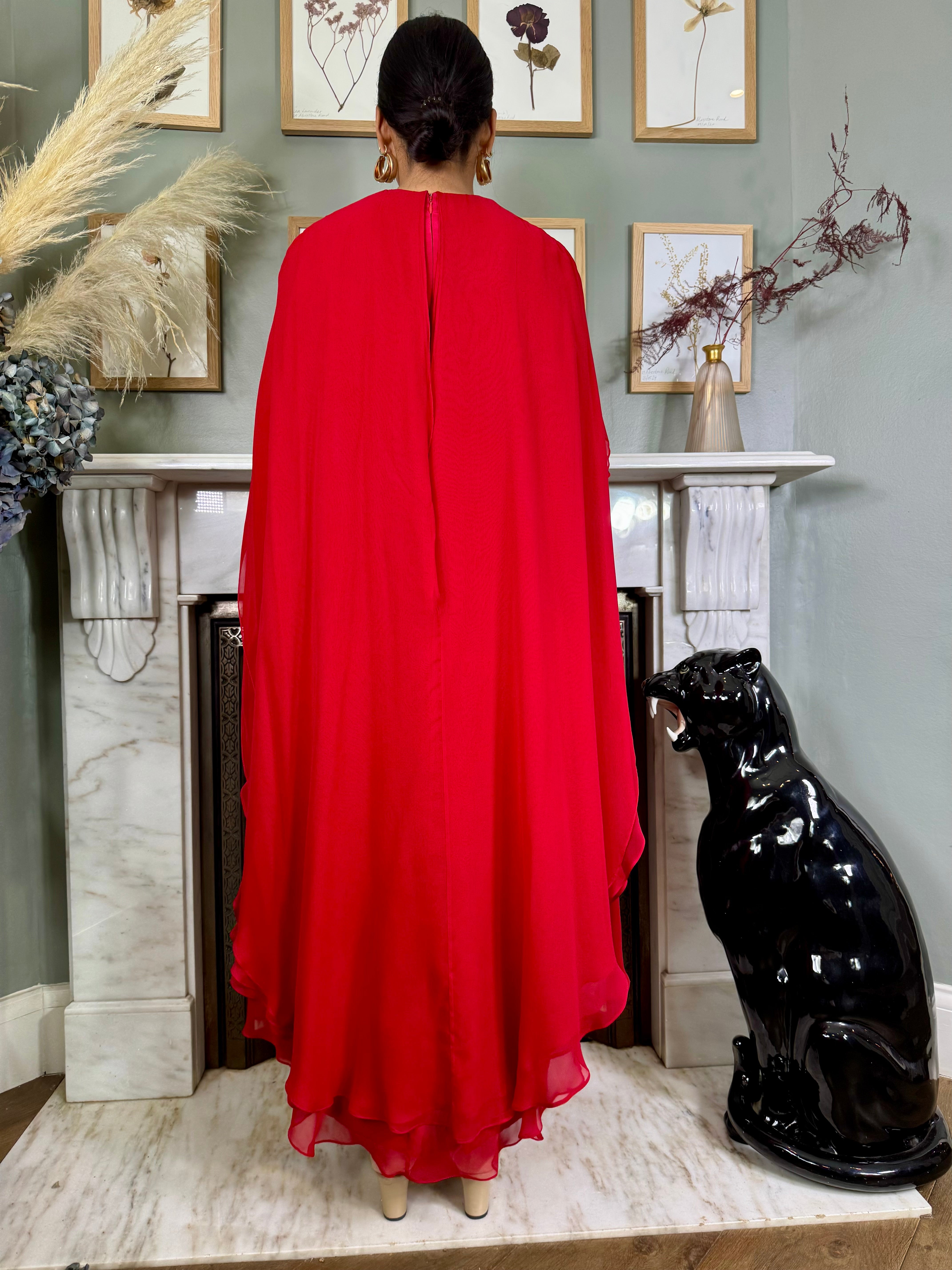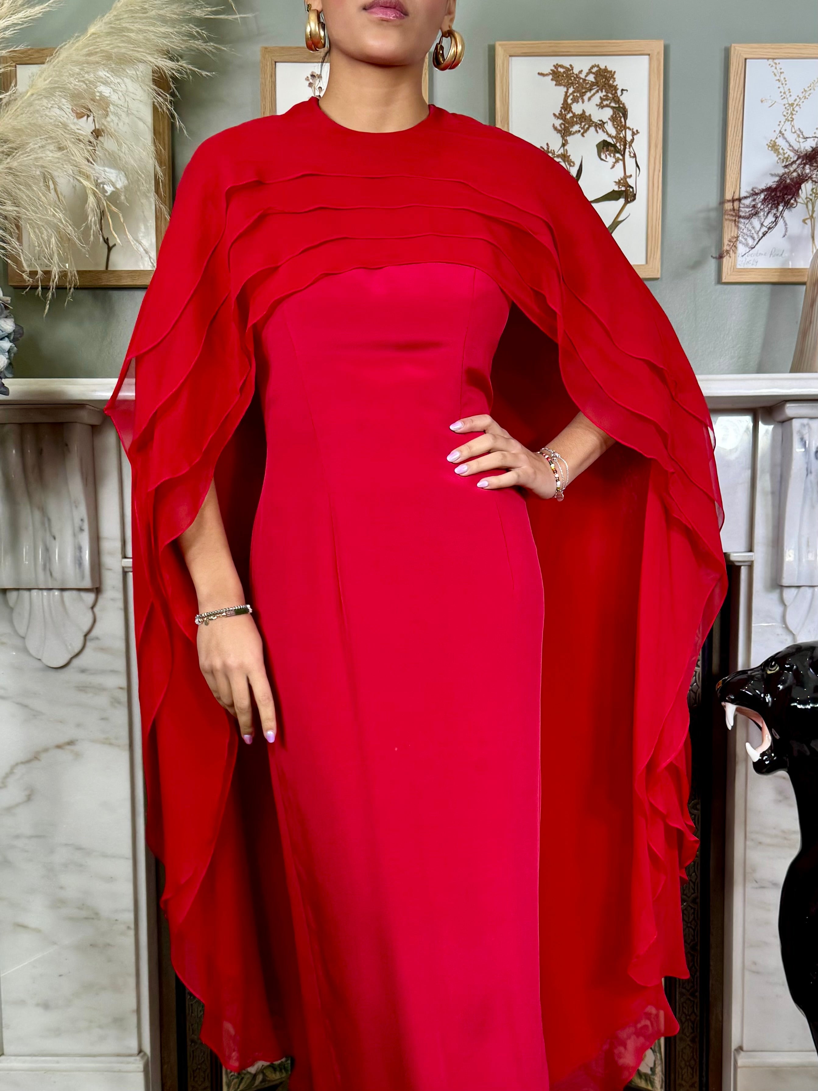 Absolutely gorgeous vintage Carolina Herrera red silk dress. Comes sleeveless, has a round neck, a tailored waistline and falls ankle length. Zips at the back. Has 3 layers of wispy red chiffon covering the chest and cascading down the back covering the arms and floating beautifully in motion. Has buttons on the back.