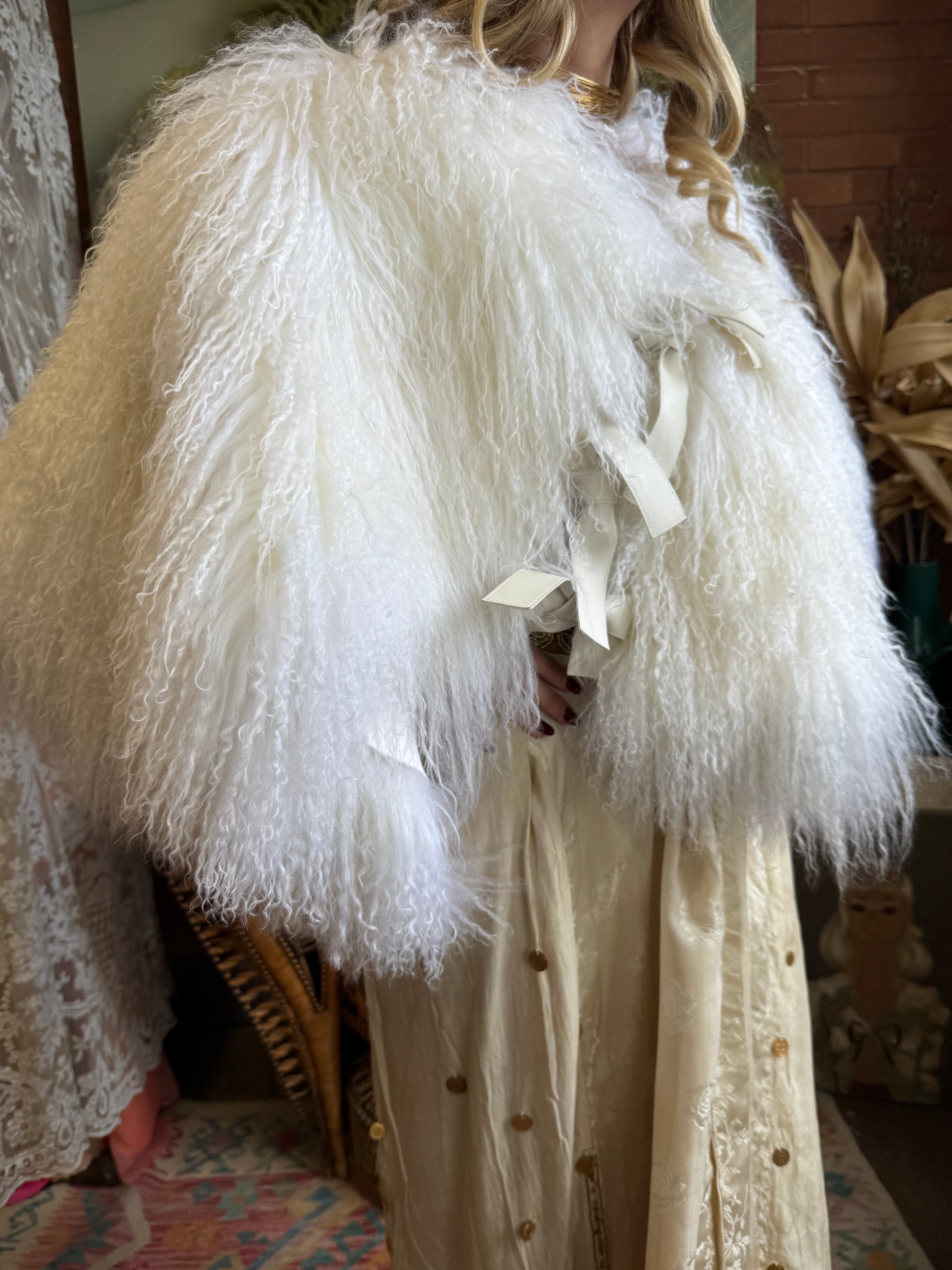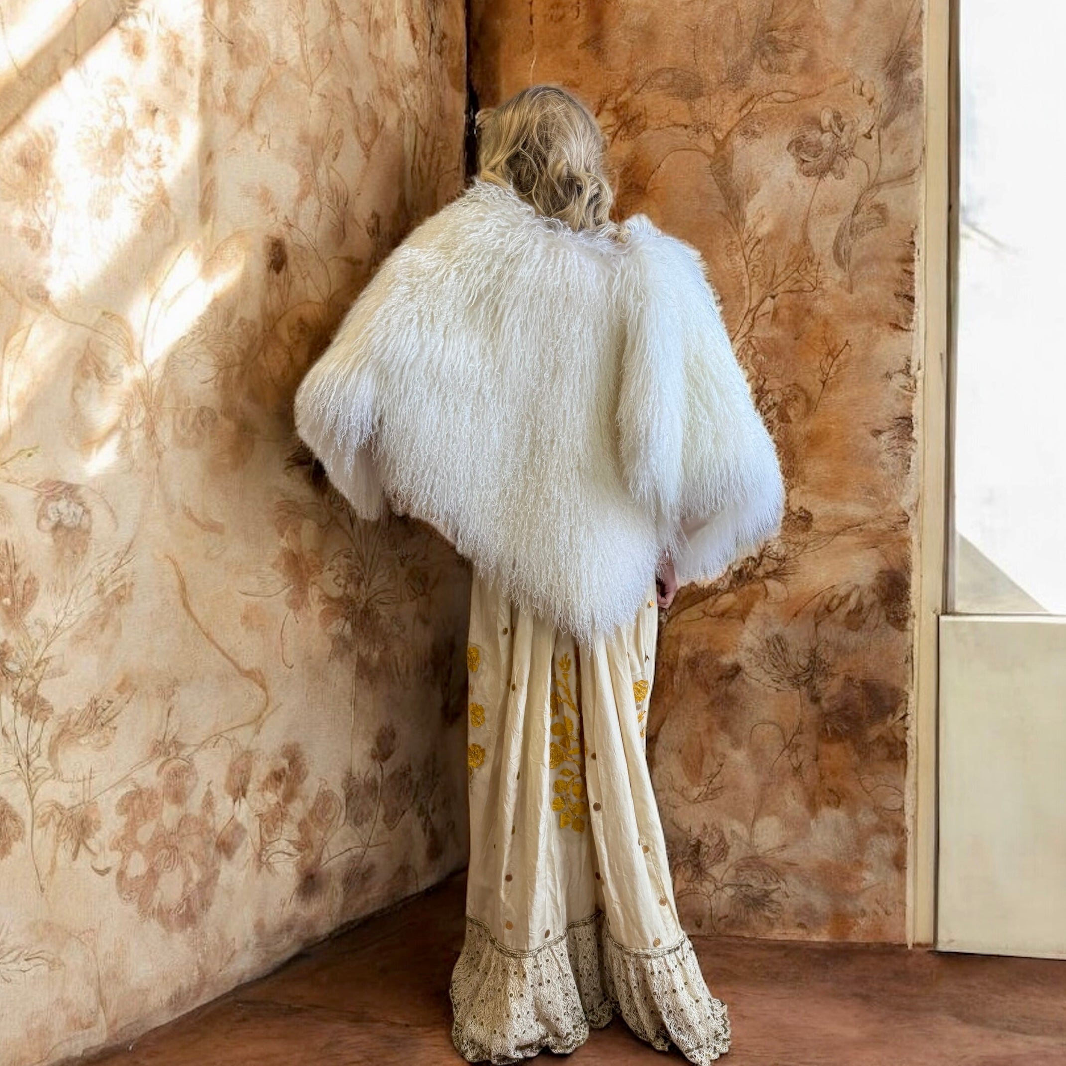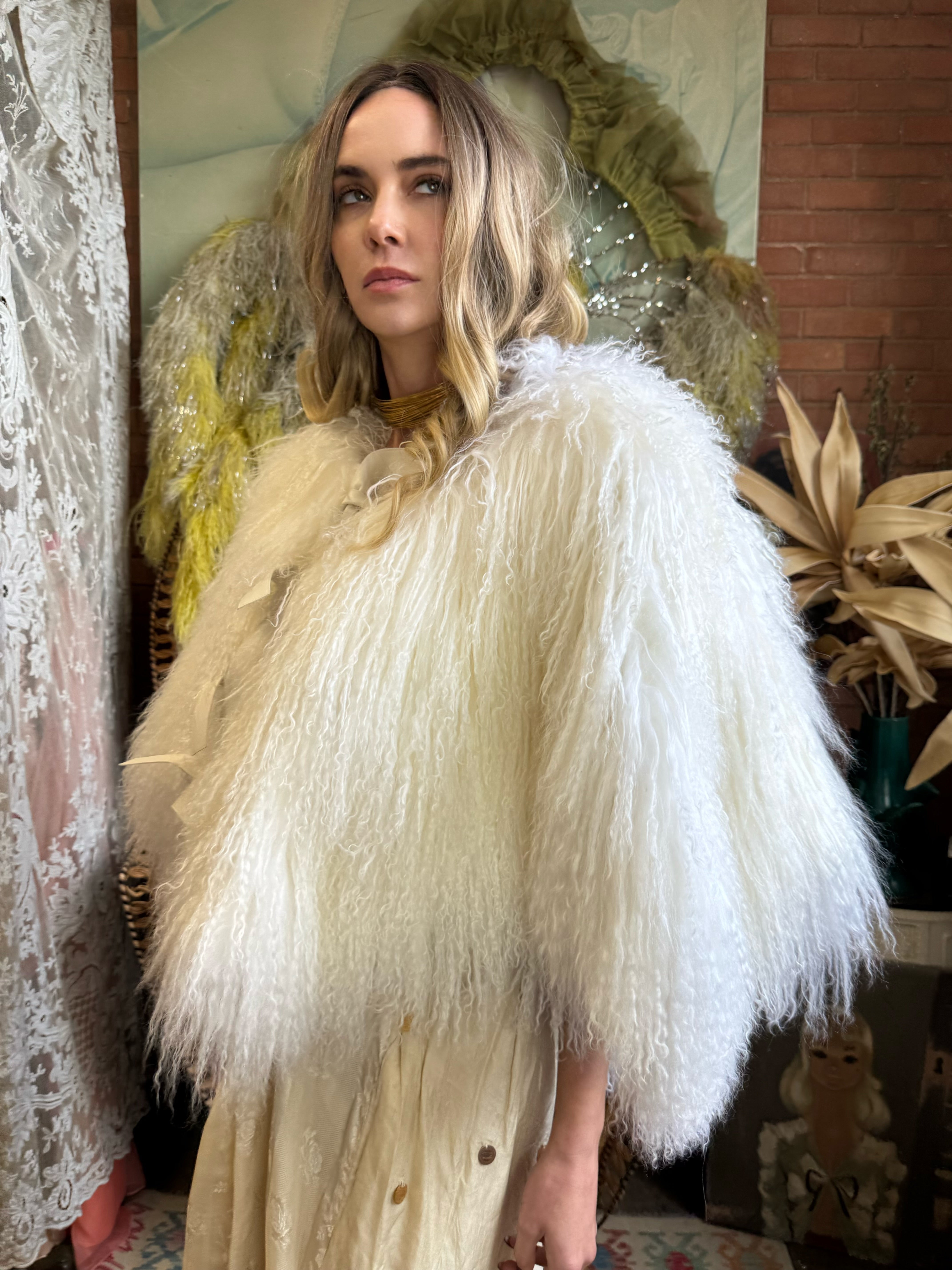 Introducing Sadie, a luxurious Mongolian white fur cape straight from the 80s. Crafted from soft cream fur and lined with silk, this cape boasts front leather ties for a secure fit. Stay warm and stylish in this original timeless vintage piece.