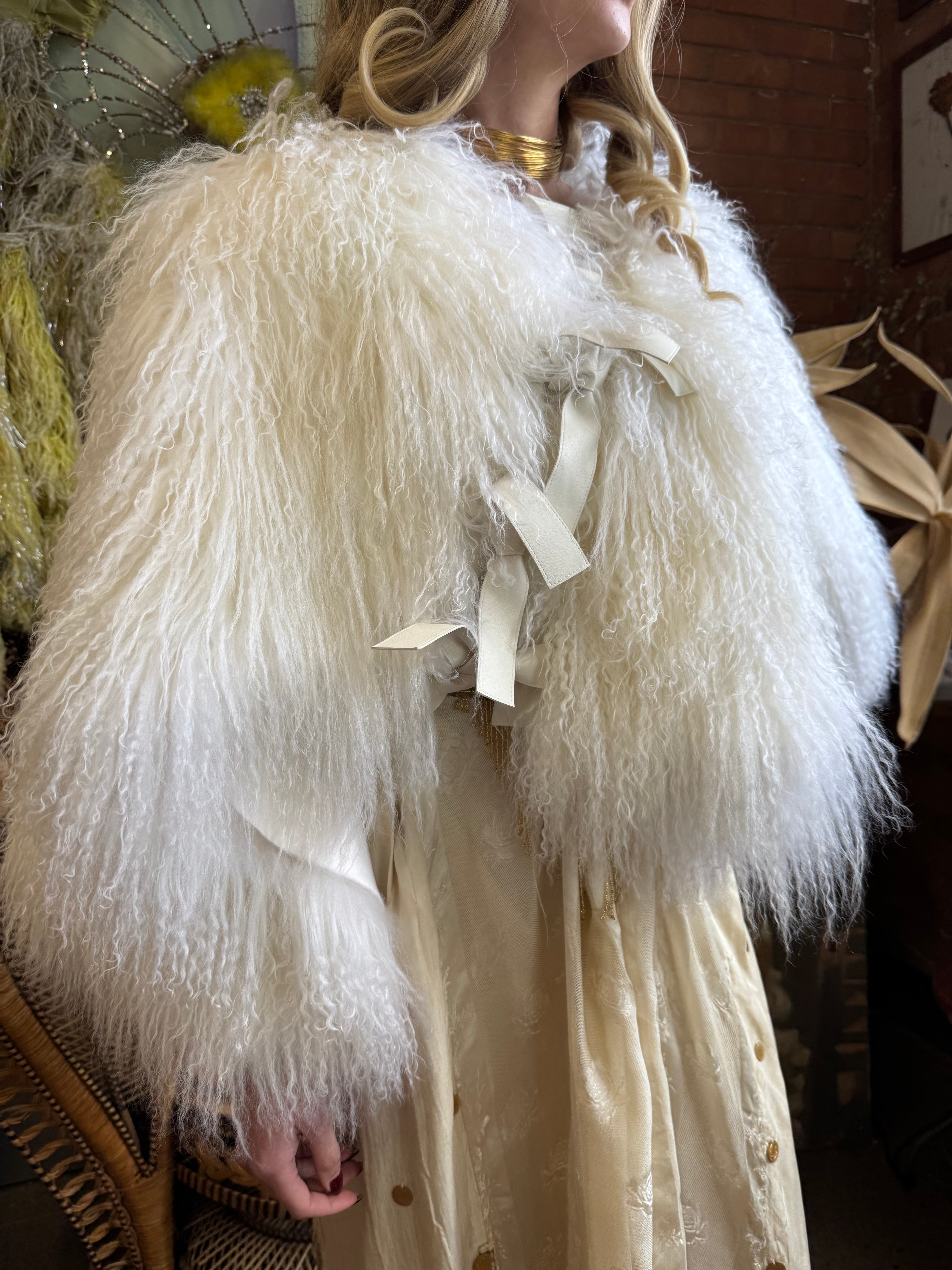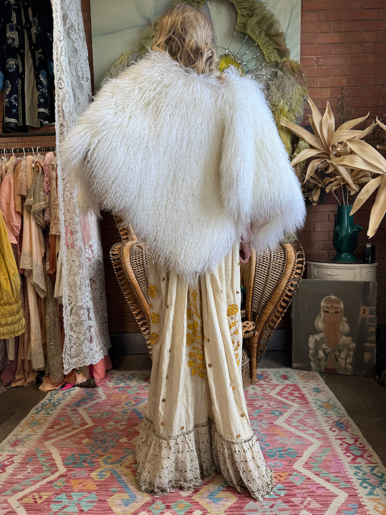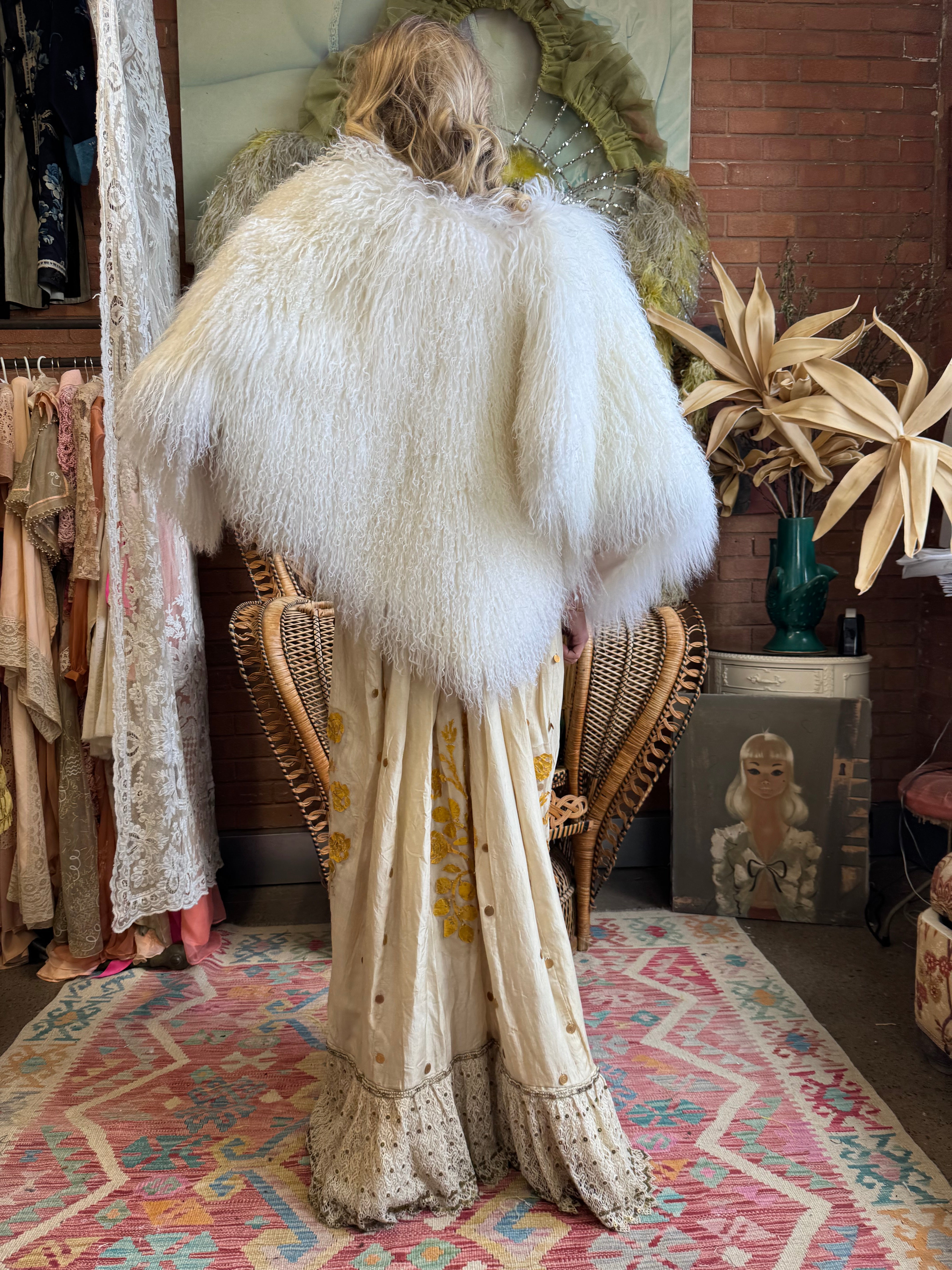 Introducing Sadie, a luxurious Mongolian white fur cape straight from the 80s. Crafted from soft cream fur and lined with silk, this cape boasts front leather ties for a secure fit. Stay warm and stylish in this original timeless vintage piece.