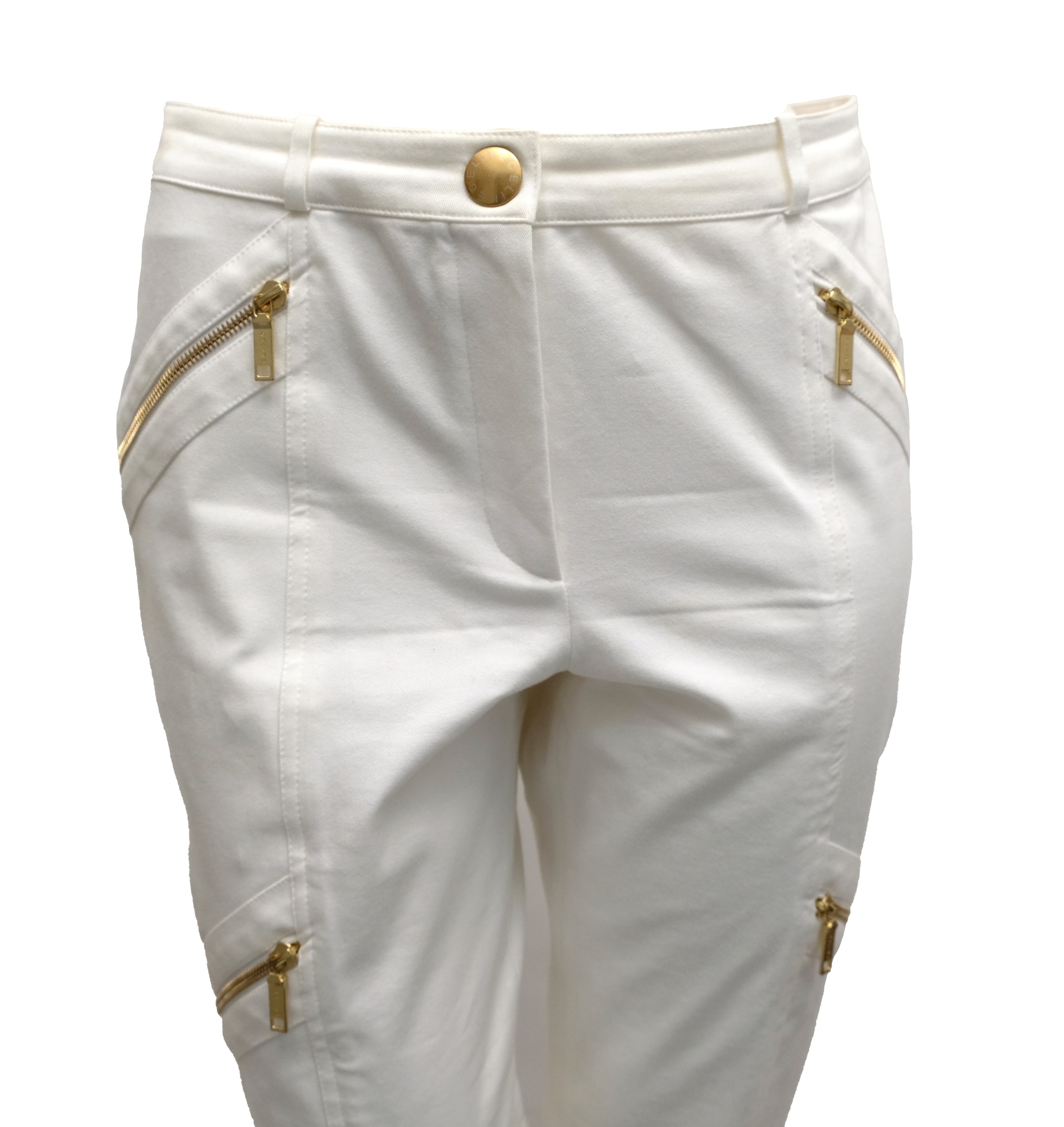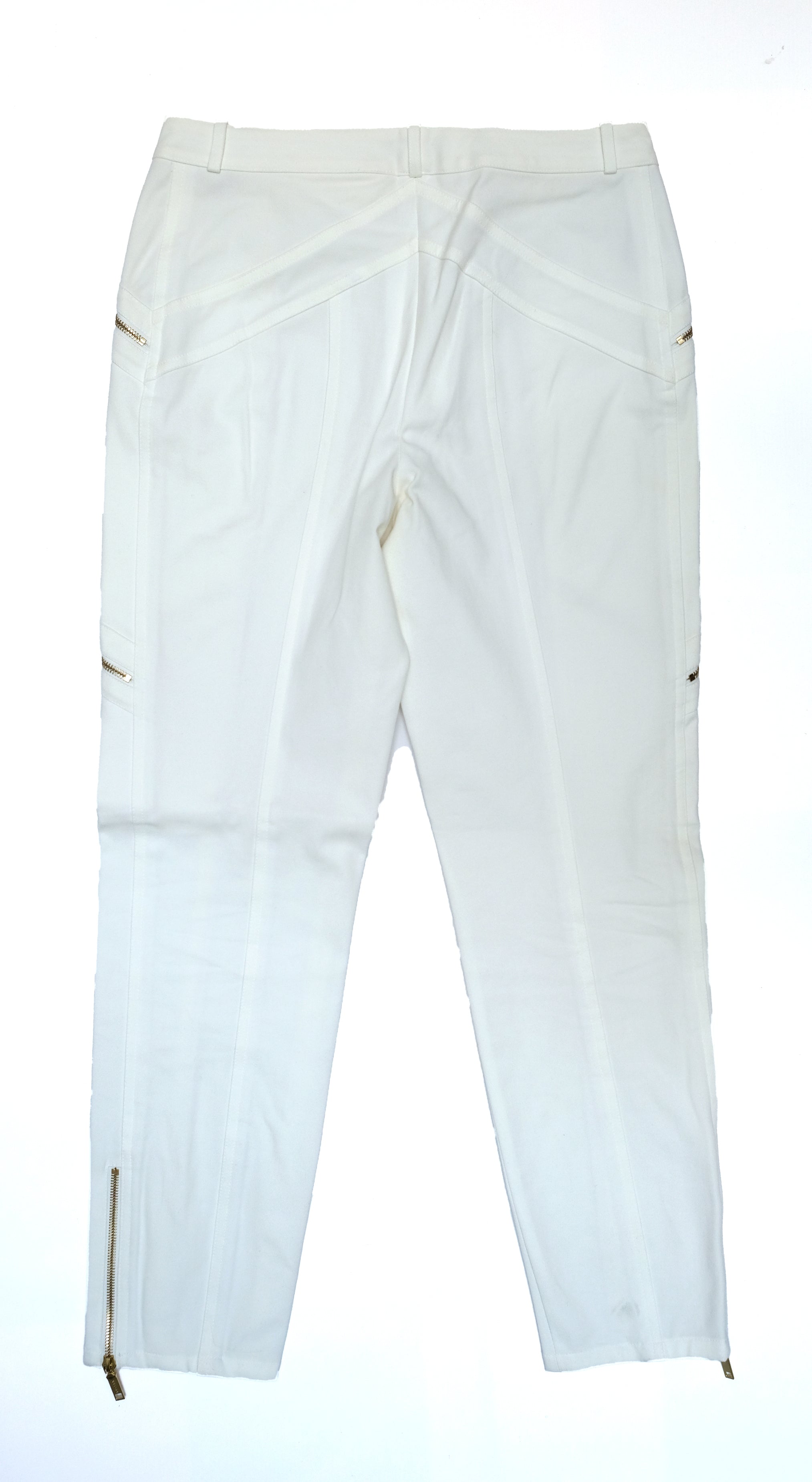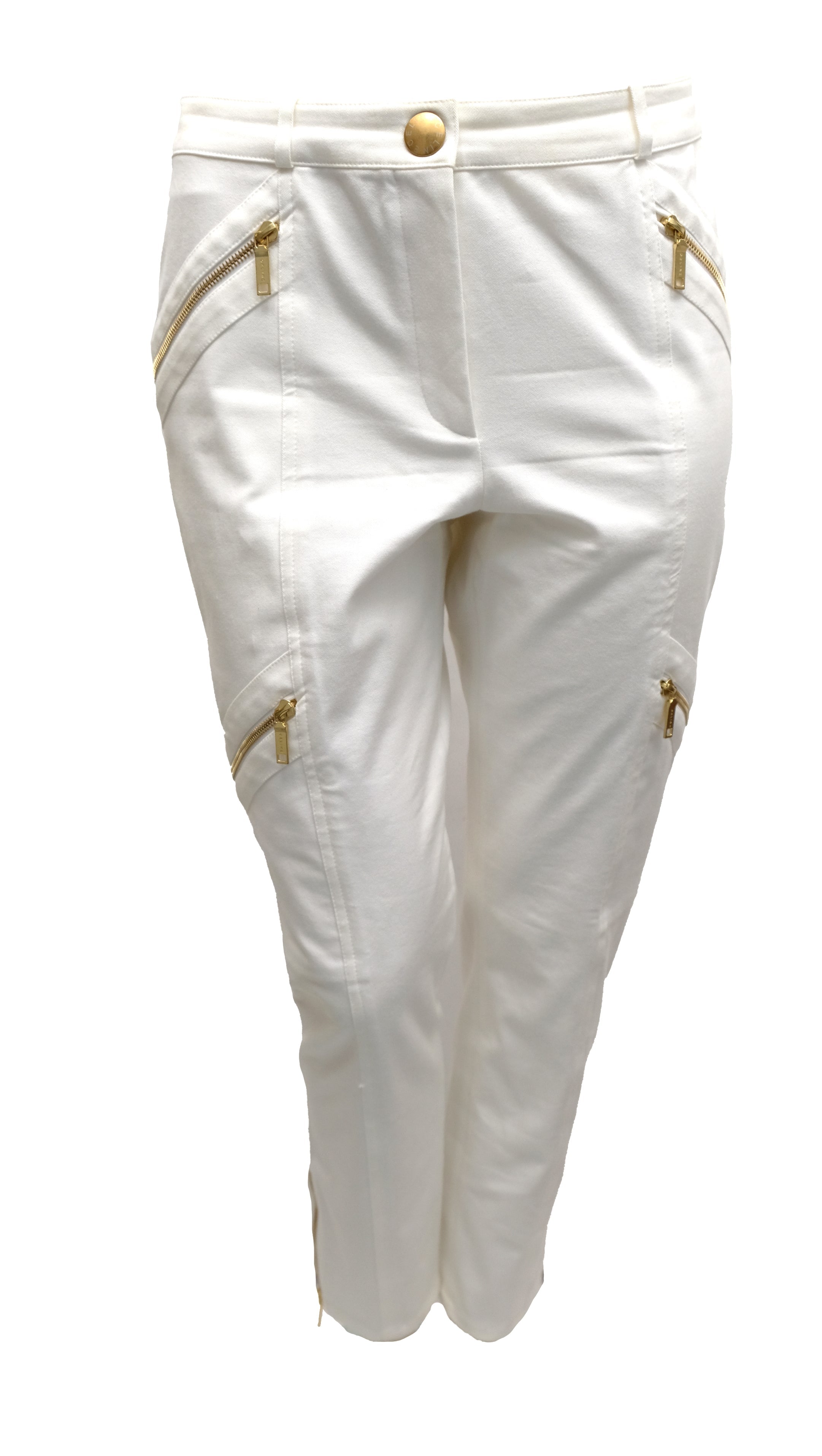 The trousers are ankle length.   Slim fitting with two sets of slanting gold zips at hip and thigh, and gold exposed zips at ankles.  Diagonal panels at the back, slight stretch for better fit.  Zip front with large  branded popper closure.