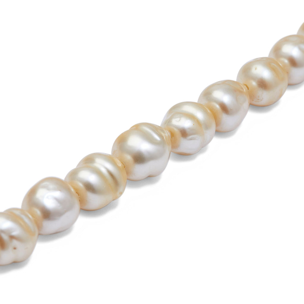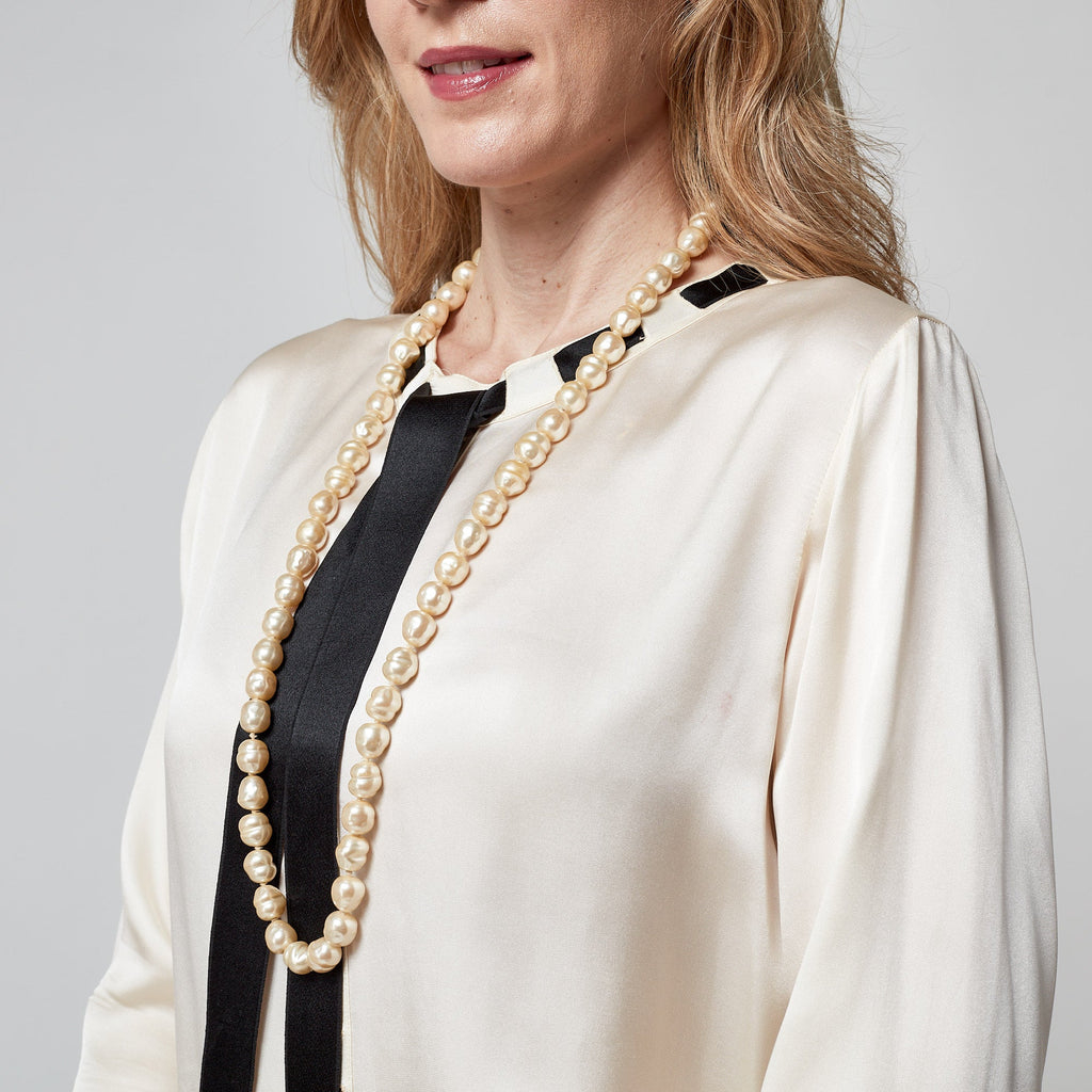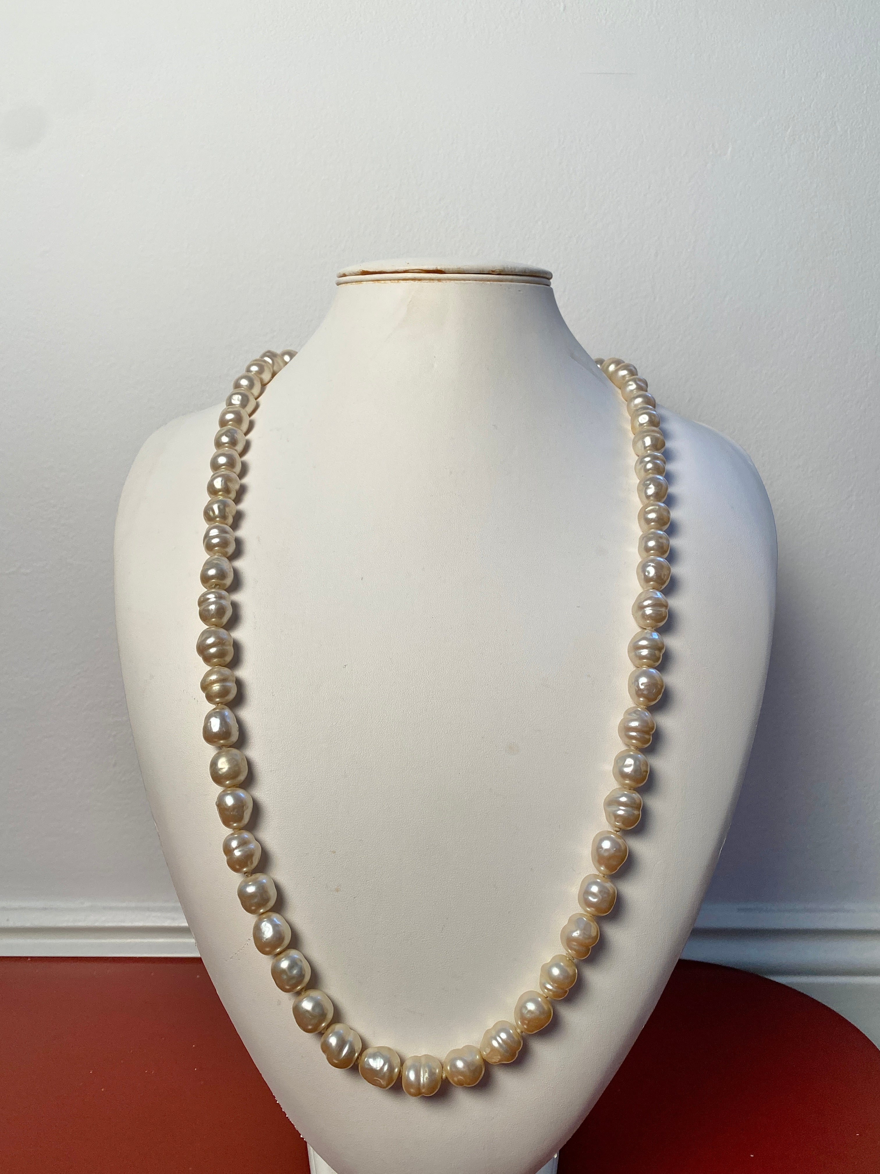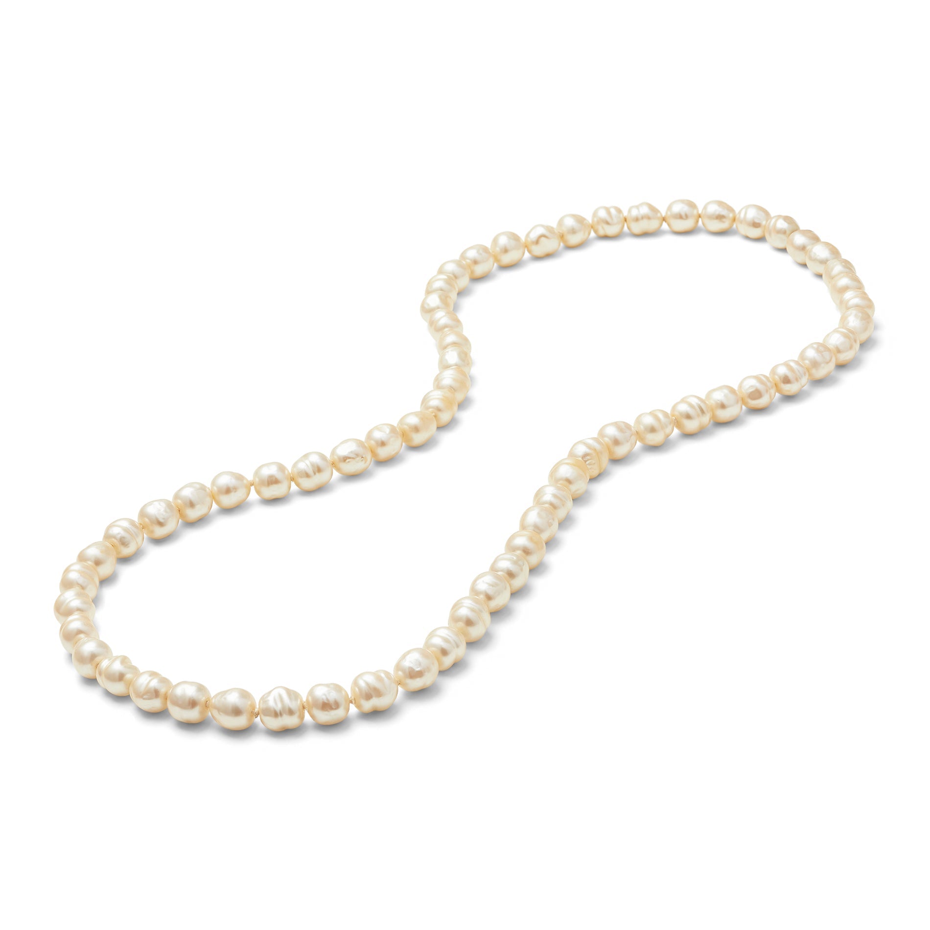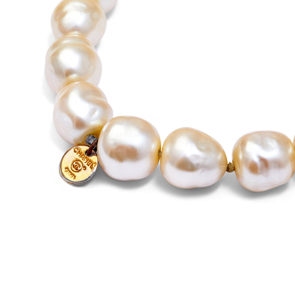 1980s Chanel champagne colour Baroque style simulated pearl necklace. From the early part of the decade before Karl Lagerfeld and Victoire de Castellane were the creative directors for the House in fashion and jewellery respectively. This individually knotted, single strand sautoir simply slips on over the head and has a gold plated and engraved authenticity charm stamped Chanel, Double CC and 1981.