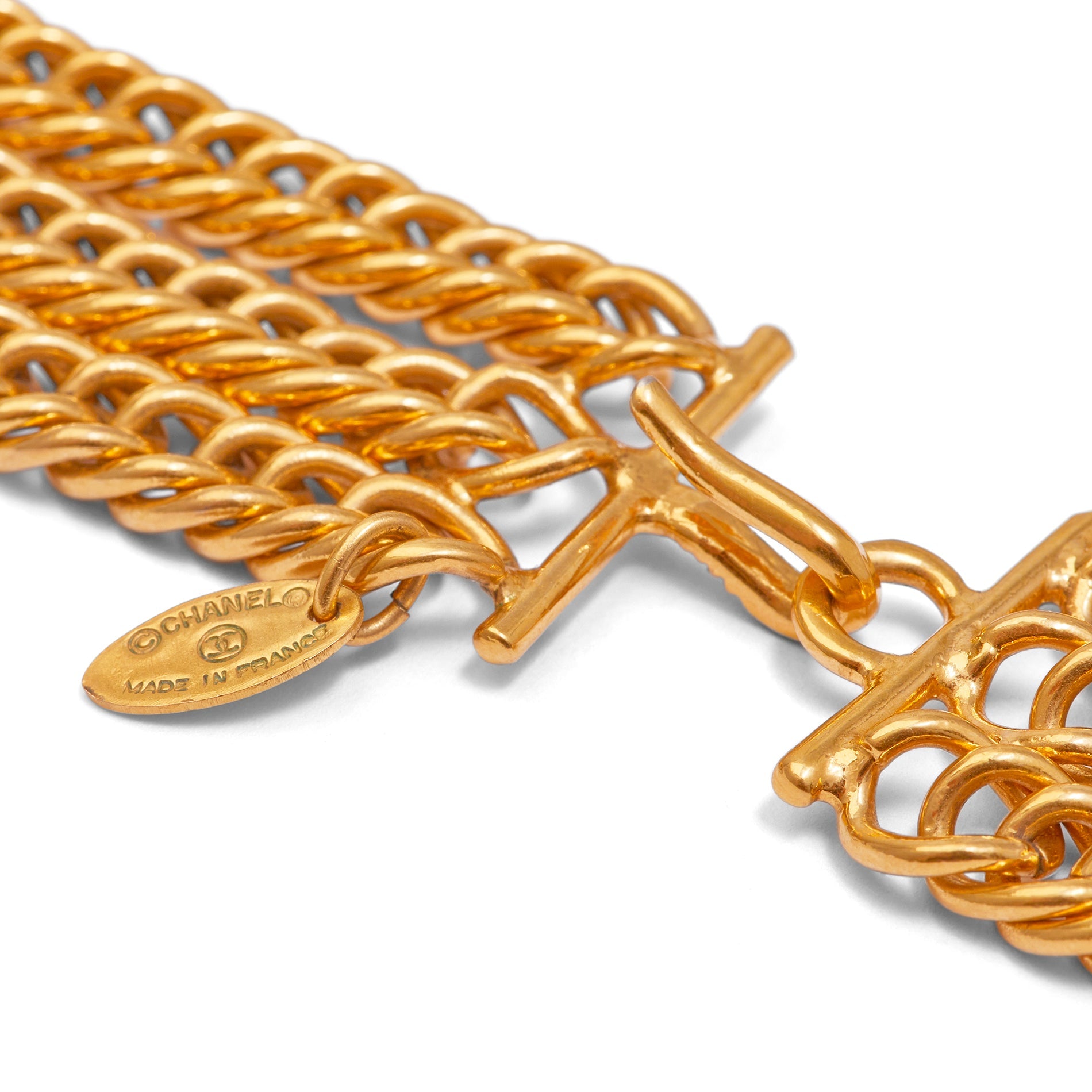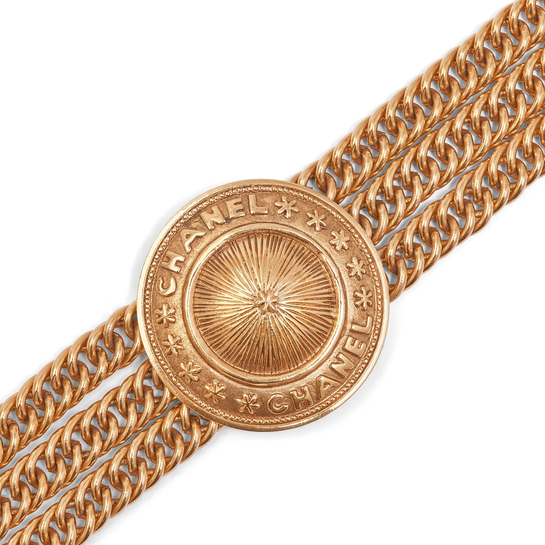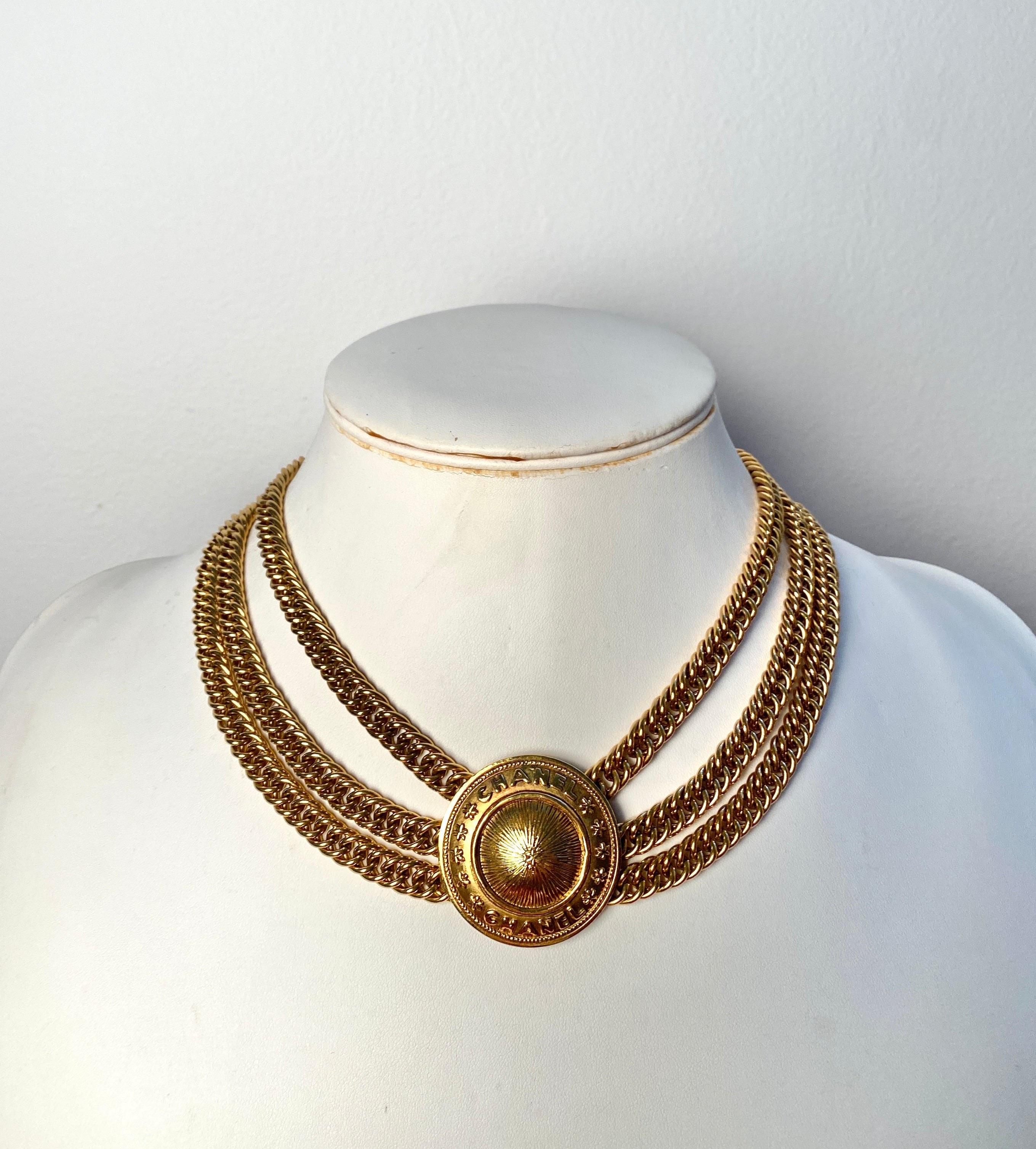 Classic Chanel 1980s gold curb chain triple strand choker necklace. The medallion is in the shape of a shield and the Chanel lettering is accompanied by 6-point stars. Marked to the reverse Chanel and the design number 3929. In excellent vintage condition; very minor rubbing to the gold chain on a handful of the links to the reverse. An additional oval cartouche is attached near the hook fastening and annotated Made in France.
