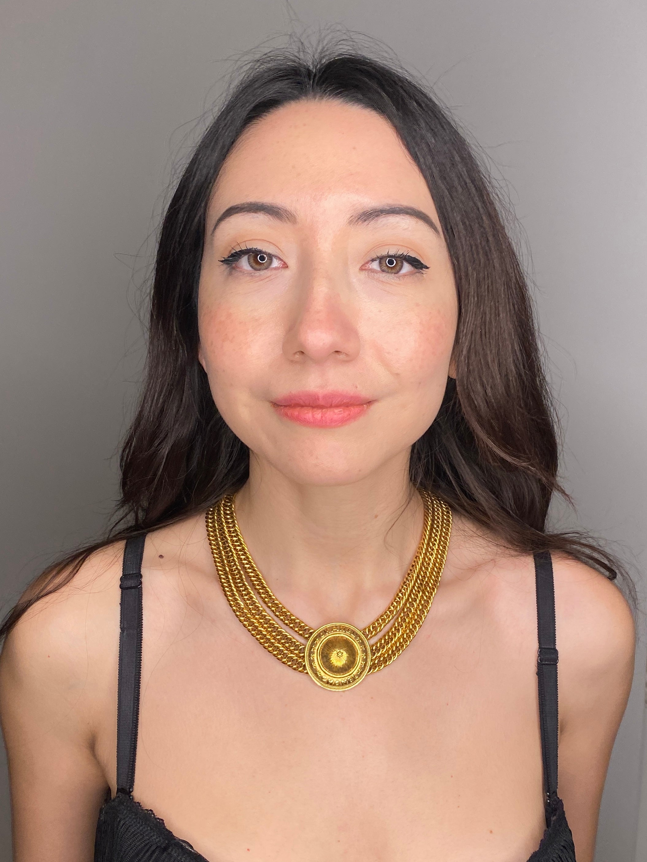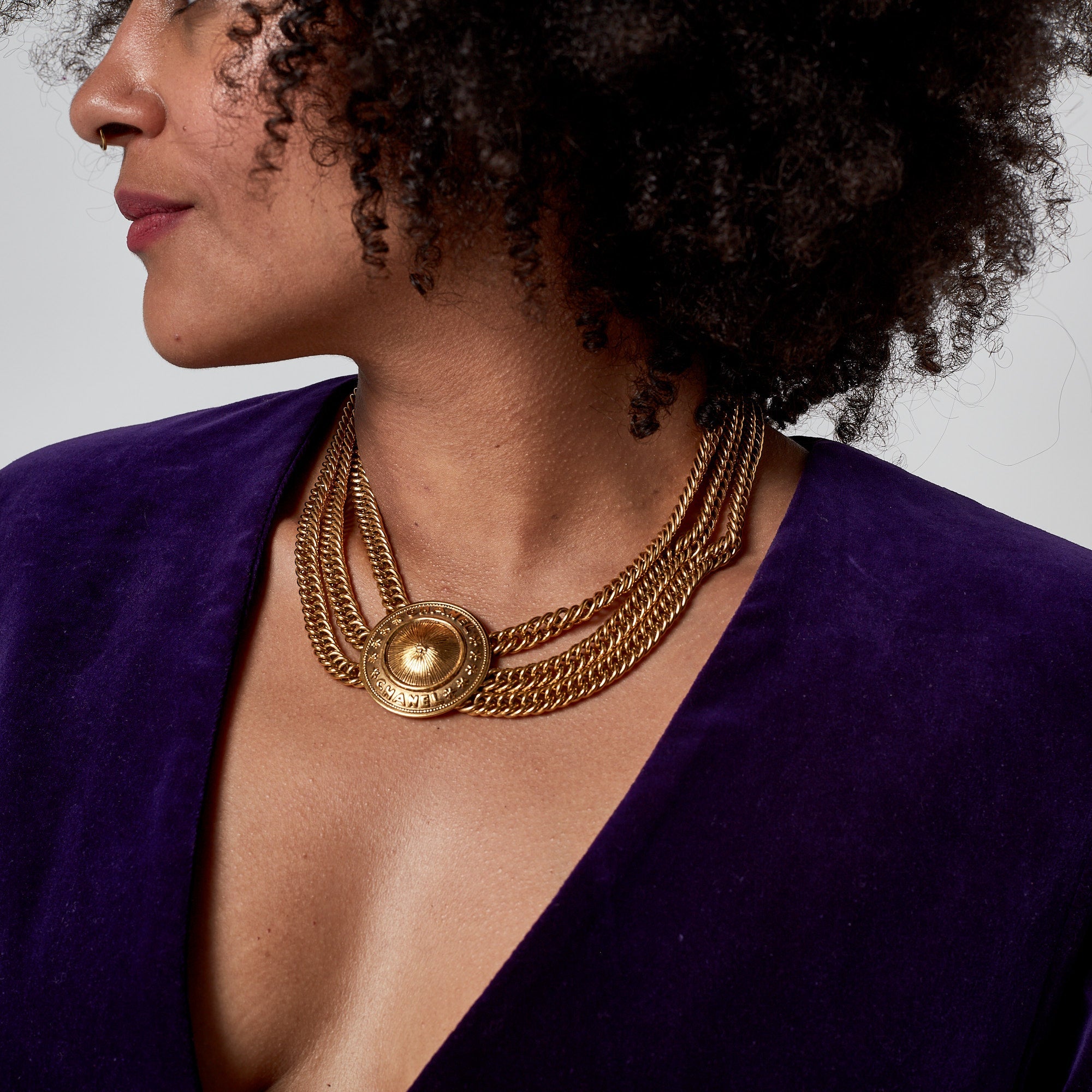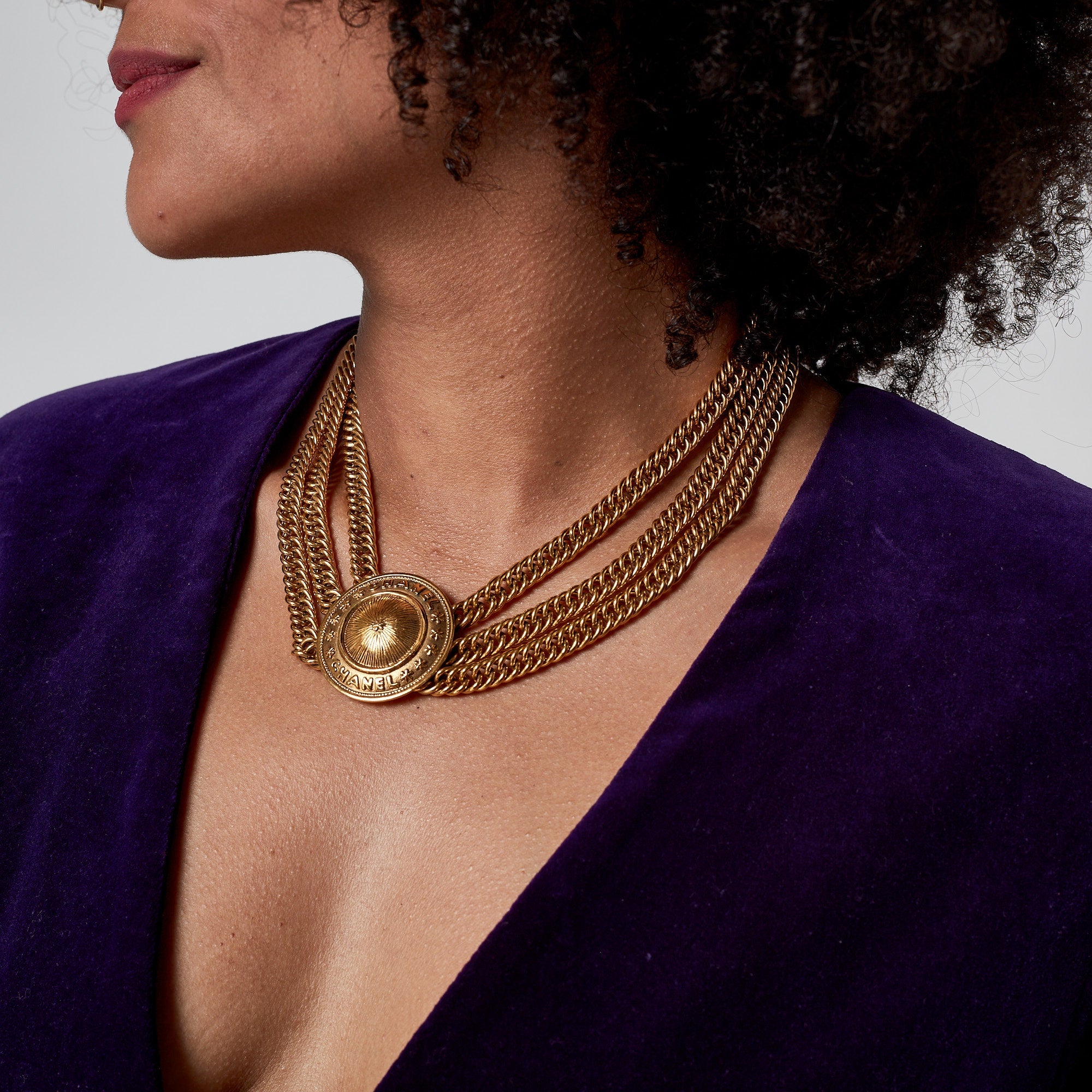 Classic Chanel 1980s gold curb chain triple strand choker necklace. The medallion is in the shape of a shield and the Chanel lettering is accompanied by 6-point stars. Marked to the reverse Chanel and the design number 3929. In excellent vintage condition; very minor rubbing to the gold chain on a handful of the links to the reverse. An additional oval cartouche is attached near the hook fastening and annotated Made in France.