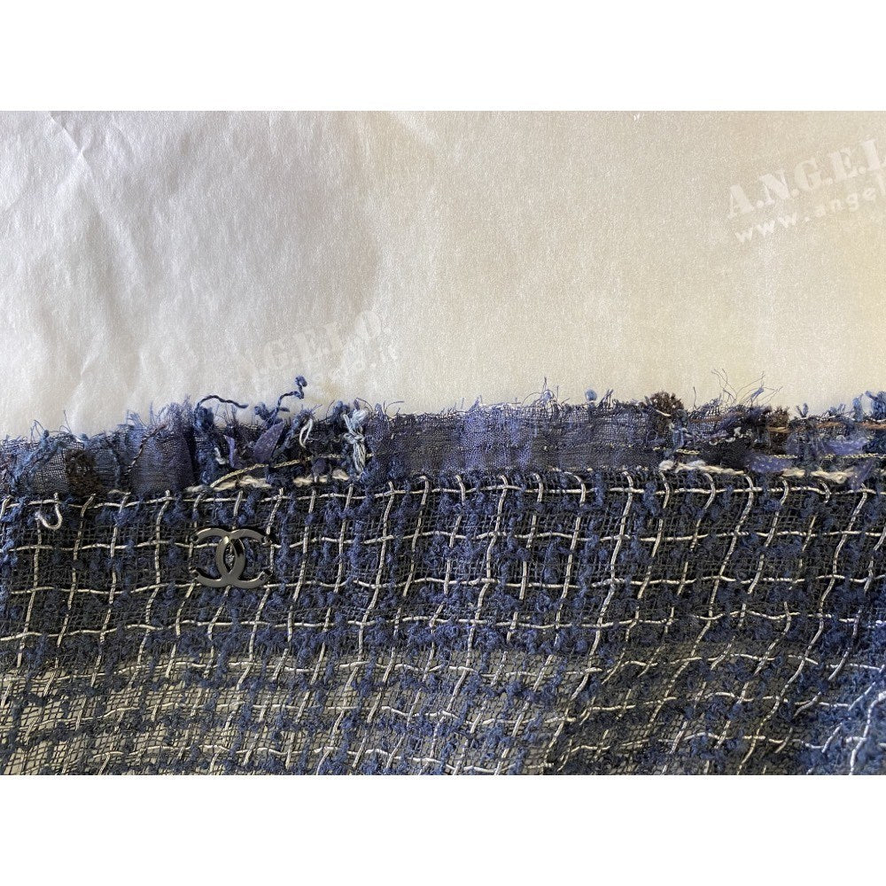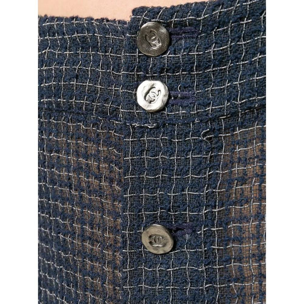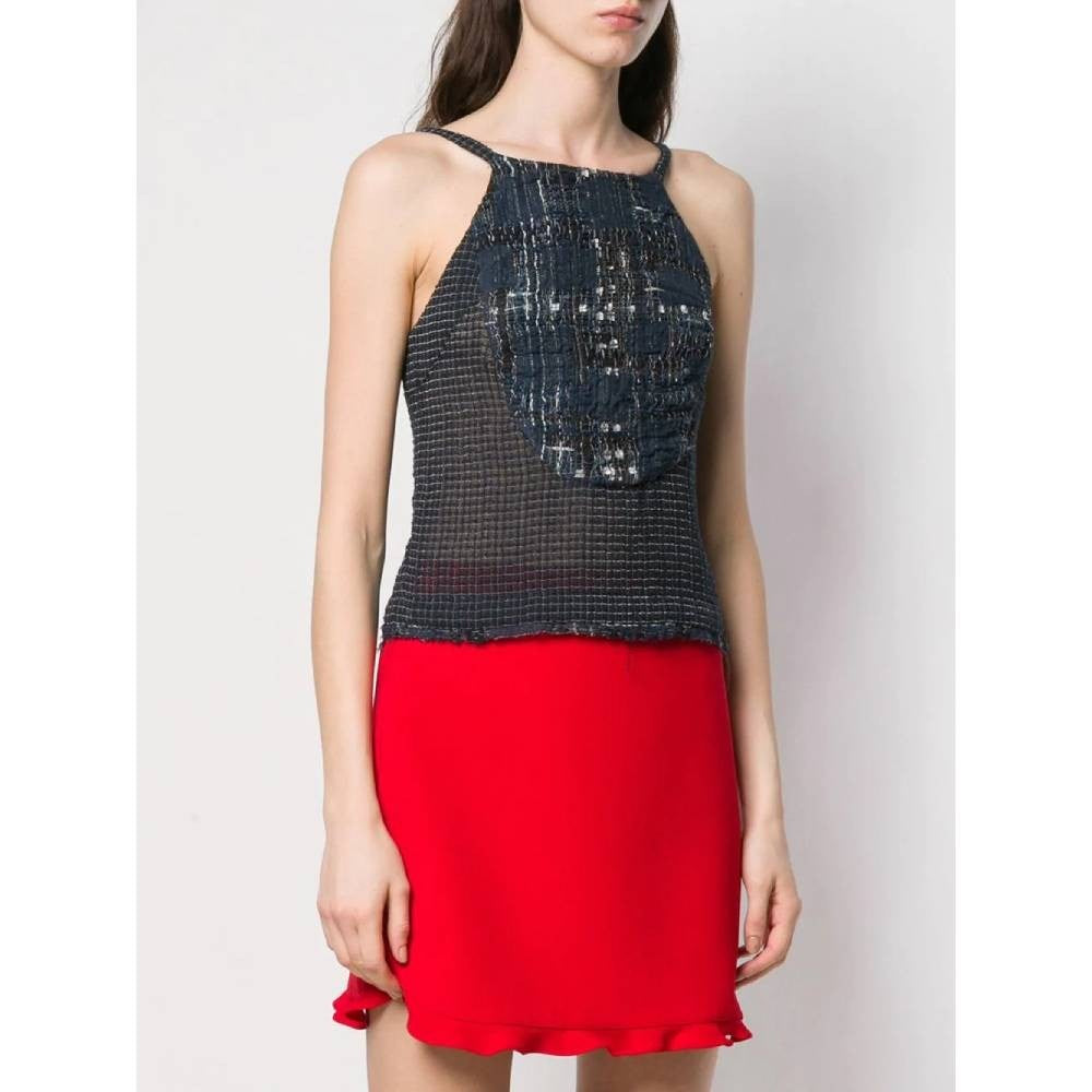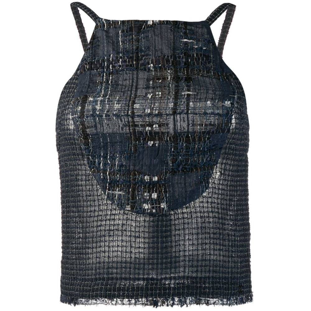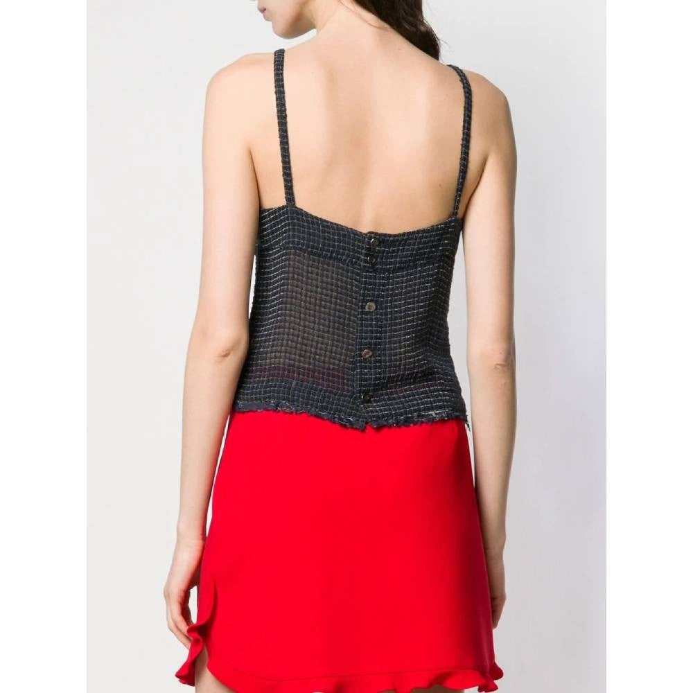 Chanel blue silk blend top with fine straps. Square neckline, back button closure, transparent effect and straight hem.